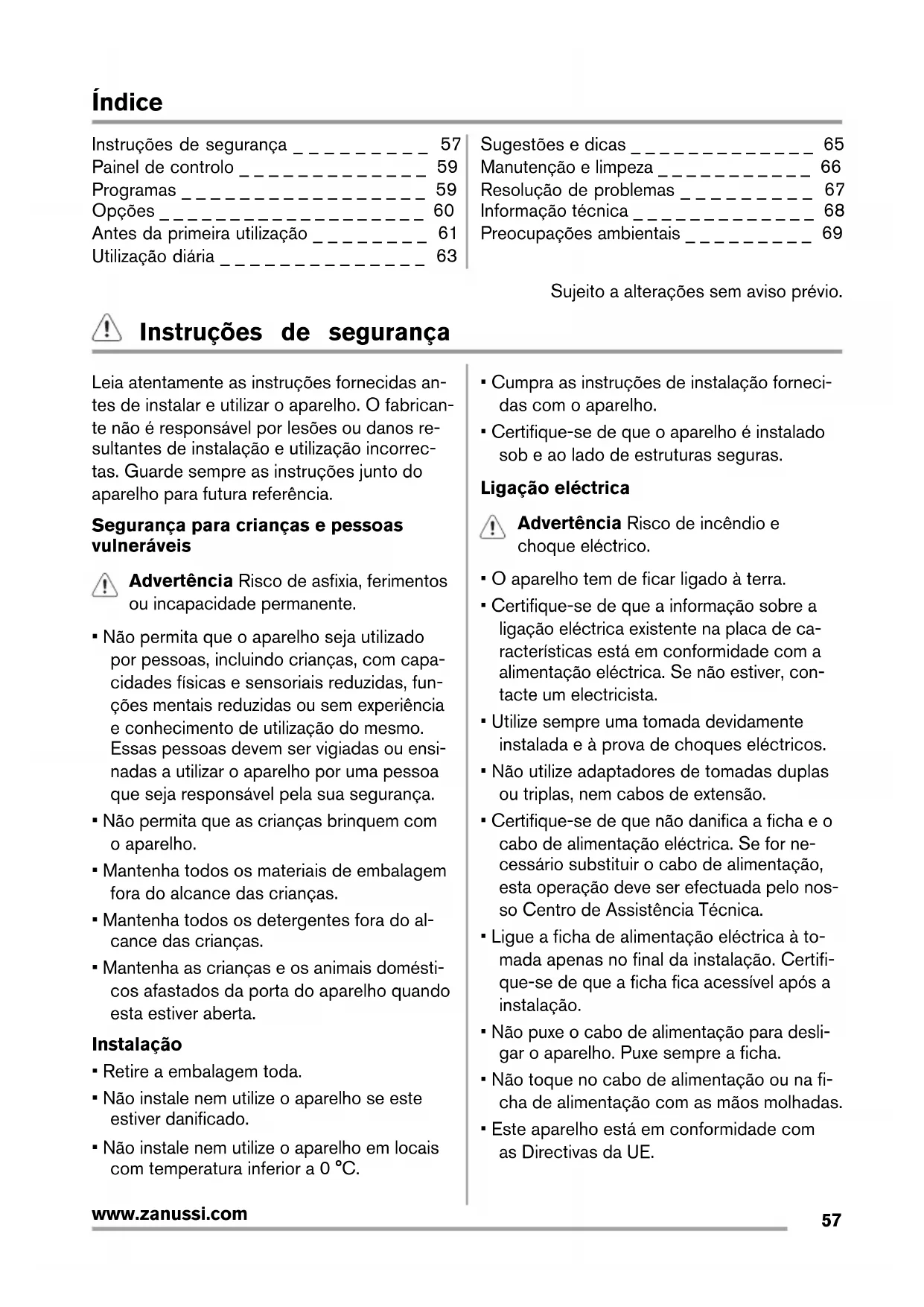 www.zanussi.comÍndice Instruções de segurança _ _ _ _ _ _ _ _ _ 57 Painel de controlo _ _ _ _ _ _ _ _ _ _ _ _ _ 59 Programas _ _ _ _ _ _ _ _ _ _ _ _ _ _ _ _ _ 59 Opções _ _ _ _ _ _ _ _ _ _ _ _ _ _ _ _ _ _ _ 60 Antes da primeira utilização _ _ _ _ _ _ _ _ 61 Utilização diária _ _ _ _ _ _ _ _ _ _ _ _ _ _ 63 Sugestões e dicas _ _ _ _ _ _ _ _ _ _ _ _ _ 65 Manutenção e limpeza _ _ _ _ _ _ _ _ _ _ _ 66 Resolução de problemas _ _ _ _ _ _ _ _ _ 67 Informação técnica _ _ _ _ _ _ _ _ _ _ _ _ _ 68 Preocupações ambientais _ _ _ _ _ _ _ _ _ 69 Sujeito a alterações sem aviso prévio. Instruções de segurança Leia atentamente as instruções fornecidas an- tes de instalar e utilizar o aparelho. O fabrican- te não é responsável por lesões ou danos re- sultantes de instalação e utilização incorrec- tas. Guarde sempre as instruções junto do aparelho para futura referência. Segurança para crianças e pessoas vulneráveis Advertência Risco de asfixia, ferimentos ou incapacidade permanente.