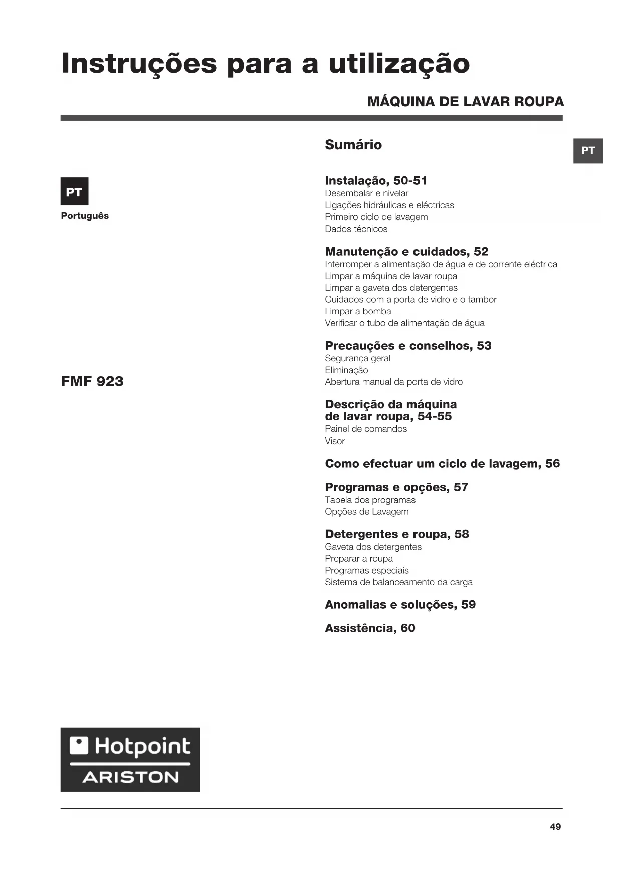 Sumário Instalação, 50-51 Desembalar e nivelar Ligações hidráulicas e eléctricas Primeiro ciclo de lavagem Dados técnicos Manutenção e cuidados, 52 Interromper a alimentação de água e de corrente eléctrica Limpar a máquina de lavar roupa Limpar a gaveta dos detergentes Cuidados com a porta de vidro e o tambor Limpar a bomba Verificar o tubo de alimentação de água Precauções e conselhos, 53 Segurança geral Eliminação Abertura manual da porta de vidro Descrição da máquina de lavar roupa, 54-55 Painel de comandos Visor Como efectuar um ciclo de lavagem, 56 Programas e opções, 57 Tabela dos programas Opções de Lavagem Detergentes e roupa, 58 Gaveta dos detergentes Preparar a roupa Programas especiais Sistema de balanceamento da carga Anomalias e soluções, 59 Assistência, 60 FMF 923 Instruções para a utilização50