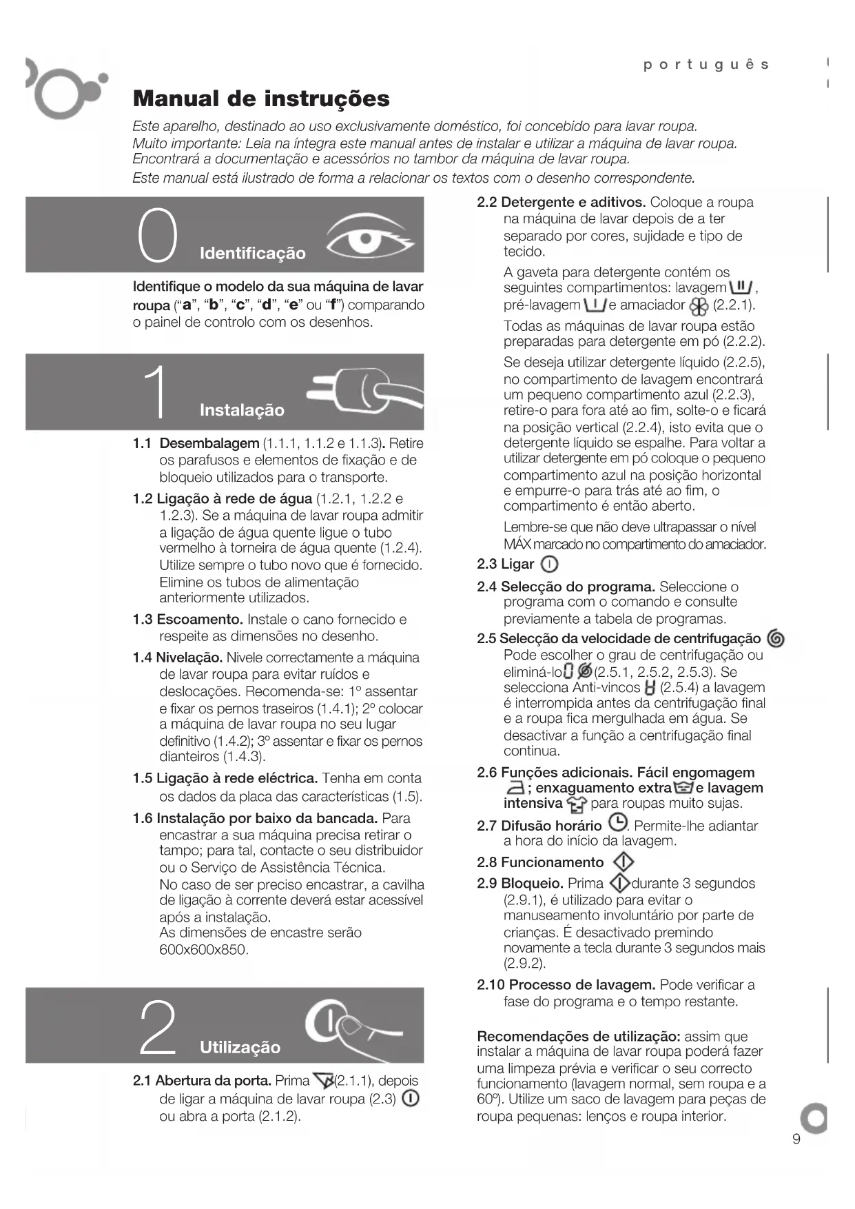 fase do programa e o tempo restante. Recomendações de utilização: assim que instalar a máquina de lavar roupa poderá fazer uma limpeza prévia e verificar o seu correcto funcionamento (lavagem normal, sem roupa e a 60º). Utilize um saco de lavagem para peças de roupa pequenas: lenços e roupa interior. Identificação Identifique o modelo da sua máquina de lavar roupa (“ a”, “b”, “c”, “d”, “e” ou “f”) comparando o painel de controlo com os desenhos. Este aparelho, destinado ao uso exclusivamente doméstico, foi concebido para lavar roupa. Muito importante: Leia na íntegra este manual antes de instalar e utilizar a máquina de lavar roupa. Encontrará a documentação e acessórios no tambor da máquina de lavar roupa. Este manual está ilustrado de forma a relacionar os textos com o desenho correspondente.