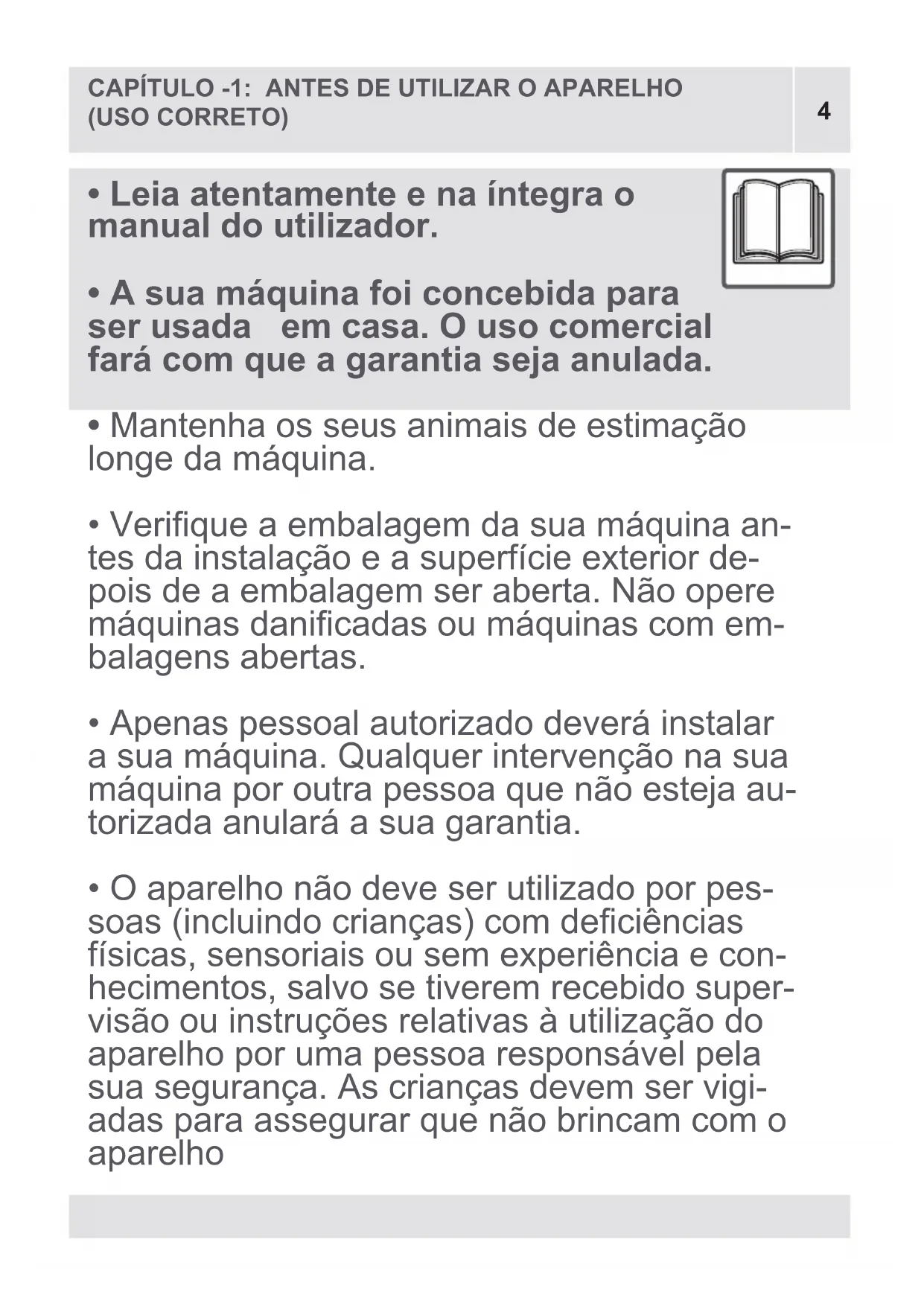 - Eliminação da sua máquina velha 7 7 ÍNDICE4 CAPÍTULO -1: ANTES DE UTILIZAR O APARELHO (USO CORRETO)