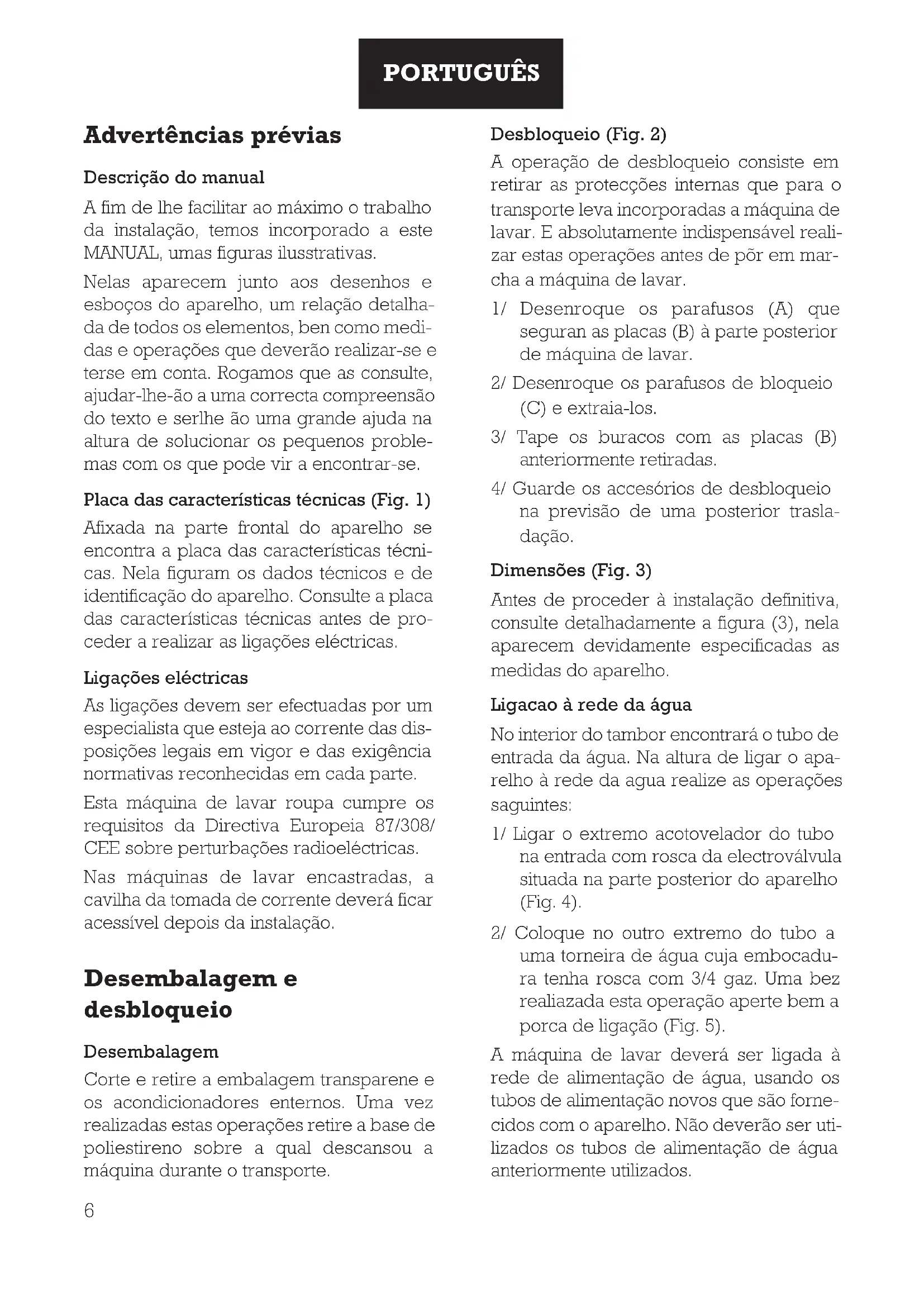 FRANÇAISAdvertências prévias Descrição do manual A fim de lhe facilitar ao máximo o trabalho da instalação, temos incorporado a este MANUAL, umas figuras ilusstrativas. Nelas aparecem junto aos desenhos e esboços do aparelho, um relação detalha- da de todos os elementos, ben como medi- das e operações que deverão realizar-se e terse em conta. Rogamos que as consulte, ajudar-lhe-ão a uma correcta compreensão do texto e serlhe ão uma grande ajuda na altura de solucionar os pequenos proble- mas com os que pode vir a encontrar-se. Placa das características técnicas (Fig. 1) Afixada na parte frontal do aparelho se encontra a placa das características técni- cas. Nela figuram os dados técnicos e de identificação do aparelho. Consulte a placa das características técnicas antes de pro- ceder a realizar as ligações eléctricas. Ligações eléctricas As ligações devem ser efectuadas por um especialista que esteja ao corrente das dis- posições legais em vigor e das exigência normativas reconhecidas em cada parte. Esta máquina de lavar roupa cumpre os requisitos da Directiva Europeia 87/308/ CEE sobre perturbações radioeléctricas. Nas máquinas de lavar encastradas, a cavilha da tomada de corrente deverá ficar acessível depois da instalação. Desembalagem e desbloqueio Desembalagem Corte e retire a embalagem transparene e os acondicionadores enternos. Uma vez realizadas estas operações retire a base de poliestireno sobre a qual descansou a máquina durante o transporte. Desbloqueio (Fig. 2) A operação de desbloqueio consiste em retirar as protecções internas que para o transporte leva incorporadas a máquina de lavar. E absolutamente indispensável reali- zar estas operações antes de põr em mar- cha a máquina de lavar. 1/ Desenroque os parafusos (A) que seguran as placas (B) à parte posterior de máquina de lavar. 2/ Desenroque os parafusos de bloqueio (C) e extraia-los. 3/ Tape os buracos com as placas (B) anteriormente retiradas. 4/ Guarde os accesórios de desbloqueio na previsão de uma posterior trasla- dação. Dimensões (Fig. 3) Antes de proceder à instalação definitiva, consulte detalhadamente a figura (3), nela aparecem devidamente especificadas as medidas do aparelho. Ligacao à rede da água No interior do tambor encontrará o tubo de entrada da água. Na altura de ligar o apa- relho à rede da agua realize as operações saguintes: 1/ Ligar o extremo acotovelador do tubo na entrada com rosca da electroválvula situada na parte posterior do aparelho (Fig. 4). 2/ Coloque no outro extremo do tubo a uma torneira de água cuja embocadu- ra tenha rosca com 3/4 gaz. Uma bez realiazada esta operação aperte bem a porca de ligação (Fig. 5). A máquina de lavar deverá ser ligada à rede de alimentação de água, usando os tubos de alimentação novos que são forne- cidos com o aparelho. Não deverão ser uti- lizados os tubos de alimentação de água anteriormente utilizados.