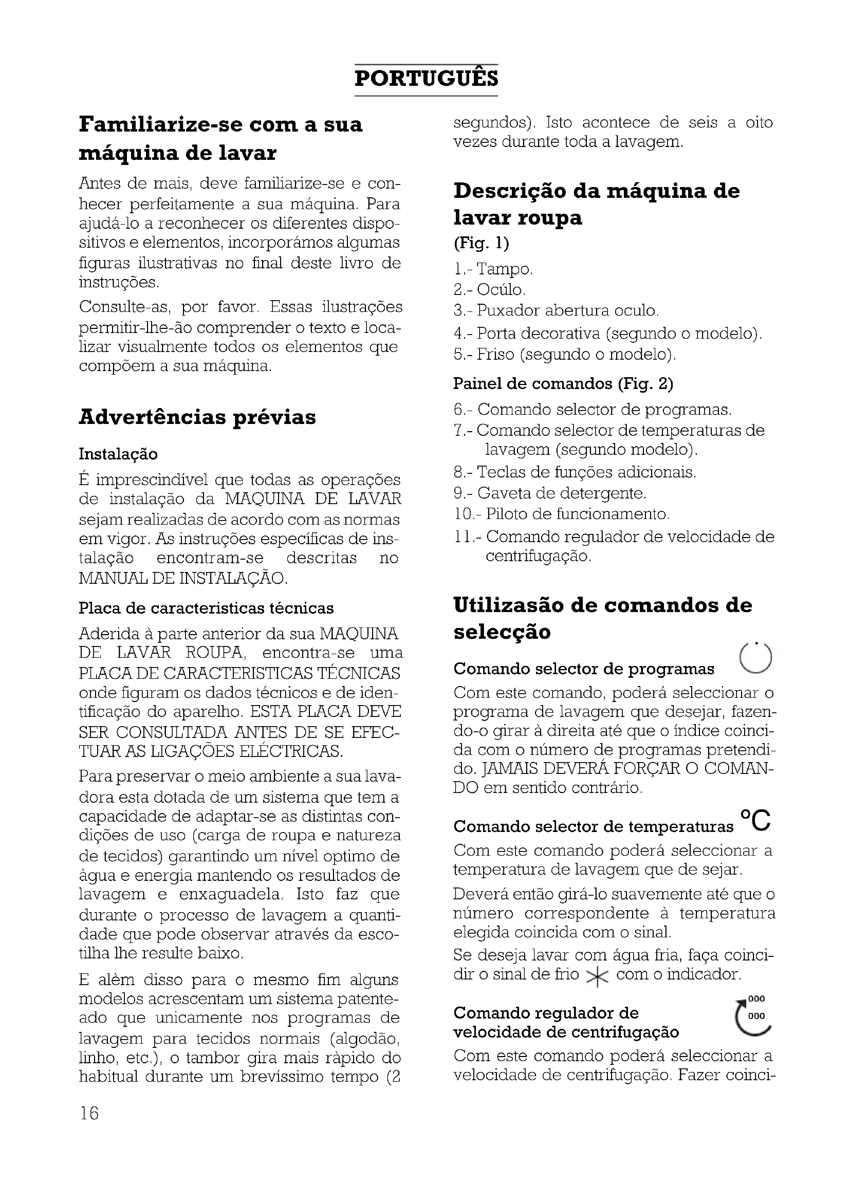 TUAR AS LIGAÇÕES ELÉCTRICAS. Para preservar o meio ambiente a sua lava- dora esta dotada de um sistema que tem a capacidade de adaptar-se as distintas con- dições de uso (carga de roupa e natureza de tecidos) garantindo um nível optimo de àgua e energia mantendo os resultados de lavagem e enxaguadela. Isto faz que durante o processo de lavagem a quanti- dade que pode observar através da esco- tilha lhe resulte baixo. E alèm disso para o mesmo fim alguns modelos acrescentam um sistema patente- ado que unicamente nos programas de lavagem para tecidos normais (algodão, linho, etc.), o tambor gira mais ràpido do habitual durante um brevíssimo tempo (2 segundos). Isto acontece de seis a oito vezes durante toda a lavagem. Descrição da máquina de lavar roupa (Fig. 1) 1.- Tampo. 2.- Ocúlo. 3.- Puxador abertura oculo. 4.- Porta decorativa (segundo o modelo). 5.- Friso (segundo o modelo). Painel de comandos (Fig. 2) 6.- Comando selector de programas. 7.- Comando selector de temperaturas de lavagem (segundo modelo). 8.- Teclas de funções adicionais. 9.- Gaveta de detergente. 10.- Piloto de funcionamento. 11.- Comando regulador de velocidade de centrifugação. Utilizasão de comandos de selecção Comando selector de programas Com este comando, poderá seleccionar o programa de lavagem que desejar, fazen- do-o girar à direita até que o índice coinci- da com o número de programas pretendi- do. JAMAIS DEVERÁ FORÇAR O COMAN- DO em sentido contrário. Comando selector de temperaturas Com este comando poderá seleccionar a temperatura de lavagem que de sejar. Deverá então girá-lo suavemente até que o número correspondente à temperatura elegida coincida com o sinal. Se deseja lavar com água fria, faça coinci- dir o sinal de frio com o indicador. Comando regulador de velocidade de centrifugação Com este comando poderá seleccionar a velocidade de centrifugação. Fazer coinci-