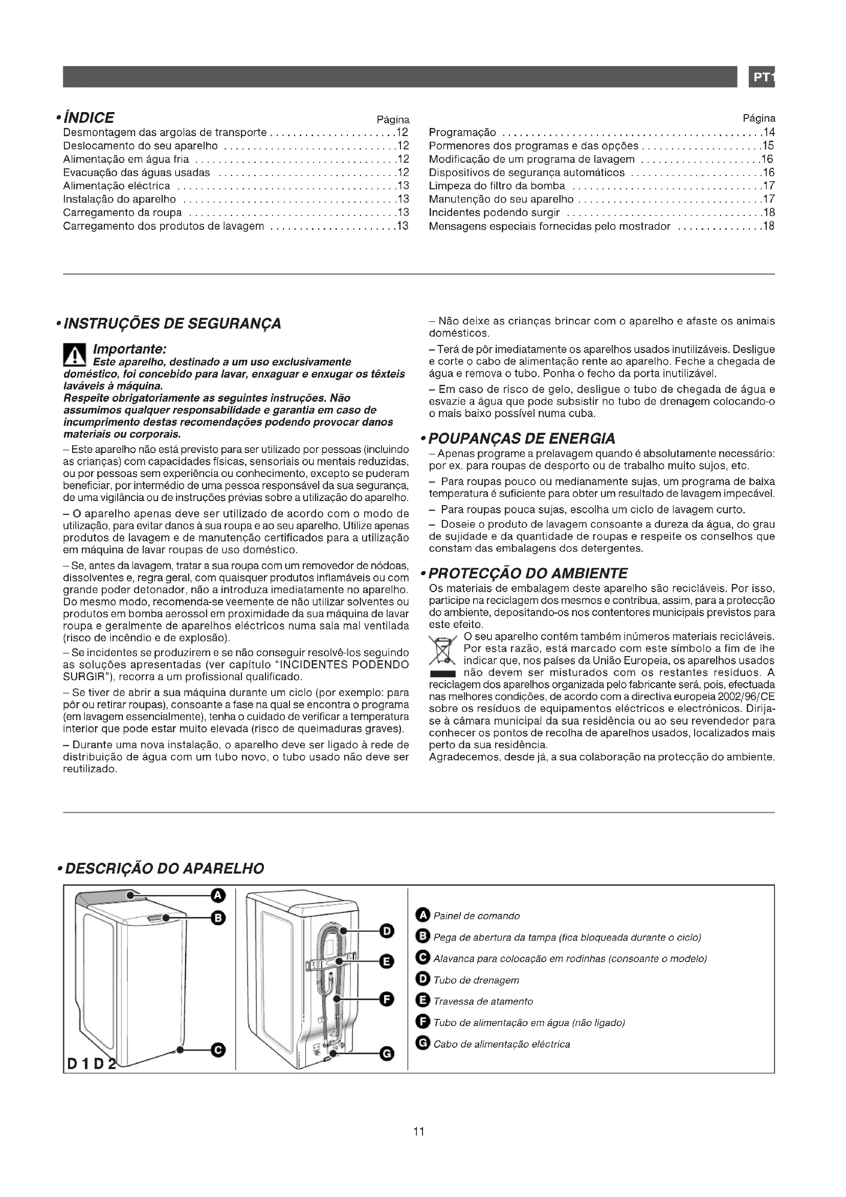 - INSTRUÇÕES DE SEGURANÇA Importante: Este aparelho, destinado a um uso exclusivamentedoméstico, foi concebido para lavar, enxaguar e enxugar os têxteislaváveis à máquina.Respeite obrigatoriamente as seguintes instruções. Nãoassumimos qualquer responsabilidade e garantia em caso deincumprimento destas recomendações podendo provocar danosmateriais ou corporais.— Este aparelho não está previsto para ser utilizado por pessoas (incluindoas crianças) com capacidades físicas, sensoriais ou mentais reduzidas,ou por pessoas sem experiência ou conhecimento, excepto se puderambeneficiar, por intermédio de uma pessoa responsável da sua segurança,de uma vigilância ou de instruções prévias sobre a utilização do aparelho.— O aparelho apenas deve ser utilizado de acordo com o modo deutilização, para evitar danos à sua roupa e ao seu aparelho. Utilize apenasprodutos de lavagem e de manutenção certificados para a utilizaçãoem máquina de lavar roupas de uso doméstico.— Se, antes da lavagem, tratar a sua roupa com um removedor de nódoas,dissolventes e, regra geral, com quaisquer produtos inflamáveis ou comgrande poder detonador, não a introduza imediatamente no aparelho.Do mesmo modo, recomenda-se veemente de não utilizar solventes ouprodutos em bomba aerossol em proximidade da sua máquina de lavarroupa e geralmente de aparelhos eléctricos numa sala mal ventilada(risco de incêndio e de explosão).— Se incidentes se produzirem e se não conseguir resolvê-los seguindoas soluções apresentadas (ver capítulo “INCIDENTES PODENDOSURGIR”), recorra a um profissional qualificado.— Se tiver de abrir a sua máquina durante um ciclo (por exemplo: parapôr ou retirar roupas), consoante a fase na qual se encontra o programa(em lavagem essencialmente), tenha o cuidado de verificar a temperaturainterior que pode estar muito elevada (risco de queimaduras graves).— Durante uma nova instalação, o aparelho deve ser ligado à rede dedistribuição de água com um tubo novo, o tubo usado não deve serreutilizado.— Não deixe as crianças brincar com o aparelho e afaste os animaisdomésticos.— Terá de pôr imediatamente os aparelhos usados inutilizáveis. Desliguee corte o cabo de alimentação rente ao aparelho. Feche a chegada deágua e remova o tubo. Ponha o fecho da porta inutilizável.— Em caso de risco de gelo, desligue o tubo de chegada de água eesvazie a água que pode subsistir no tubo de drenagem colocando-oo mais baixo possível numa cuba.