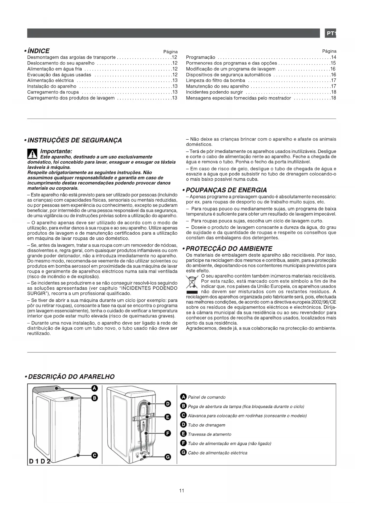 - Manter as performances da máquina de lavar roupa (Manutenção do filtro de bomba): Tem de limpar regularmente o filtro da bomba de esvaziamento (ver forma como proceder no capítulo “LIMPEZA DO FILTRO DA BOMBA”). Importante: Se não limpar regularmente o filtro da bomba, as performances da máquina podem ficar afectadasPara escolher o programa mais adaptado à natureza da roupa, siga as indicações das etiquetas da maioria dos têxteis.