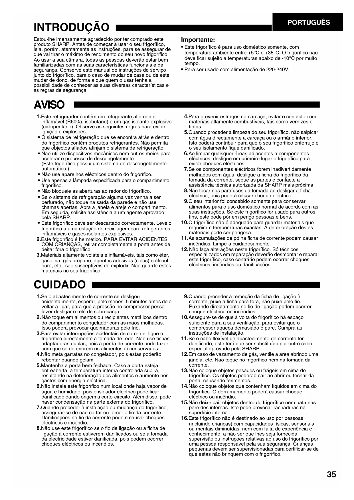 - Este frigorífico é para uso doméstico somente, com temperatura ambiente entre +5°C e +38°C. O frigorífico não deve ficar sujeito a temperaturas abaixo de -10°C por muito tempo.• Para ser usado com alimentação de 220-240V. AVISO 1.Este refrigerador contém um refrigerante altamente inflamável (R600a: isobutano) e um gás isolante explosivo (ciclopentano). Observe as seguintes regras para evitar ignição e explosões. • O sistema de refrigeração que se encontra atrás e dentro do frigorífico contém produtos refrigerantes. Não permita que objectos afiados atinjam o sistema de refrigeração. • Não utilize dispositivos mecânicos nem outros meios para acelerar o processo de descongelamento. (Este frigorífico possui um sistema de descongelamento automático.) • Não use aparelhos eléctricos dentro do frigorífico. • Use apenas a lâmpada especificada para o compartimento frigorífico. • Não bloqueie as aberturas ao redor do frigorífico. • Se o sistema de refrigeração alguma vez venha a ser perfurado, não toque na saída da parede e não use chamas abertas. Abra a janela e areje o compartimento. Em seguida, solicite assistência a um agente aprovado pela SHARP. • Este frigorífico deve ser descartado correctamente. Leve o frigorífico a uma estação de reciclagem para refrigerantes inflamáveis e gases isolantes explosivos. 2.Este frigorífico é hermético. PARA EVITAR ACIDENTES COM CRIANÇAS, retirar completamente a porta antes de deitar fora o frigorífico. 3.Materiais altamente voláteis e inflamáveis, tais como éter, gasolina, gás propano, agentes adesivos (colas) e álcool puro, etc., são susceptíveis de explodir. Não guarde estes materiais no seu frigorífico. 4.Para prevenir estragos na carcaça, evitar o contacto com materiais altamente combustíveis, tais como vernizes e tintas. 5.Quando proceder à limpeza do seu frigorífico, não salpicar com água directamente a carcaça ou o armário interior. Isto poderá contribuir para que o seu frigorífico enferruje e o seu isolamento fique danificado. 6.Ao limpar quaisquer áreas adjacentes a componentes eléctricos, desligue em primeiro lugar o frigorífico para evitar choques eléctricos. 7.Se os componentes eléctricos forem inadivertidamente molhados com água, desligue a ficha do frigorífico da tomada da corrente, seque as partes e contacte a assistência técnica autorizada da SHARP mais próxima. 8.Não tocar nos parafusos da tomada ao desligar a ficha eléctrica, pois poderá causar choque eléctrico. 9.O seu interior foi concebido somente para conservar alimentos para o uso doméstico normal de acordo com as suas instruções. Se este frigorífico for usado para outros fins, este pode pôr em perigo pessoas e bens.10.O frigorífico não é adequado para guardar materiais que requeiram temperaturas exactas. A deterioração destes materiais pode ser perigosa.11.As acumulações de pó na ficha de corrente podem causar incêndios. Limpe-a cuidadosamente. 12.Não faça alterações neste frigorífico. Só técnicos especializados em reparação deverão desmontar e reparar este frigorífico, caso contrário podem ocorrer choques eléctricos, incêndios ou danificações. CUIDADO 1.Se o abastecimento de corrente se desligou acidentalmente, esperar, pelo menos, 5 minutos antes de o voltar a ligar, para que a pressão no compressor possa fazer desligar o relé de sobrecarga. 2.Não toque em alimentos ou recipientes metálicos dentro do compartimento congelador com as mãos molhadas. Isso poderá provocar queimaduras pelo frio. 3.Para evitar interrupções acidentais de corrente, ligue o frigorífico directamente à tomada de rede. Não use fichas adaptadoras duplas, pois a perda de corrente pode fazer com que se deteriorem os alimentos aí conservados. 4.Não meta garrafas no congelador, pois estas poderão rebentar quando gelam. 5.Mantenha a porta bem fechada. Caso a porta esteja entreaberta, a temperatura interna controlada subirá, resultando na deterioração dos alimentos e aumento nos gastos com energia eléctrica. 6.Não instale este frigorífico num local onde haja vapor de água e humidade, pois o isolador eléctrico pode ficar danificado dando origem a curto-circuito. Além disso, pode haver condensação na parte externa do frigorífico. 7.Quando proceder à instalação ou mudança do frigorífico, assegurar-se de não cortar ou torcer o fio da corrente. Danificações no fio da corrente podem causar choques eléctricos e incêndio. 8.Não use este frigorífico se o fio de ligação ou a ficha de ligação à corrente estiverem danificados ou se a tomada da electricidade estiver danificada, pois podem ocorrer choques eléctricos ou incêndios. 9.Quando proceder à remoção da ficha de ligação à corrente, puxe a ficha para fora, não puxe pelo fio. Puxando directamente no fio de ligação podem ocorrer choque eléctrico ou incêndios.10.Assegure-se de que à volta do frigorífico há espaço suficiente para a sua ventilação, para evitar que o compressor aqueça demasiado e páre. Cumpra as instruções de instalação.11.Se o cabo flexível de abastecimento de corrente for danificado, este terá que ser substituído por outro cabo especial aprovado pela SHARP.12.Em caso de vazamento de gás, ventile a área abrindo uma janela, etc. Não toque no frigorífico nem na tomada da corrente.13.Não coloque objetos pesados ou frágeis em cima do frigorífico. Os objetos poderão cair ao abrir ou fechar da porta, causando ferimentos.14.Não coloque objetos que contenham líquidos em cima do frigorífico. O derramamento poderá causar choque eléctrico ou incêndio.15.Não deixe cair objetos dentro do frigorífico nem bata nas pare des internas. Isto pode provocar rachaduras na superfície interna.16.Este frigorífico não é destinado ao uso por pessoas (incluindo crianças) com capacidades físicas, sensoriais ou mentais diminuídas, nem com falta de experiência e conhecimento