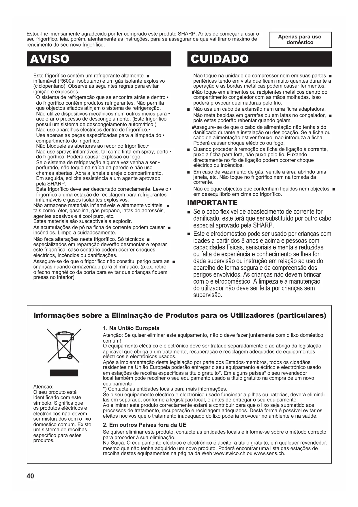 Este eletrodoméstico pode ser usado por crianças com idades a partir dos 8 anos e acima e pessoas com capacidades físicas, sensoriais e mentais reduzidas ou falta de experiência e conhecimento se lhes for dada supervisão ou instrução em relação ao uso do aparelho de forma segura e da compreensão dos perigos envolvidos. As crianças não devem brincar com o eletrodoméstico. A limpeza e a manutenção do utilizador não deve ser feita por crianças sem supervisão. Informações sobre a Eliminação de Produtos para os Utilizadores (particulares)