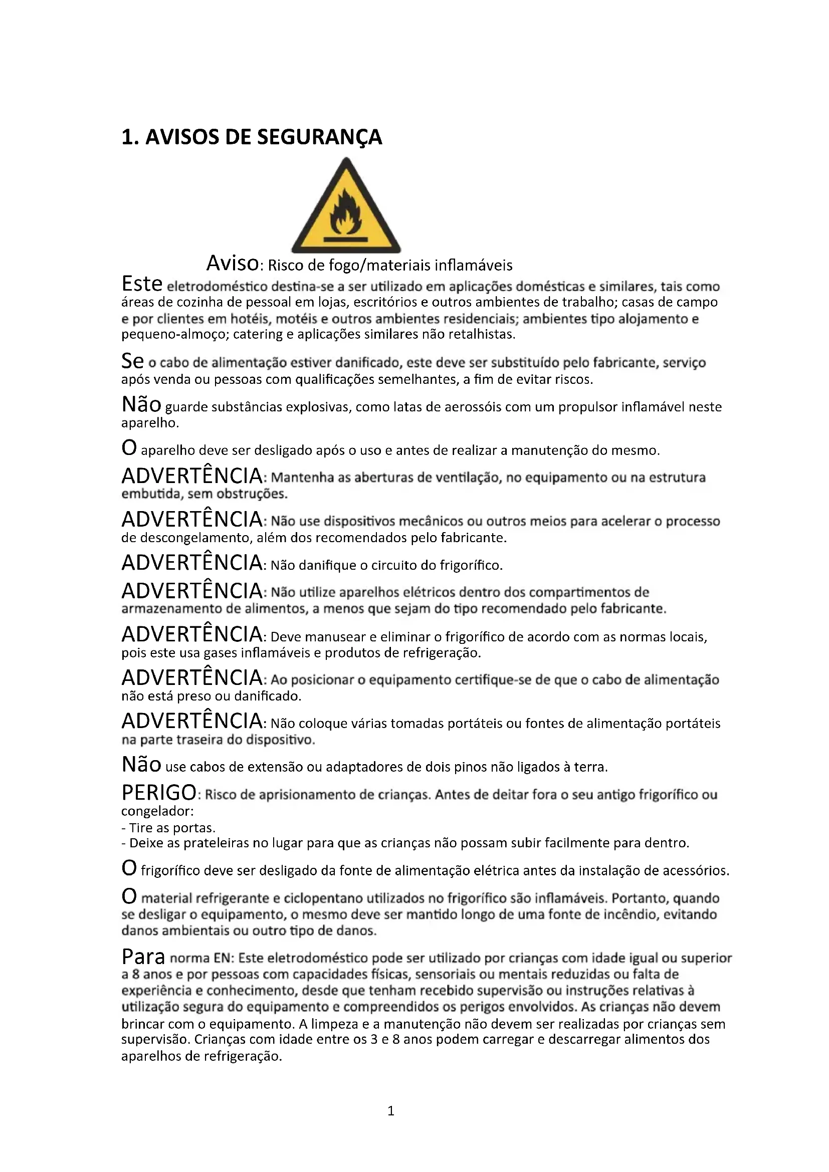 9. RECICLAGEM .................................................................................................................... 141. AVISOS DE SEGURANÇA Aviso: Risco de fogo/materiais inflamáveis Este áreas de cozinha de pessoal em lojas, escritórios e outros ambientes de trabalho; casas de campo pequeno-almoço; catering e aplicações similares não retalhistas.