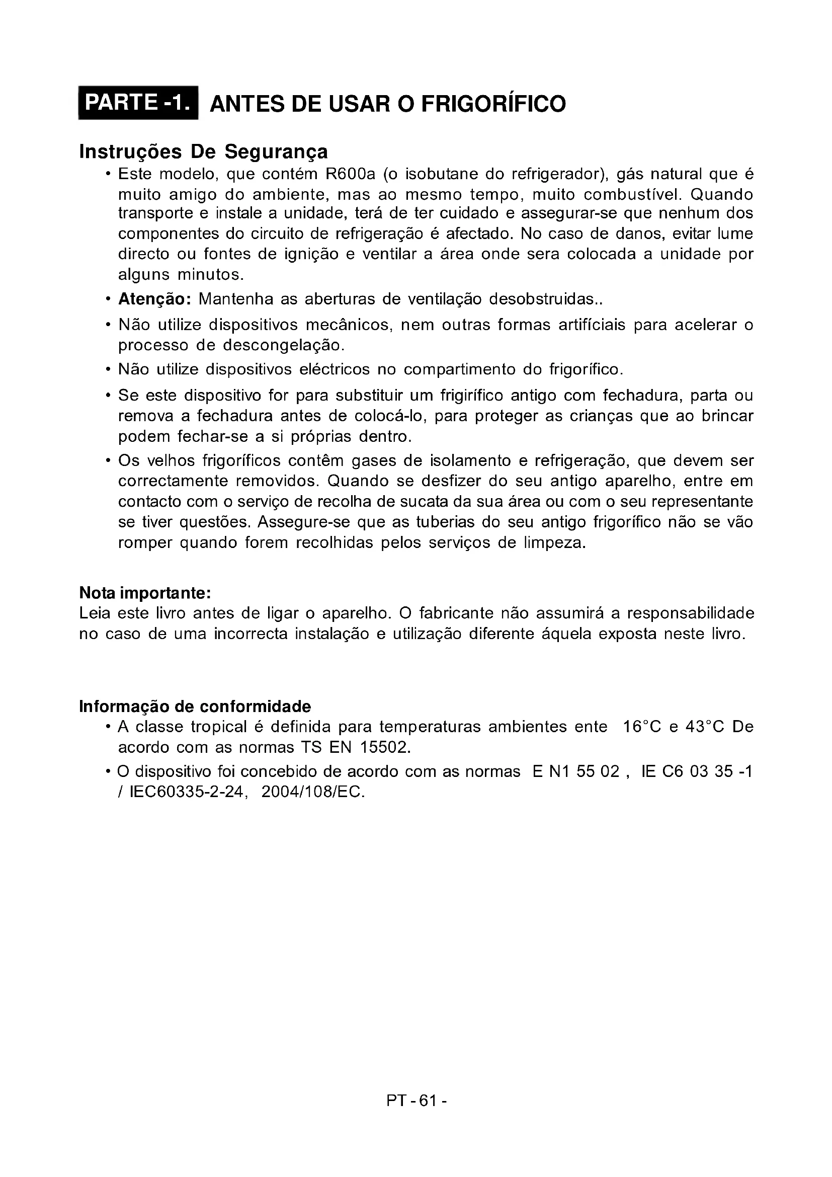 - O dispositivo foi concebido de acordo com as normas E N1 55 02 , IE C6 03 35 -1 / IEC60335-2-24, 2004/108/EC. PDF created with pdfFactory Pro trial version www.pdffactory.comPT - 62 - Recomendações Aviso: Não use dispositivos mecânicos ou outros meios artificiais para acelerar o processo de descongelação. Não use aparelhos eléctricos na gaveta de alimentos do equipamento. Mantenha os orifícios de ventilação do equipamento desobstruídos. Não danifique o circuito de refrigeração do frigorífico.