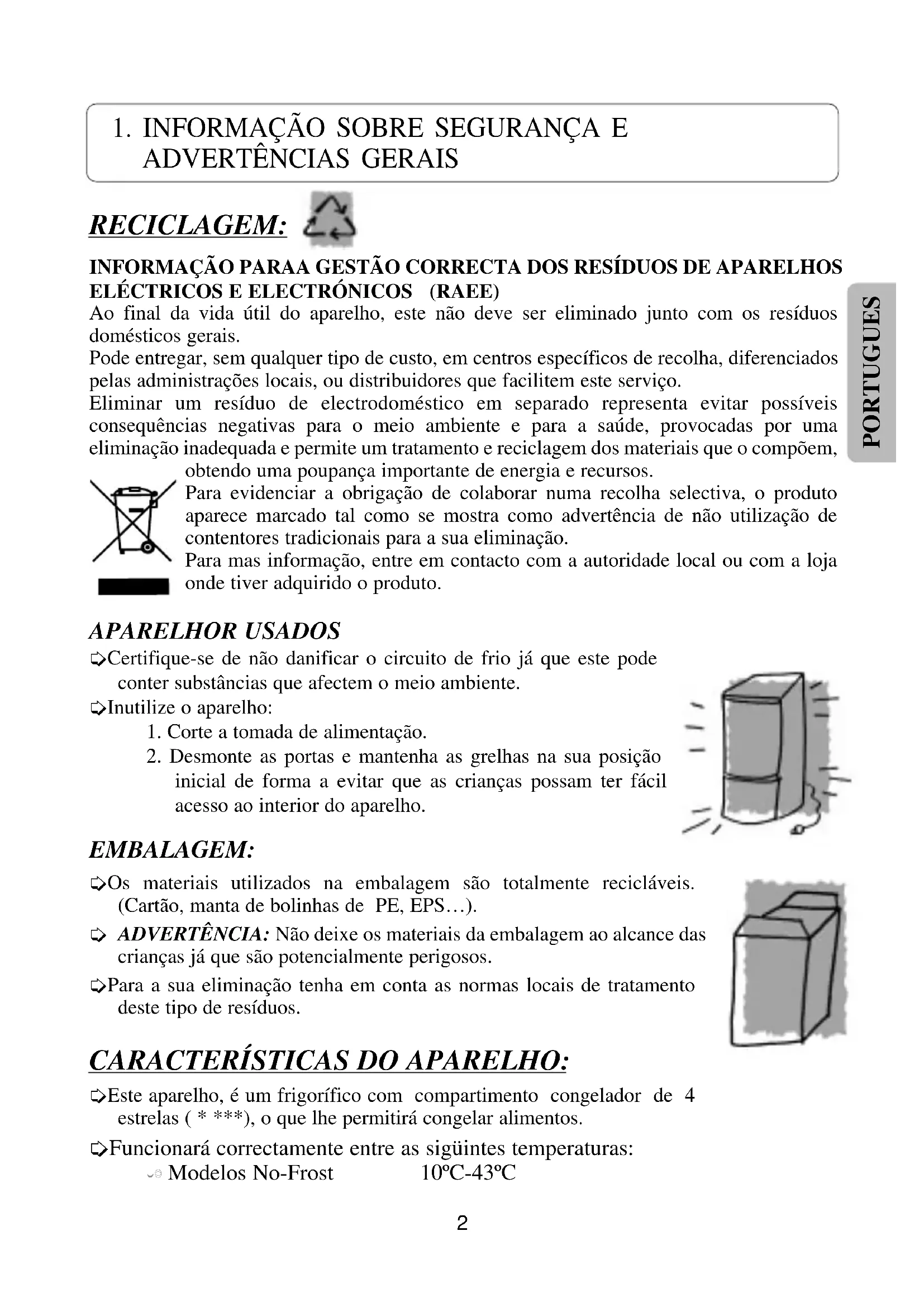 inicial de forma a evitar que as crianças possam ter fácil acesso ao interior do aparelho. EMBALAGEM: ➭ Os materiais utilizados na embalagem são totalmente recicláveis. (Cartão, manta de bolinhas de PE, EPS…). ➭ ADVERTÊNCIA: Não deixe os materiais da embalagem ao alcance das crianças já que são potencialmente perigosos. ➭ Para a sua eliminação tenha em conta as normas locais de tratamento deste tipo de resíduos. CARACTERÍSTICAS DO APARELHO: ➭ Este aparelho, é um frigorífico com compartimento congelador de 4 estrelas ( * ***), o que lhe permitirá congelar alimentos. ➭ Funcionará correctamente entre as sigüintes temperaturas:
