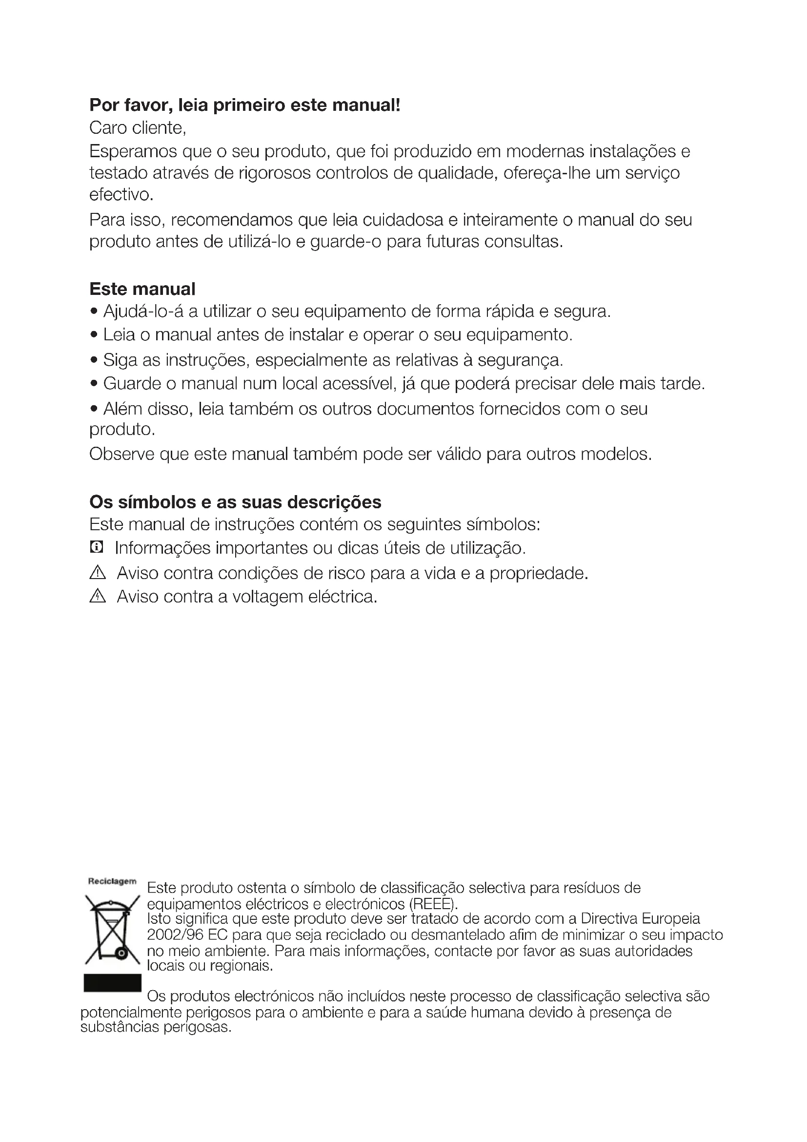 - Além disso, leia também os outros documentos fornecidos com o seu produto. Observe que este manual também pode ser válido para outros modelos. Os símbolos e as suas descrições Este manual de instruções contém os seguintes símbolos: C Informações importantes ou dicas úteis de utilização. A Aviso contra condições de risco para a vida e a propriedade. B Aviso contra a voltagem eléctrica. Este produto ostenta o símbolo de classificação selectiva para resíduos de equipamentos eléctricos e electrónicos (REEE). Isto significa que este produto deve ser tratado de acordo com a Directiva Europeia 2002/96 EC para que seja reciclado ou desmantelado afim de minimizar o seu impacto no meio ambiente. Para mais informações, contacte por favor as suas autoridades locais ou regionais. Os produtos electrónicos não incluídos neste processo de classificação selectiva são potencialmente perigosos para o ambiente e para a saúde humana devido à presença de substâncias perigosas.PT
