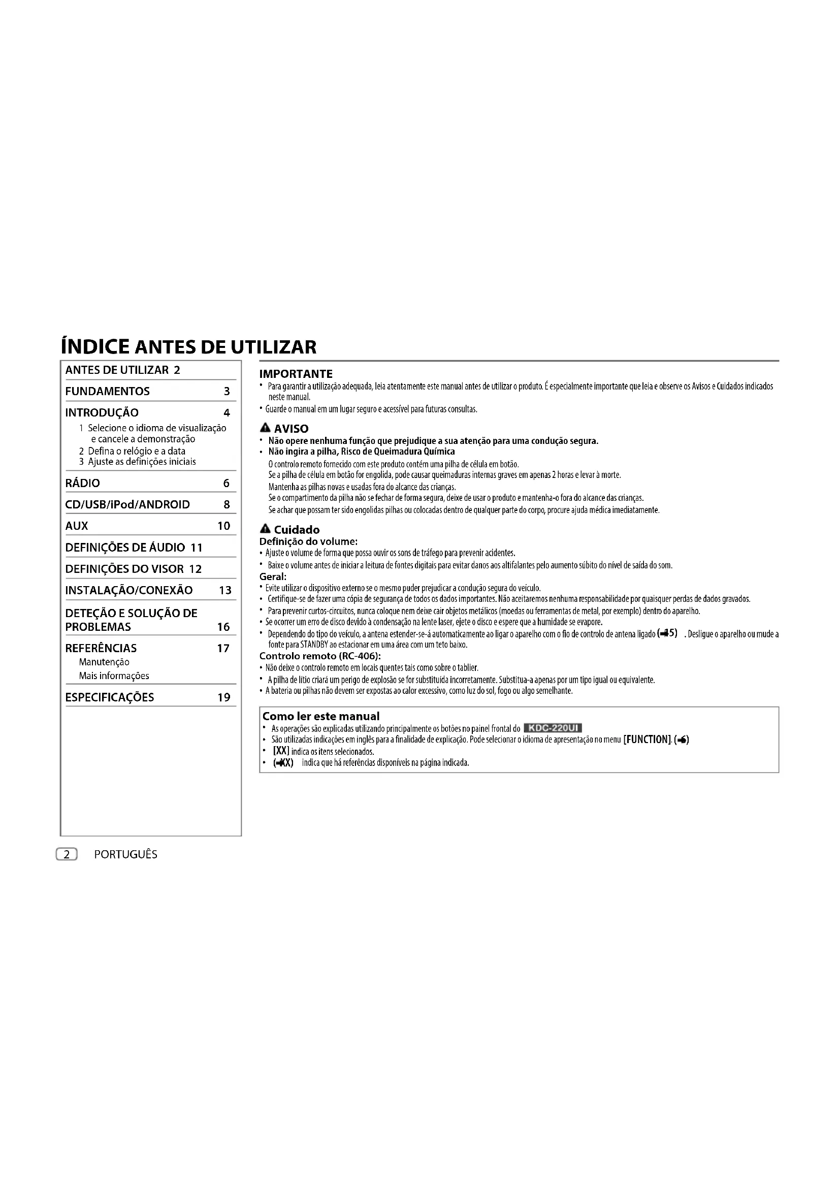 FUNDAMENTOS Controlo remoto (RC-406) (fornecido para ) Retire a folha de isolamento antes utilizar pela primeira vez.Sensor remoto(Não exponha à luz brilhante do sol.) / / / / : As funções do telecomando não estão disponíveis. Como substituir a pilha Para No telecomando Ligar a correnteMantenha SRC premido para desligar a corrente.( Premir SRC não liga a corrente. )Ajustar o volumePrima ou . Mantenha premido para aumentar continuamente o volume para 15.Prima AT T durante a leitura para atenuar o som. Prima de novo para cancelar.Selecione uma fontePrima SRC repetidamente. PORTUGUÊS JS_KWD_KDC_220UI_EN_PT.indd 4JS_KWD_KDC_220UI_EN_PT.indd 4 11/7/2017 11:09:16 AM11/7/2017 11:09:16 AMPORTUGUÊS