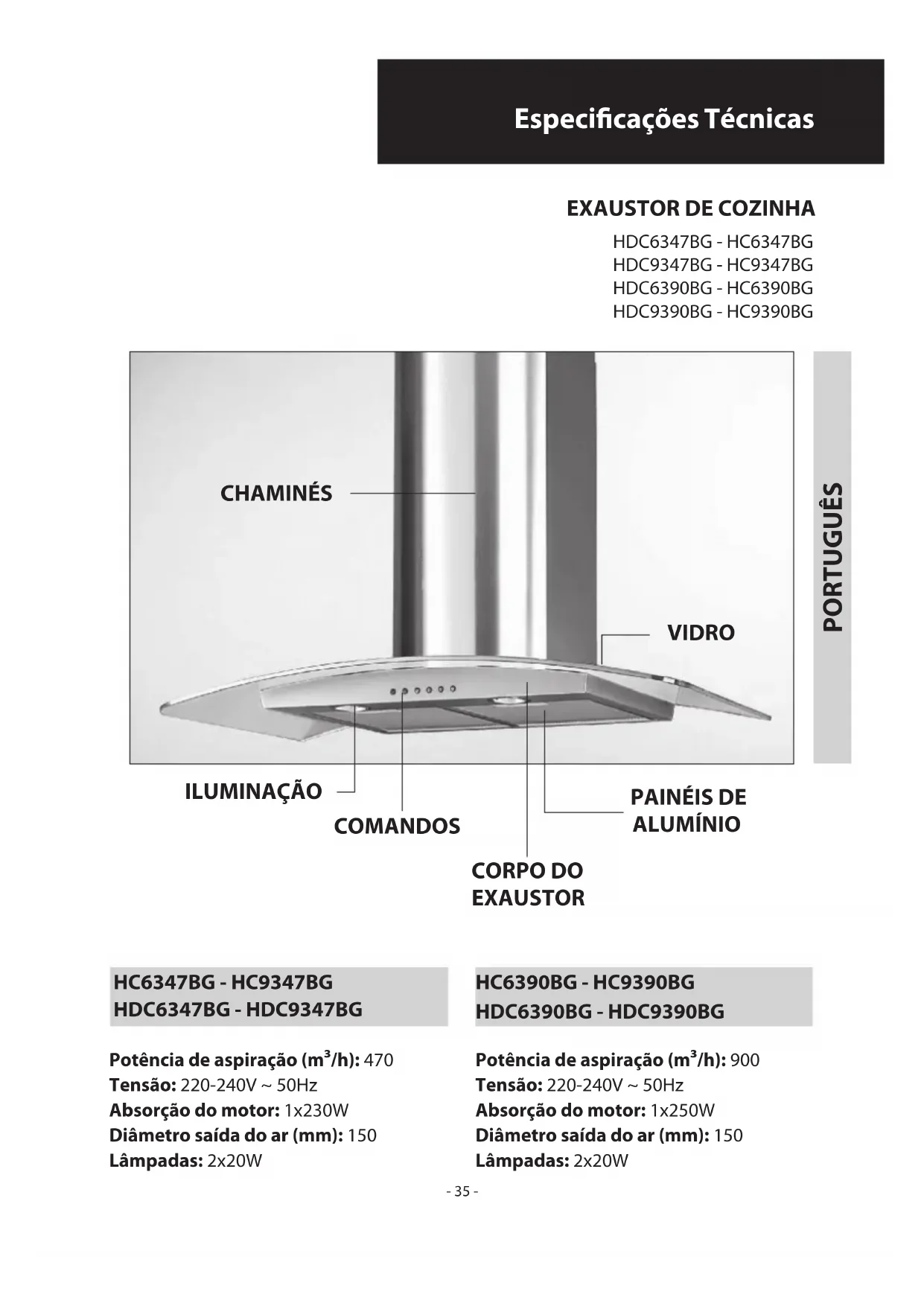 PORTUGUÊS Potência de aspiração (m³/h): 470 Tensão: 220-240V ~ 50Hz Absorção do motor: 1x230W Diâmetro saída do ar (mm): 150 Lâmpadas: 2x20W CHAMINÉS CORPO DO EXAUSTOR COMANDOS