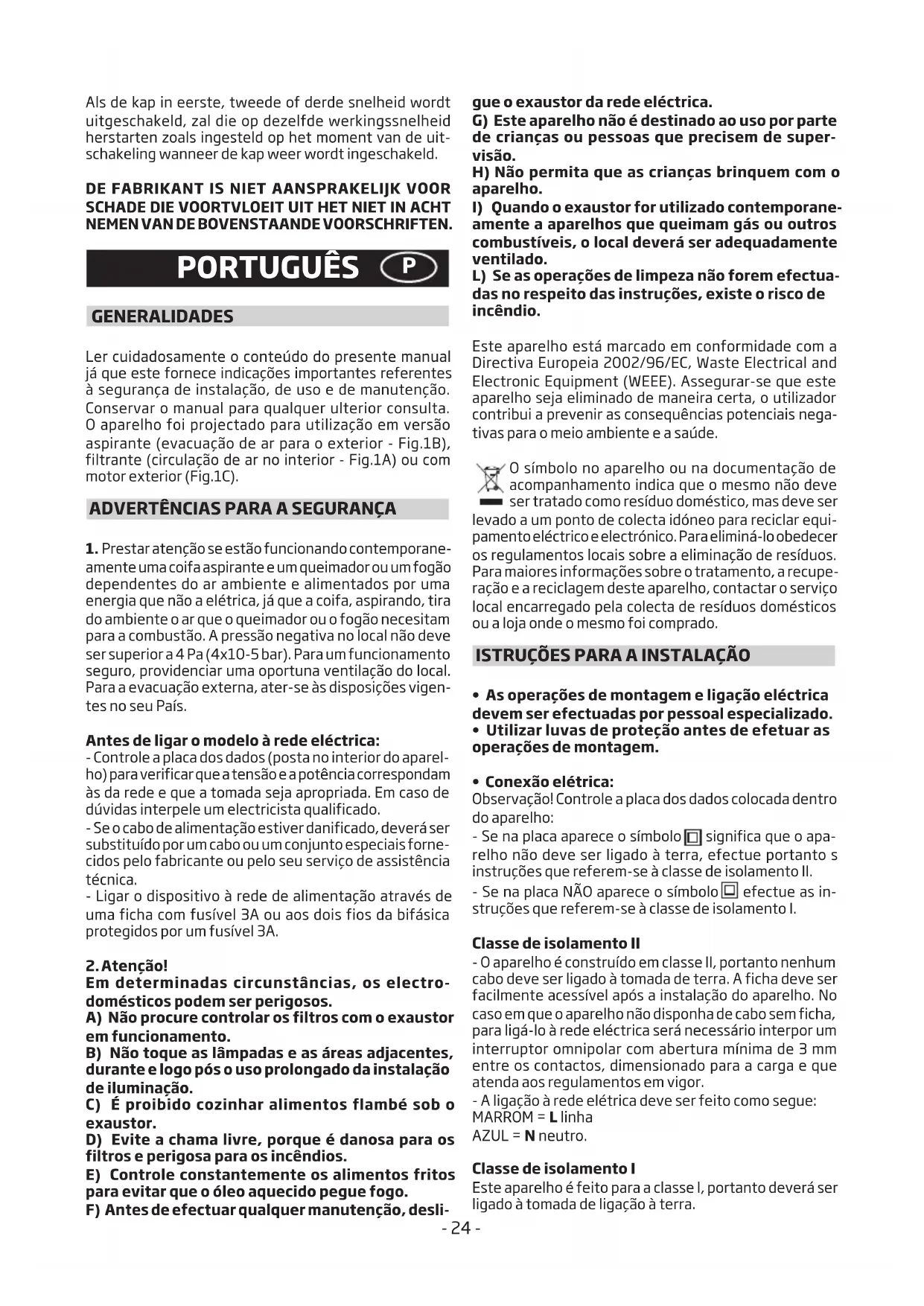 - Conexãoelétrica: Observação! Controle a placa dos dados colocada dentro do aparelho: - Se na placa aparece o símbolo significa que o apa- relho não deve ser ligado à terra, efectue portanto s instruções que referem-se à classe de isolamento II. - Se na placa NÃO aparece o símbolo efectue as in- struções que referem-se à classe de isolamento I. Classe de isolamento II - O aparelho é construído em classe II, portanto nenhum cabo deve ser ligado à tomada de terra. A ficha deve ser facilmente acessível após a instalação do aparelho. No caso em que o aparelho não disponha de cabo sem ficha, para ligá-lo à rede eléctrica será necessário interpor um interruptor omnipolar com abertura mínima de 3 mm entre os contactos, dimensionado para a carga e que atenda aos regulamentos em vigor. - A ligação à rede elétrica deve ser feito como segue: MARROM = L linha AZUL = N neutro. Classe de isolamento I Este aparelho é feito para a classe I, portanto deverá ser ligado à tomada de ligação à terra.- 25 - - A ligação à rede eléctrica deverá ser realizada da se- guinte maneira: MARROM = L linha AZUL = N neutro AMARELO/VERDE = terra. O cabo neutro deverá ser ligado ao borne com o símbolo N, enquanto que o cabo AMARELO/VERDE, deverá ser ligado ao borne perto do símbolo de terra . Na realização da ligação eléctrica assegurar-se que a to- mada eléctrica seja dotada de uma ligação à terra. Depois de ter montado o exaustor, tomar cuidado para a posição da ficha eléctrica ser de fácil acesso. No caso de ligação directa à rede eléctrica, é necessário, entre o aparelho e a rede, interpor um interruptor omnipolar com abertura mínima de 3 mm. entre os contactos, dimensionado para a carga e que atenda aos regulamentos em vigor.