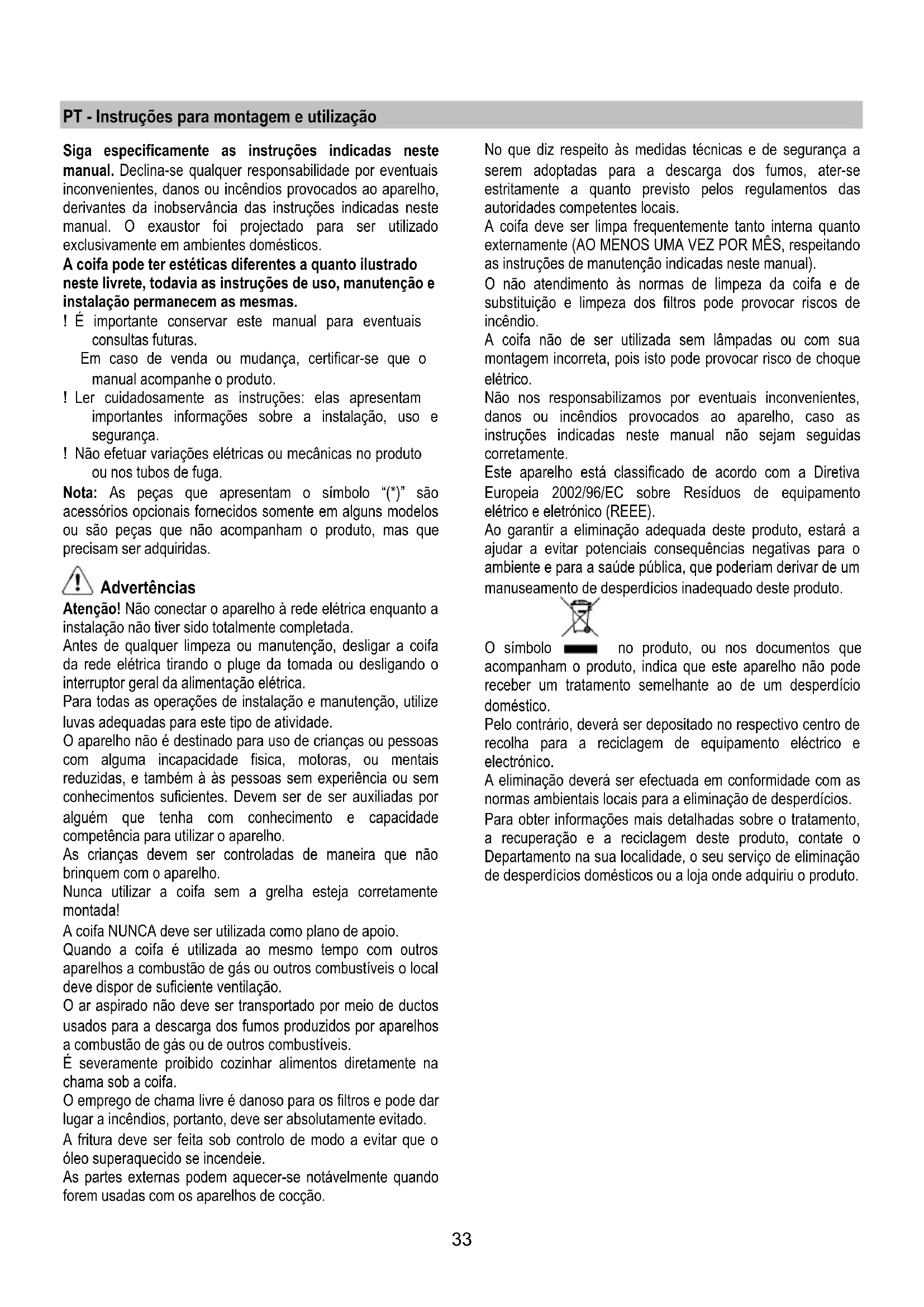 обратной последовательности. Если система подсветки не работает, проверьте корректную установку ламп в гнездах, прежде чем обратиться в центр технической помощи.33 PT - Instruções para montagem e utilização Siga especificamente as instruções indicadas neste manual. Declina-se qualquer responsabilidade por eventuais inconvenientes, danos ou incêndios provocados ao aparelho, derivantes da inobservância das instruções indicadas neste manual. O exaustor foi projectado para ser utilizado exclusivamente em ambientes domésticos. A coifa pode ter estéticas diferentes a quanto ilustrado neste livrete, todavia as instruções de uso, manutenção e instalação permanecem as mesmas. ! É importante conservar este manual para eventuais consultas futuras. Em caso de venda ou mudança, certificar-se que o manual acompanhe o produto. ! Ler cuidadosamente as instruções: elas apresentam importantes informações sobre a instalação, uso e segurança. ! Não efetuar variações elétricas ou mecânicas no produto ou nos tubos de fuga. Nota: As peças que apresentam o símbolo “(*)” são acessórios opcionais fornecidos somente em alguns modelos ou são peças que não acompanham o produto, mas que precisam ser adquiridas. Advertências Atenção! Não conectar o aparelho à rede elétrica enquanto a instalação não tiver sido totalmente completada. Antes de qualquer limpeza ou manutenção, desligar a coifa da rede elétrica tirando o pluge da tomada ou desligando o interruptor geral da alimentação elétrica. Para todas as operações de instalação e manutenção, utilize luvas adequadas para este tipo de atividade. O aparelho não é destinado para uso de crianças ou pessoas com alguma incapacidade fisica, motoras, ou mentais reduzidas, e também à às pessoas sem experiência ou sem conhecimentos suficientes. Devem ser de ser auxiliadas por alguém que tenha com conhecimento e capacidade competência para utilizar o aparelho. As crianças devem ser controladas de maneira que não brinquem com o aparelho. Nunca utilizar a coifa sem a grelha esteja corretamente montada! A coifa NUNCA deve ser utilizada como plano de apoio. Quando a coifa é utilizada ao mesmo tempo com outros aparelhos a combustão de gás ou outros combustíveis o local deve dispor de suficiente ventilação. O ar aspirado não deve ser transportado por meio de ductos usados para a descarga dos fumos produzidos por aparelhos a combustão de gás ou de outros combustíveis. É severamente proibido cozinhar alimentos diretamente na chama sob a coifa. O emprego de chama livre é danoso para os filtros e pode dar lugar a incêndios, portanto, deve ser absolutamente evitado. A fritura deve ser feita sob controlo de modo a evitar que o óleo superaquecido se incendeie. As partes externas podem aquecer-se notávelmente quando forem usadas com os aparelhos de cocção. No que diz respeito às medidas técnicas e de segurança a serem adoptadas para a descarga dos fumos, ater-se estritamente a quanto previsto pelos regulamentos das autoridades competentes locais. A coifa deve ser limpa frequentemente tanto interna quanto externamente (AO MENOS UMA VEZ POR MÊS, respeitando as instruções de manutenção indicadas neste manual). O não atendimento às normas de limpeza da coifa e de substituição e limpeza dos filtros pode provocar riscos de incêndio. A coifa não de ser utilizada sem lâmpadas ou com sua montagem incorreta, pois isto pode provocar risco de choque elétrico. Não nos responsabilizamos por eventuais inconvenientes, danos ou incêndios provocados ao aparelho, caso as instruções indicadas neste manual não sejam seguidas corretamente. Este aparelho está classificado de acordo com a Diretiva Europeia 2002/96/EC sobre Resíduos de equipamento elétrico e eletrónico (REEE). Ao garantir a eliminação adequada deste produto, estará a ajudar a evitar potenciais consequências negativas para o ambiente e para a saúde pública, que poderiam derivar de um manuseamento de desperdícios inadequado deste produto. O símbolo no produto, ou nos documentos que acompanham o produto, indica que este aparelho não pode receber um tratamento semelhante ao de um desperdício doméstico. Pelo contrário, deverá ser depositado no respectivo centro de recolha para a reciclagem de equipamento eléctrico e electrónico. A eliminação deverá ser efectuada em conformidade com as normas ambientais locais para a eliminação de desperdícios. Para obter informações mais detalhadas sobre o tratamento, a recuperação e a reciclagem deste produto, contate o Departamento na sua localidade, o seu serviço de eliminação de desperdícios domésticos ou a loja onde adquiriu o produto.34 Uso A coifa é fabricada para ser utilizada na versão aspirante, com exaustão externa do ar, ou filtrante, com recirculação interna. Versão aspirante Os vapores são evacuados para o exterior por meio de um tubo de descarga fixado á flange de conexão que se encontra sobre o exaustor. O diâmetro do tubo de descarga deve ser equivalente ao diâmetro do anel de conexão. Na parte horizontal o tubo deve ter uma leve inclinação para cima (cerca de 10°) de modo a poder transportar o ar para fora mais facilmente. Se o exaustor for dotada de filtros de carvão ativo, estes deverão ser tirados. Conectar a coifa ao tubos e orifícios de descarga de parede com diâmetro equivalente à saída de ar (flange de união). O uso de tubos ou orifícios de descarga de parede com diâmetro inferior pode provocar a diminuição da performance de aspiração e um drástico aumento do ruído. Não nos responsabilizamos a este respeito. ! Utilizar um tubo condutor com o comprimento não inferior ao indicado. ! Utilizar um tubo condutor com o menor número possível de curvas (ângulo máximo da curva: 90ºC 90°). ! Ev