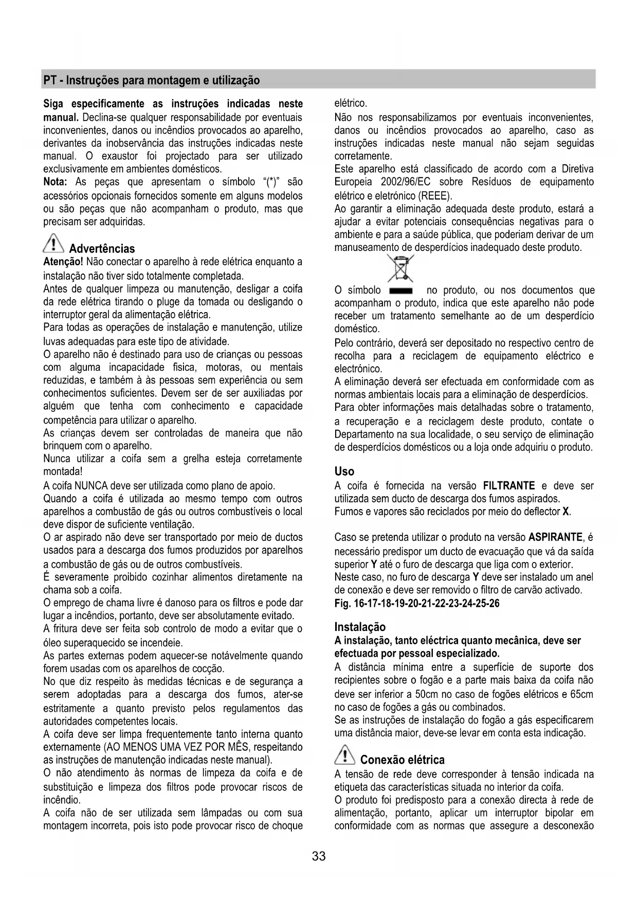 Заменяйте лампы лампами аналогичной формы макс. мощностью 40 Вт (Е14). Для доступа к полости ламп снимите крышку A. Если система подсветки не работает, проверьте корректную установку ламп в гнездах, прежде чем обратиться в центр технической помощи.33 PT - Instruções para montagem e utilização Siga especificamente as instruções indicadas neste manual. Declina-se qualquer responsabilidade por eventuais inconvenientes, danos ou incêndios provocados ao aparelho, derivantes da inobservância das instruções indicadas neste manual. O exaustor foi projectado para ser utilizado exclusivamente em ambientes domésticos. Nota: As peças que apresentam o símbolo “(*)” são acessórios opcionais fornecidos somente em alguns modelos ou são peças que não acompanham o produto, mas que precisam ser adquiridas. Advertências Atenção! Não conectar o aparelho à rede elétrica enquanto a instalação não tiver sido totalmente completada. Antes de qualquer limpeza ou manutenção, desligar a coifa da rede elétrica tirando o pluge da tomada ou desligando o interruptor geral da alimentação elétrica. Para todas as operações de instalação e manutenção, utilize luvas adequadas para este tipo de atividade. O aparelho não é destinado para uso de crianças ou pessoas com alguma incapacidade fisica, motoras, ou mentais reduzidas, e também à às pessoas sem experiência ou sem conhecimentos suficientes. Devem ser de ser auxiliadas por alguém que tenha com conhecimento e capacidade competência para utilizar o aparelho. As crianças devem ser controladas de maneira que não brinquem com o aparelho. Nunca utilizar a coifa sem a grelha esteja corretamente montada! A coifa NUNCA deve ser utilizada como plano de apoio. Quando a coifa é utilizada ao mesmo tempo com outros aparelhos a combustão de gás ou outros combustíveis o local deve dispor de suficiente ventilação. O ar aspirado não deve ser transportado por meio de ductos usados para a descarga dos fumos produzidos por aparelhos a combustão de gás ou de outros combustíveis. É severamente proibido cozinhar alimentos diretamente na chama sob a coifa. O emprego de chama livre é danoso para os filtros e pode dar lugar a incêndios, portanto, deve ser absolutamente evitado. A fritura deve ser feita sob controlo de modo a evitar que o óleo superaquecido se incendeie. As partes externas podem aquecer-se notávelmente quando forem usadas com os aparelhos de cocção. No que diz respeito às medidas técnicas e de segurança a serem adoptadas para a descarga dos fumos, ater-se estritamente a quanto previsto pelos regulamentos das autoridades competentes locais. A coifa deve ser limpa frequentemente tanto interna quanto externamente (AO MENOS UMA VEZ POR MÊS, respeitando as instruções de manutenção indicadas neste manual). O não atendimento às normas de limpeza da coifa e de substituição e limpeza dos filtros pode provocar riscos de incêndio. A coifa não de ser utilizada sem lâmpadas ou com sua montagem incorreta, pois isto pode provocar risco de choque elétrico. Não nos responsabilizamos por eventuais inconvenientes, danos ou incêndios provocados ao aparelho, caso as instruções indicadas neste manual não sejam seguidas corretamente. Este aparelho está classificado de acordo com a Diretiva Europeia 2002/96/EC sobre Resíduos de equipamento elétrico e eletrónico (REEE). Ao garantir a eliminação adequada deste produto, estará a ajudar a evitar potenciais consequências negativas para o ambiente e para a saúde pública, que poderiam derivar de um manuseamento de desperdícios inadequado deste produto. O símbolo no produto, ou nos documentos que acompanham o produto, indica que este aparelho não pode receber um tratamento semelhante ao de um desperdício doméstico. Pelo contrário, deverá ser depositado no respectivo centro de recolha para a reciclagem de equipamento eléctrico e electrónico. A eliminação deverá ser efectuada em conformidade com as normas ambientais locais para a eliminação de desperdícios. Para obter informações mais detalhadas sobre o tratamento, a recuperação e a reciclagem deste produto, contate o Departamento na sua localidade, o seu serviço de eliminação de desperdícios domésticos ou a loja onde adquiriu o produto. Uso A coifa é fornecida na versão FILTRANTE e deve ser utilizada sem ducto de descarga dos fumos aspirados. Fumos e vapores são reciclados por meio do deflector X. Caso se pretenda utilizar o produto na versão ASPIRANTE, é necessário predispor um ducto de evacuação que vá da saída superior Y até o furo de descarga que liga com o exterior. Neste caso, no furo de descarga Y deve ser instalado um anel de conexão e deve ser removido o filtro de carvão activado. Fig. 16-17-18-19-20-21-22-23-24-25-26 Instalação A instalação, tanto eléctrica quanto mecânica, deve ser efectuada por pessoal especializado. A distância mínima entre a superfície de suporte dos recipientes sobre o fogão e a parte mais baixa da coifa não deve ser inferior a 50cm no caso de fogões elétricos e 65cm no caso de fogões a gás ou combinados. Se as instruções de instalação do fogão a gás especificarem uma distância maior, deve-se levar em conta esta indicação. Conexão elétrica A tensão de rede deve corresponder à tensão indicada na etiqueta das características situada no interior da coifa. O produto foi predisposto para a conexão directa à rede de alimentação, portanto, aplicar um interruptor bipolar em conformidade com as normas que assegure a desconexão34 completa da rede nas condições da categoria III de sobretensão, de acordo com as regras de instalação. ATENÇÃO! A peça B (elemento de fixação ao tecto - Fig. 1), é dotada de condutor (amare