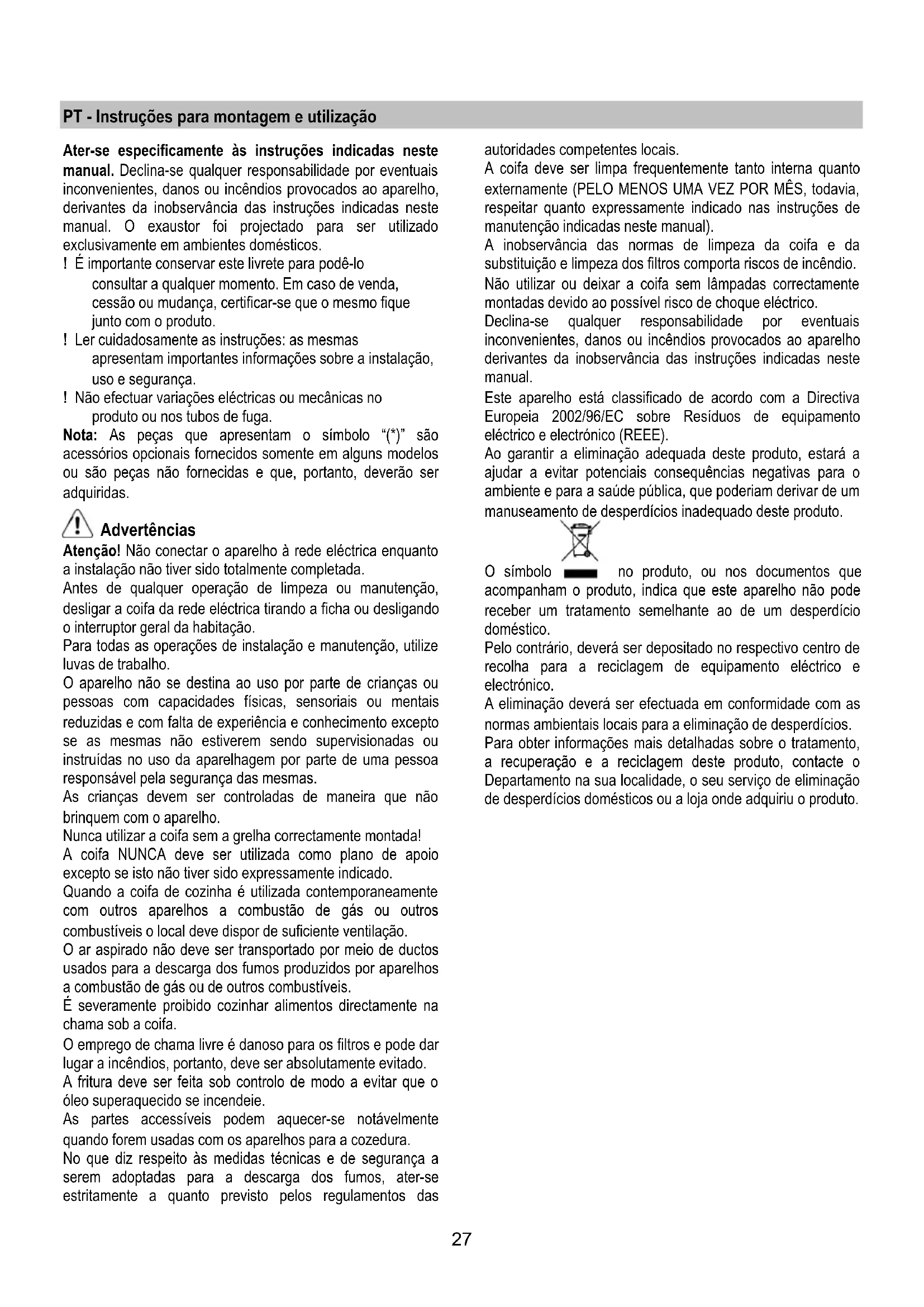 Закройте плафон (крепление защелкой). Если система подсветки не работает, проверьте корректную установку ламп в гнездах, прежде чем обратиться в центр технической помощи.27 PT - Instruções para montagem e utilização Ater-se especificamente às instruções indicadas neste manual. Declina-se qualquer responsabilidade por eventuais inconvenientes, danos ou incêndios provocados ao aparelho, derivantes da inobservância das instruções indicadas neste manual. O exaustor foi projectado para ser utilizado exclusivamente em ambientes domésticos. ! É importante conservar este livrete para podê-lo consultar a qualquer momento. Em caso de venda, cessão ou mudança, certificar-se que o mesmo fique junto com o produto. ! Ler cuidadosamente as instruções: as mesmas apresentam importantes informações sobre a instalação, uso e segurança. ! Não efectuar variações eléctricas ou mecânicas no produto ou nos tubos de fuga. Nota: As peças que apresentam o símbolo “(*)” são acessórios opcionais fornecidos somente em alguns modelos ou são peças não fornecidas e que, portanto, deverão ser adquiridas. Advertências Atenção! Não conectar o aparelho à rede eléctrica enquanto a instalação não tiver sido totalmente completada. Antes de qualquer operação de limpeza ou manutenção, desligar a coifa da rede eléctrica tirando a ficha ou desligando o interruptor geral da habitação. Para todas as operações de instalação e manutenção, utilize luvas de trabalho. O aparelho não se destina ao uso por parte de crianças ou pessoas com capacidades físicas, sensoriais ou mentais reduzidas e com falta de experiência e conhecimento excepto se as mesmas não estiverem sendo supervisionadas ou instruídas no uso da aparelhagem por parte de uma pessoa responsável pela segurança das mesmas. As crianças devem ser controladas de maneira que não brinquem com o aparelho. Nunca utilizar a coifa sem a grelha correctamente montada! A coifa NUNCA deve ser utilizada como plano de apoio excepto se isto não tiver sido expressamente indicado. Quando a coifa de cozinha é utilizada contemporaneamente com outros aparelhos a combustão de gás ou outros combustíveis o local deve dispor de suficiente ventilação. O ar aspirado não deve ser transportado por meio de ductos usados para a descarga dos fumos produzidos por aparelhos a combustão de gás ou de outros combustíveis. É severamente proibido cozinhar alimentos directamente na chama sob a coifa. O emprego de chama livre é danoso para os filtros e pode dar lugar a incêndios, portanto, deve ser absolutamente evitado. A fritura deve ser feita sob controlo de modo a evitar que o óleo superaquecido se incendeie. As partes accessíveis podem aquecer-se notávelmente quando forem usadas com os aparelhos para a cozedura. No que diz respeito às medidas técnicas e de segurança a serem adoptadas para a descarga dos fumos, ater-se estritamente a quanto previsto pelos regulamentos das autoridades competentes locais. A coifa deve ser limpa frequentemente tanto interna quanto externamente (PELO MENOS UMA VEZ POR MÊS, todavia, respeitar quanto expressamente indicado nas instruções de manutenção indicadas neste manual). A inobservância das normas de limpeza da coifa e da substituição e limpeza dos filtros comporta riscos de incêndio. Não utilizar ou deixar a coifa sem lâmpadas correctamente montadas devido ao possível risco de choque eléctrico. Declina-se qualquer responsabilidade por eventuais inconvenientes, danos ou incêndios provocados ao aparelho derivantes da inobservância das instruções indicadas neste manual. Este aparelho está classificado de acordo com a Directiva Europeia 2002/96/EC sobre Resíduos de equipamento eléctrico e electrónico (REEE). Ao garantir a eliminação adequada deste produto, estará a ajudar a evitar potenciais consequências negativas para o ambiente e para a saúde pública, que poderiam derivar de um manuseamento de desperdícios inadequado deste produto. O símbolo no produto, ou nos documentos que acompanham o produto, indica que este aparelho não pode receber um tratamento semelhante ao de um desperdício doméstico. Pelo contrário, deverá ser depositado no respectivo centro de recolha para a reciclagem de equipamento eléctrico e electrónico. A eliminação deverá ser efectuada em conformidade com as normas ambientais locais para a eliminação de desperdícios. Para obter informações mais detalhadas sobre o tratamento, a recuperação e a reciclagem deste produto, contacte o Departamento na sua localidade, o seu serviço de eliminação de desperdícios domésticos ou a loja onde adquiriu o produto.28 Uso A coifa é fabricada para ser utilizada na versão aspirante, com evacuação externa, ou filtrante, com recirculação interna. Versão aspirante Os vapores são evacuados para o externo por meio de um tubo de descarga fixado ao flange de conexão que se encontra sobre a coifa. O diâmetro do tubo de descarga deve ser equivalente ao diâmetro do anel de conexão. Na parte horizontal o tubo deve ter uma leve inclinação para cima (cerca de 10°) de modo a poder transportar o ar para fora mais facilmente. Se a coifa for dotada de filtros de carvão activado, estes deverão ser tirados. Conectar a coifa a tubos e orifícios de descarga de parede com diâmetro equivalente à saída de ar (flange de união). O uso de tubos ou orifícios de descarga de parede com diâmetro inferior determinará uma diminuição da performance de aspiração e um drástico aumento do ruído. Declina-se qualquer responsabilidade a este respeito. ! Utilizar uma conduta com o comprimento mínimo indispensável. ! Utilizar uma conduta com o menor número possível de curvas (ângulo máximo da curva: 90ºC 90°). ! Evitar alterações drásticas da secção do