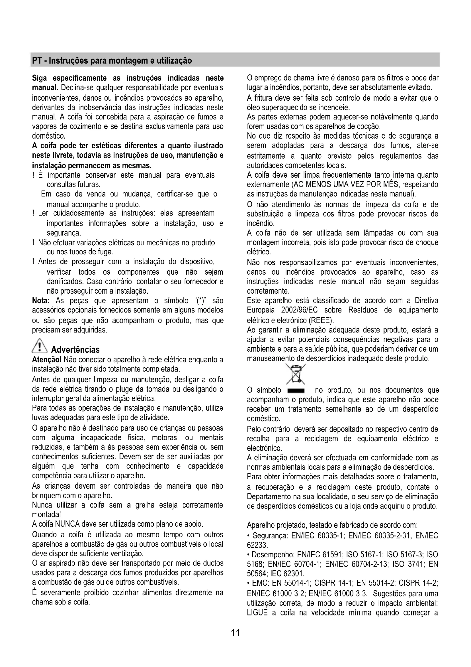 PT - Instruções para montagem e utilização Siga especificamente as instruções indicadas neste manual. Declina-se qualquer responsabilidade por eventuais inconvenientes, danos ou incêndios provocados ao aparelho, derivantes da inobservância das instruções indicadas neste manual. A coifa foi concebida para a aspiração de fumos e vapores de cozimento e se destina exclusivamente para uso doméstico. A coifa pode ter estéticas diferentes a quanto ilustrado neste livrete, todavia as instruções de uso, manutenção e instalação permanecem as mesmas. ! É importante conservar este manual para eventuais consultas futuras. Em caso de venda ou mudança, certificar-se que o manual acompanhe o produto. ! Ler cuidadosamente as instruções: elas apresentam importantes informações sobre a instalação, uso e segurança. ! Não efetuar variações elétricas ou mecânicas no produto ou nos tubos de fuga. ! Antes de prosseguir com a instalação do dispositivo, verificar todos os componentes que não sejam danificados. Caso contrário, contatar o seu fornecedor e não prosseguir com a instalação. Nota: As peças que apresentam o símbolo “(*)” são acessórios opcionais fornecidos somente em alguns modelos ou são peças que não acompanham o produto, mas que precisam ser adquiridas. Advertências Atenção! Não conectar o aparelho à rede elétrica enquanto a instalação não tiver sido totalmente completada. Antes de qualquer limpeza ou manutenção, desligar a coifa da rede elétrica tirando o pluge da tomada ou desligando o interruptor geral da alimentação elétrica. Para todas as operações de instalação e manutenção, utilize luvas adequadas para este tipo de atividade. O aparelho não é destinado para uso de crianças ou pessoas com alguma incapacidade fisica, motoras, ou mentais reduzidas, e também à às pessoas sem experiência ou sem conhecimentos suficientes. Devem ser de ser auxiliadas por alguém que tenha com conhecimento e capacidade competência para utilizar o aparelho. As crianças devem ser controladas de maneira que não brinquem com o aparelho. Nunca utilizar a coifa sem a grelha esteja corretamente montada! A coifa NUNCA deve ser utilizada como plano de apoio. Quando a coifa é utilizada ao mesmo tempo com outros aparelhos a combustão de gás ou outros combustíveis o local deve dispor de suficiente ventilação. O ar aspirado não deve ser transportado por meio de ductos usados para a descarga dos fumos produzidos por aparelhos a combustão de gás ou de outros combustíveis. É severamente proibido cozinhar alimentos diretamente na chama sob a coifa. O emprego de chama livre é danoso para os filtros e pode dar lugar a incêndios, portanto, deve ser absolutamente evitado. A fritura deve ser feita sob controlo de modo a evitar que o óleo superaquecido se incendeie. As partes externas podem aquecer-se notávelmente quando forem usadas com os aparelhos de cocção. No que diz respeito às medidas técnicas e de segurança a serem adoptadas para a descarga dos fumos, ater-se estritamente a quanto previsto pelos regulamentos das autoridades competentes locais. A coifa deve ser limpa frequentemente tanto interna quanto externamente (AO MENOS UMA VEZ POR MÊS, respeitando as instruções de manutenção indicadas neste manual). O não atendimento às normas de limpeza da coifa e de substituição e limpeza dos filtros pode provocar riscos de incêndio. A coifa não de ser utilizada sem lâmpadas ou com sua montagem incorreta, pois isto pode provocar risco de choque elétrico. Não nos responsabilizamos por eventuais inconvenientes, danos ou incêndios provocados ao aparelho, caso as instruções indicadas neste manual não sejam seguidas corretamente. Este aparelho está classificado de acordo com a Diretiva Europeia 2002/96/EC sobre Resíduos de equipamento elétrico e eletrónico (REEE). Ao garantir a eliminação adequada deste produto, estará a ajudar a evitar potenciais consequências negativas para o ambiente e para a saúde pública, que poderiam derivar de um manuseamento de desperdícios inadequado deste produto. O símbolo no produto, ou nos documentos que acompanham o produto, indica que este aparelho não pode receber um tratamento semelhante ao de um desperdício doméstico. Pelo contrário, deverá ser depositado no respectivo centro de recolha para a reciclagem de equipamento eléctrico e electrónico. A eliminação deverá ser efectuada em conformidade com as normas ambientais locais para a eliminação de desperdícios. Para obter informações mais detalhadas sobre o tratamento, a recuperação e a reciclagem deste produto, contate o Departamento na sua localidade, o seu serviço de eliminação de desperdícios domésticos ou a loja onde adquiriu o produto. Aparelho projetado, testado e fabricado de acordo com: