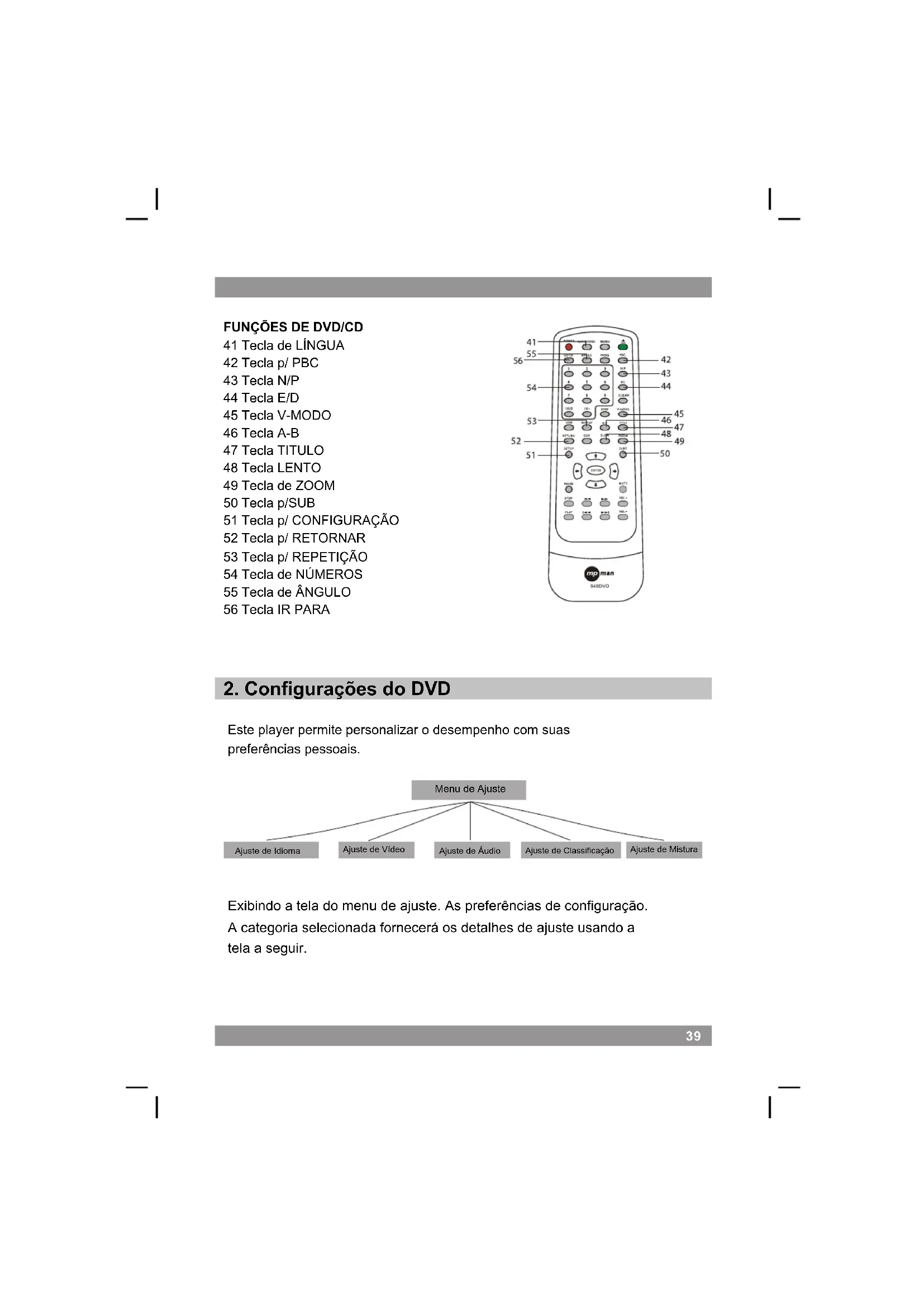 Este player permite personalizar o desempenho com suas preferências pessoais. Exibindo a tela do menu de ajuste. As preferências de configuração. A categoria selecionada fornecerá os detalhes de ajuste usando a tela a seguir. Menu de Ajuste Ajuste de IdiomaAjuste de VídeoAjuste de ÁudioAjuste de ClassificaçãoAjuste de Mistura40 Configurar “PARENTAL CONTROL” (CONTROLE DOS PAIS) em “Rating” (Classificação), pressione “enter” e insira o código 0000 (O código original de fábrica é 0000). Depois de inserir e confirmar o código,pressione “PARENTAL CONTROL” (CONTROLE DOS PAIS) e escolha a classificação desejada. Vá para “SET PASSWORD” (CONFIGURAR SENHA), insira e confirme o código novamente. A função “PARENTAL CONTROL” (CONTROLE DOS PAIS) é acionado. Página Principal Idioma Vídeo Áudio Classificação Mistura Usar Configurações PadrõesTela de Economia de EnergiaMemória Restante Controle dos Pais: 8.Adulto Configurar Senha Saída digital Saída de videoSistema de TVTaxa de AspectoModo de VisualizaçãoIdioma OSDLegendaLegenda MPEG4ÁudioMenu do DVDInglêsFrancêsAlemãoItalianoPolonêsAlemãoAutomáticoDesligado Europa Ocidental 4: 3 16: 9 Completa Original Encaixe Automático Panscan NTSC PAL Automático DESLIGADA PCM RAW 1.Seguro para Crianças 8.Adulto 2.G 3.PG 4.PG-13 5.PG-R 6.R 7.NC-17 Si m Não Desligado Ligado InglêsFrancêsAlemãoItalianoPolonêsAlemão Europa Central InglêsFrancêsAlemãoItalianoPolonêsAlemãoInglêsFrancêsAlemãoItalianoPolonêsAlemão Desligado Ligado Composto Componente S-VIDEO RGB P-Scan41
