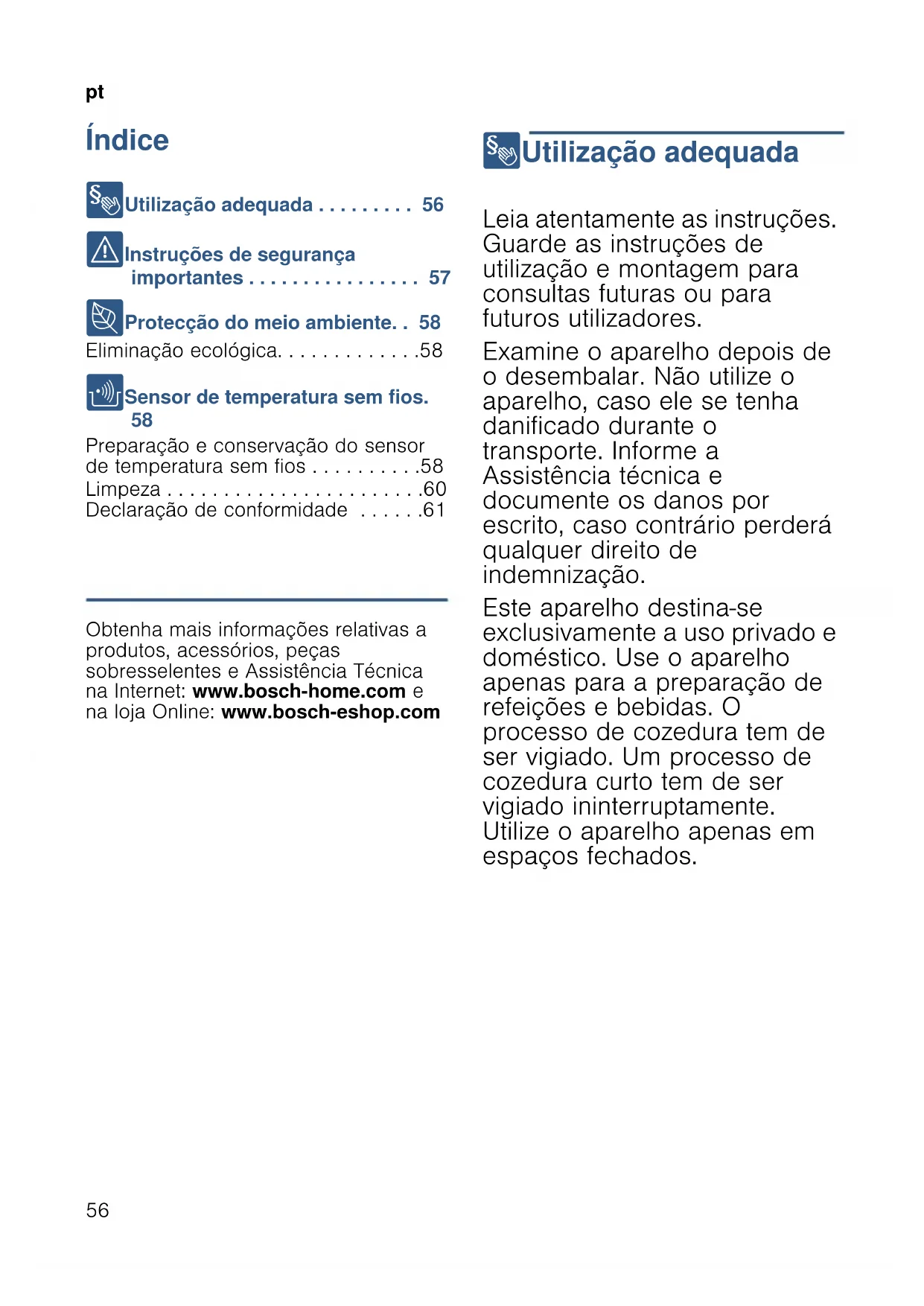 Preparação e conservação do sensor de temperatura sem fios . . . . . . . . . .58 Limpeza . . . . . . . . . . . . . . . . . . . . . . .60 Declaração de conformidade . . . . . .61 Produktinfo Obtenha mais informações relativas a produtos, acessórios, peças sobresselentes e Assistência Técnica na Internet: www.bosch-home.com e na loja Online: www.bosch-eshop.com 8 Utilização adequada Utilização adequada Leia atentamente as instruções. Guarde as instruções de utilização e montagem para consultas futuras ou para futuros utilizadores. Examine o aparelho depois de o desembalar. Não utilize o aparelho, caso ele se tenha danificado durante o transporte. Informe a Assistência técnica e documente os danos por escrito, caso contrário perderá qualquer direito de indemnização. Este aparelho destina-se exclusivamente a uso privado e doméstico. Use o aparelho apenas para a preparação de refeições e bebidas. O processo de cozedura tem de ser vigiado. Um processo de cozedura curto tem de ser vigiado ininterruptamente. Utilize o aparelho apenas em espaços fechados.pt
