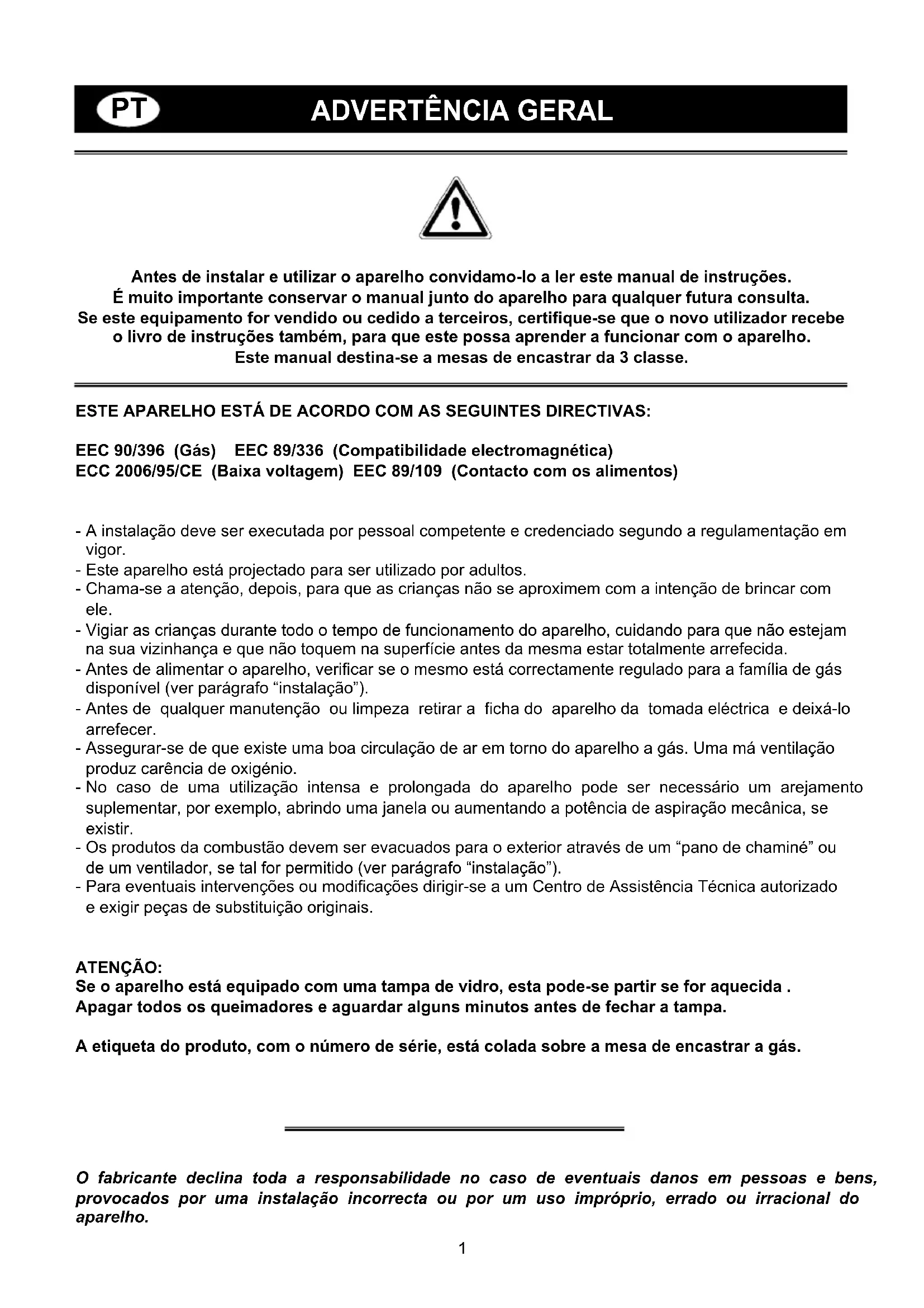 Antes de instalar e utilizar o aparelho convidamo-lo a ler este manual de instruções. É muito importante conservar o manual junto do aparelho para qualquer futura consulta. Se este equipamento for vendido ou cedido a terceiros, certifique-se que o novo utilizador recebe o livro de instruções também, para que este possa aprender a funcionar com o aparelho. Este manual destina-se a mesas de encastrar da 3 classe. ESTE APARELHO ESTÁ DE ACORDO COM AS SEGUINTES DIRECTIVAS: EEC 90/396 (Gás) EEC 89/336 (Compatibilidade electromagnética) ECC 2006/95/CE (Baixa voltagem) EEC 89/109 (Contacto com os alimentos) A instalação deve ser executada por pessoal competente e credenciado segundo a regulamentação em vigor. Este aparelho está projectado para ser utilizado por adultos. Chama-se a atenção, depois, para que as crianças não se aproximem com a intenção de brincar com ele. Vigiar as crianças durante todo o tempo de funcionamento do aparelho, cuidando para que não estejam na sua vizinhança e que não toquem na superfície antes da mesma estar totalmente arrefecida. Antes de alimentar o aparelho, verificar se o mesmo está correctamente regulado para a família de gás disponível (ver parágrafo “instalação”). Antes de qualquer manutenção ou limpeza retirar a ficha do aparelho da tomada eléctrica e deixá-lo arrefecer. Assegurar-se de que existe uma boa circulação de ar em torno do aparelho a gás. Uma má ventilação produz carência de oxigénio. No caso de uma utilização intensa e prolongada do aparelho pode ser necessário um arejamento suplementar, por exemplo, abrindo uma janela ou aumentando a potência de aspiração mecânica, se existir. Os produtos da combustão devem ser evacuados para o exterior através de um “pano de chaminé” ou de um ventilador, se tal for permitido (ver parágrafo “instalação”). Para eventuais intervenções ou modificações dirigir-se a um Centro de Assistência Técnica autorizado e exigir peças de substituição originais. ATENÇÃO: Se o aparelho está equipado com uma tampa de vidro, esta pode-se partir se for aquecida . Apagar todos os queimadores e aguardar alguns minutos antes de fechar a tampa. A etiqueta do produto, com o número de série, está colada sobre a mesa de encastrar a gás.