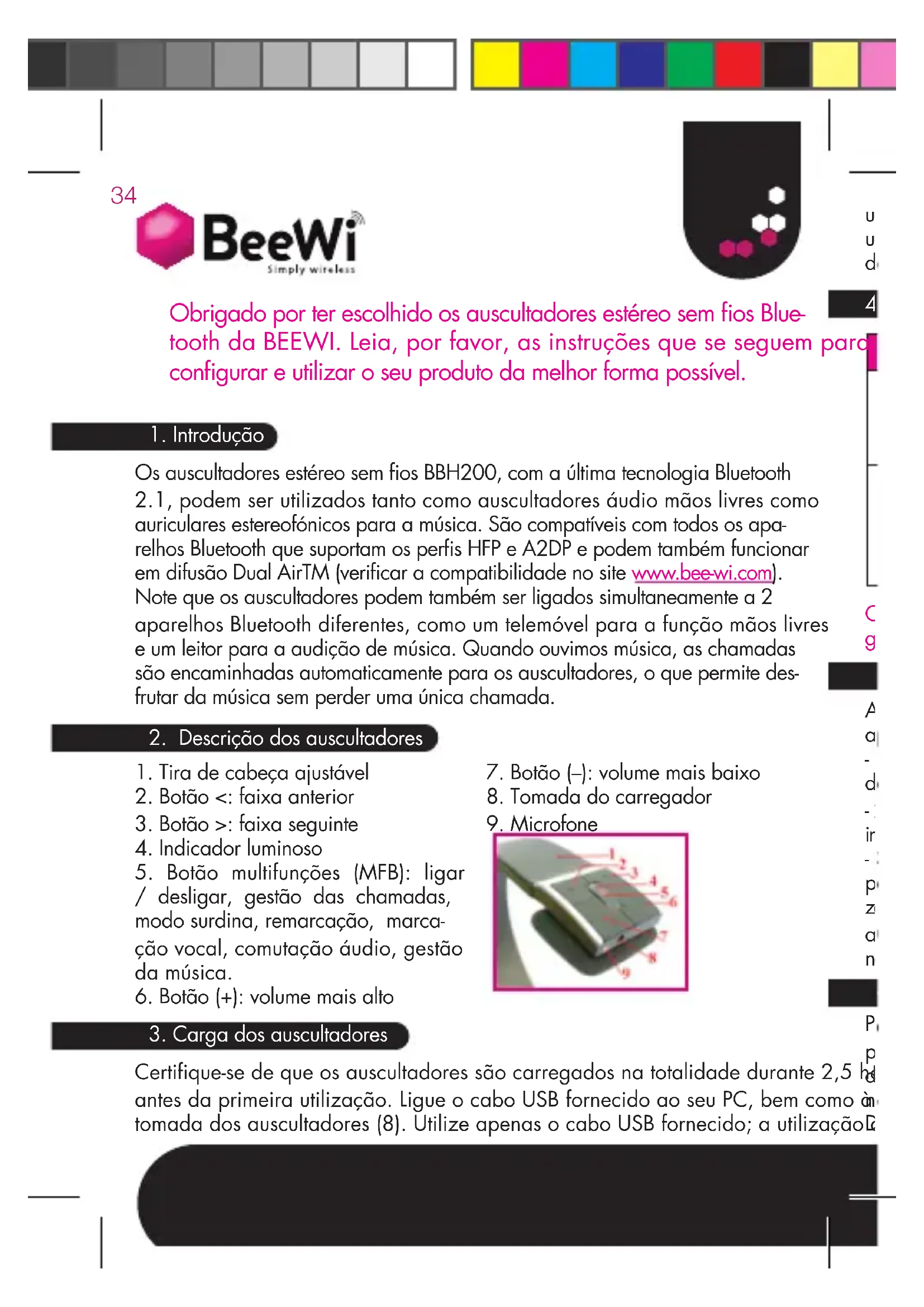 um cabo diferente pode danificar os auscultadores. Quando o indicador apresenta uma luz vermelha permanente, os auscultadores estão a ser carregados. Quando se desliga, isso signica que os auscultadores estão totalmente carregados. Função Operação Indicador luminoso Ligar Prima o botão MFB durante 5 segundos até que o indicador azul se acenda O díodo azul pisca 4 vezes Desligar Prima o botão MFB durante 10 segundos até que o indicador vermelho se acenda O díodo azul pisca 4 vezes Observação: para preservar a autonomia da bateria, os auscultadores desli- gam-se automaticamente após 5 minutos se nenhum aparelho estiver ligado. Antes de utilizar os auscultadores, deve acoplá-lo ao seu telemóvel ou a qualquer outro aparelho Bluetooth com o qual o irá utilizar. - 1. Coloque os auscultadores no modo de acoplamento: com os auscultadores desliga- dos, prima o botão MFB até que o indicador luminoso pisque uma luz azul e vermelha. - 2. Configure o seu telemóvel para a descoberta dos periféricos Bluetooth seguindo as instruções fornecidas no manual do telefone. - 3. Uma vez os auscultadores “BeeWi BBH200” descobertos, seleccione-os, aceite o pedido de acoplamento e confirme o acoplamento introduzindo o código “0000” (4 zeros).Após a confirmação do acoplamento pelo telemóvel, os auscultadores ligam-se automaticamente e o indicador azul pisca 2 vezes a cada 4 segundos. Se o acoplamento não for correctamente efectuado, repita as etapas 1 a 3 acima. Pode ligar dois aparelhos ao mesmo tempo, desde que utilizem diferentes perfis (um utiliza o perfil HFP para a telefonia e o outro o perfil A2DP para a difusão de música). Quando já é utilizado por um aparelho, o perfil em causa não pode ser partilhado com um outro aparelho. Depois de acoplar aos auscultadores a um telemóvel, pode acoplá-los a um Obrigado por ter escolhido os auscultadores estéreo sem fios Blue- tooth da BEEWI. Leia, por favor, as instruções que se seguem para configurar e utilizar o seu produto da melhor forma possível.