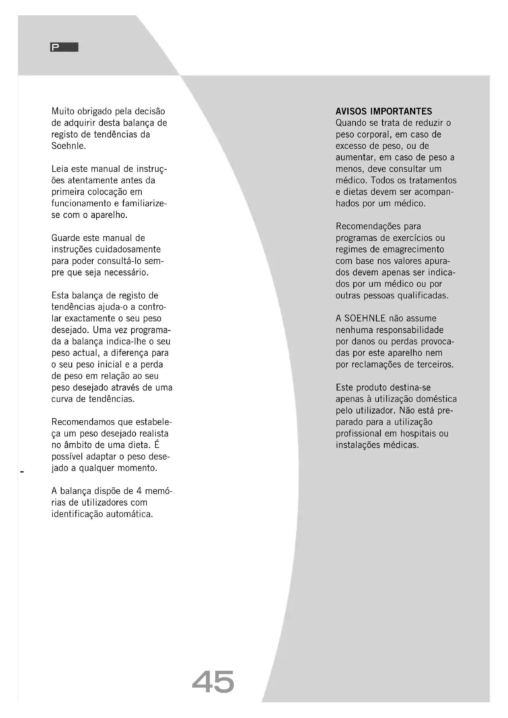 BA63150tendence117634_V8.qxd 07.02.2007 6:58 Uhr Seite 4445 Muito obrigado pela decisão de adquirir desta balança de registo de tendências da Soehnle. Leia este manual de instruç- ões atentamente antes da primeira colocação em funcionamento e familiarize- se com o aparelho. Guarde este manual de instruções cuidadosamente para poder consultá-lo sem- pre que seja necessário. Esta balança de registo de tendências ajuda-o a contro- lar exactamente o seu peso desejado. Uma vez programa- da a balança indica-lhe o seu peso actual, a diferença para o seu peso inicial e a perda de peso em relação ao seu peso desejado através de uma curva de tendências. Recomendamos que estabele- ça um peso desejado realista no âmbito de uma dieta. É possível adaptar o peso dese- jado a qualquer momento. A balança dispõe de 4 memó- rias de utilizadores com identificação automática. AVISOS IMPORTANTES Quando se trata de reduzir o peso corporal, em caso de excesso de peso, ou de aumentar, em caso de peso a menos, deve consultar um médico. Todos os tratamentos e dietas devem ser acompan- hados por um médico. Recomendações para programas de exercícios ou regimes de emagrecimento com base nos valores apura- dos devem apenas ser indica- dos por um médico ou por outras pessoas qualificadas. A SOEHNLE não assume nenhuma responsabilidade por danos ou perdas provoca- das por este aparelho nem por reclamações de terceiros. Este produto destina-se apenas à utilização doméstica pelo utilizador. Não está pre- parado para a utilização profissional em hospitais ou instalações médicas.