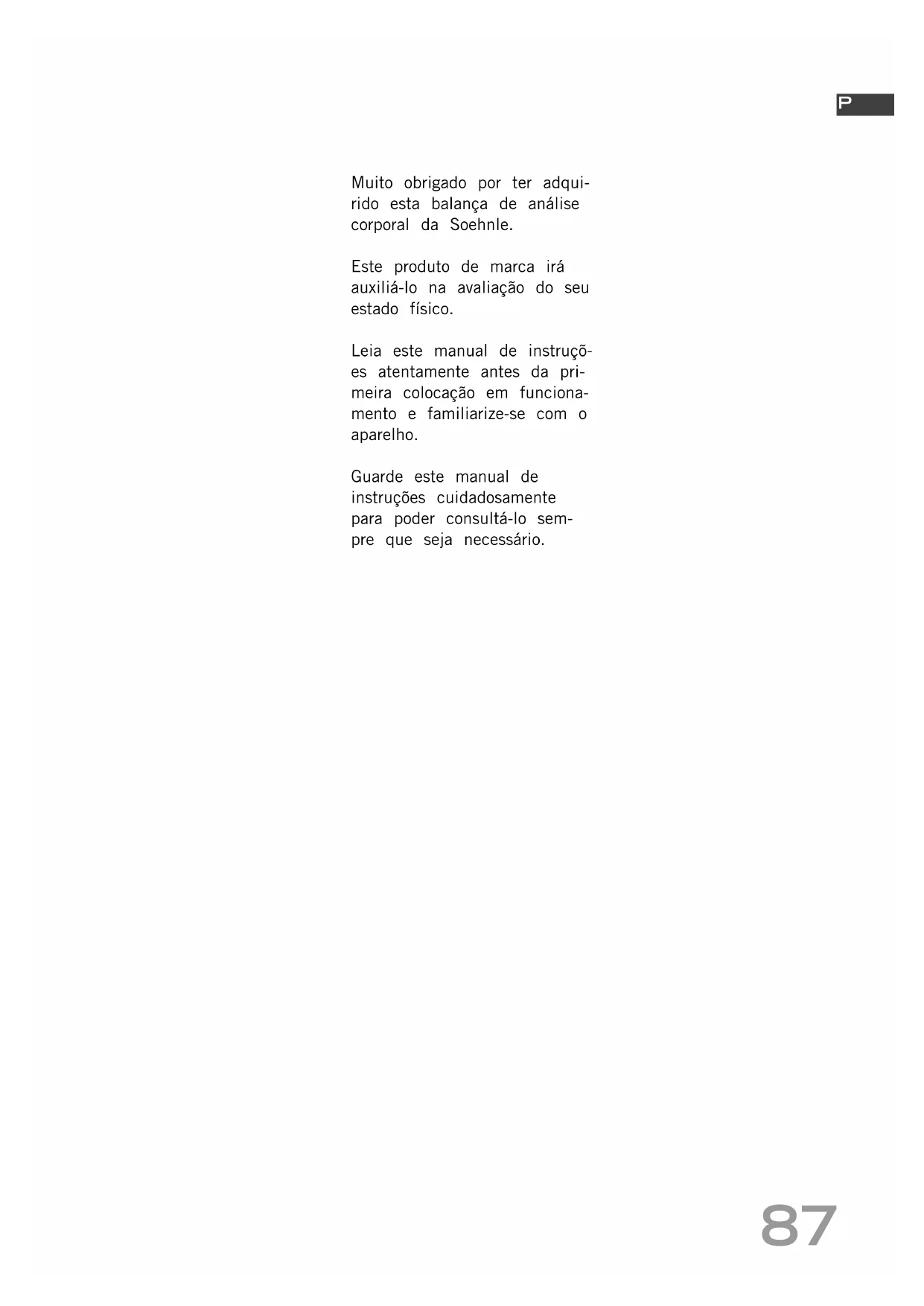 BA63721slimF5_120863_V10.qxd:BA63721slimF5_120863_V9.qxd 05.01.2010 13:21 Uhr Seite 8687 Muito obrigado por ter adqui- rido esta balança de análise corporal da Soehnle. Este produto de marca irá auxiliá-lo na avaliação do seu estado físico. Leia este manual de instruçõ- es atentamente antes da pri- meira colocação em funciona- mento e familiarize-se com o aparelho. Guarde este manual de instruções cuidadosamente para poder consultá-lo sem- pre que seja necessário.