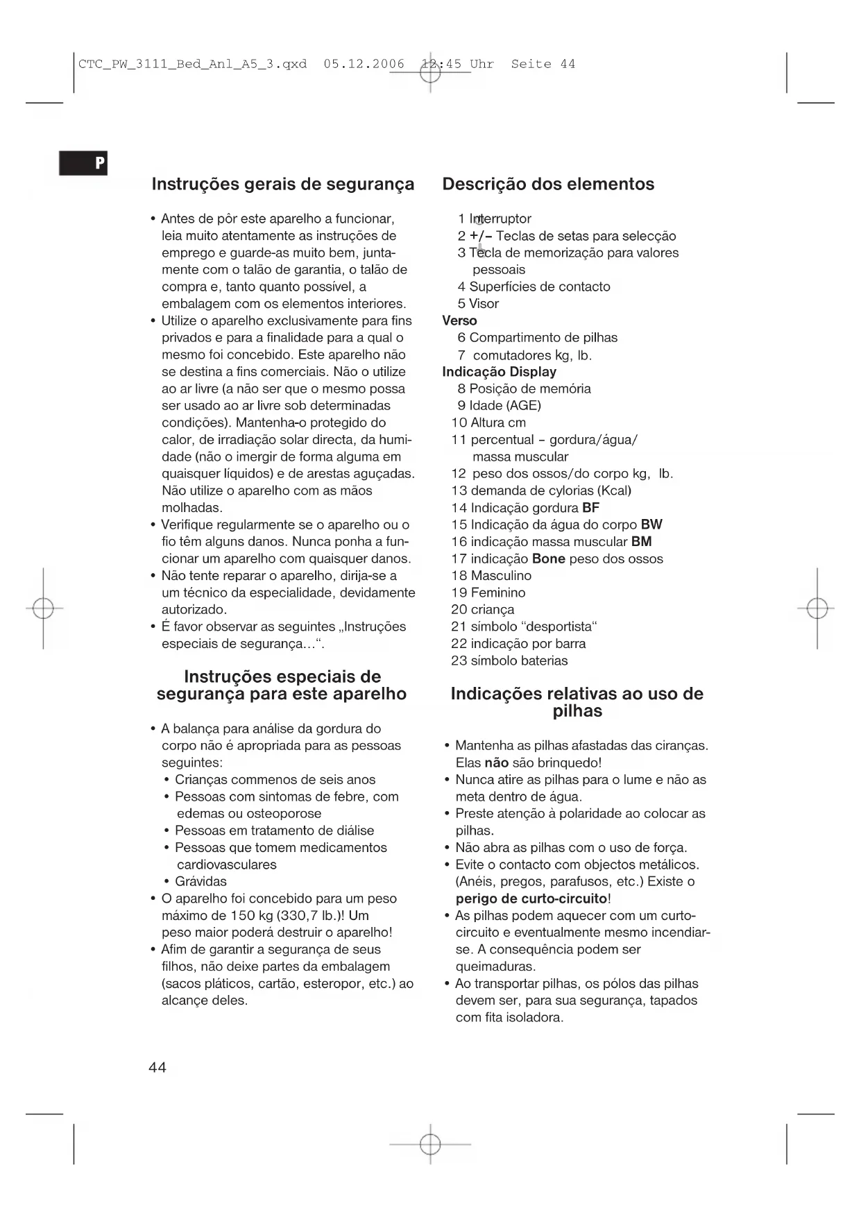 CTC_PW_3111_Bed_Anl_A5_3.qxd 05.12.2006 12:45 Uhr Seite 44• Se uma pilha não está estanque e escorre, não aproximar o líquido dos olhos ou de mucosas. Em caso de contacto lavar as mãos, enxaguar os olhos com água limpa, e, se houver problemas, que não se deixam solucionar, consultar um médico.