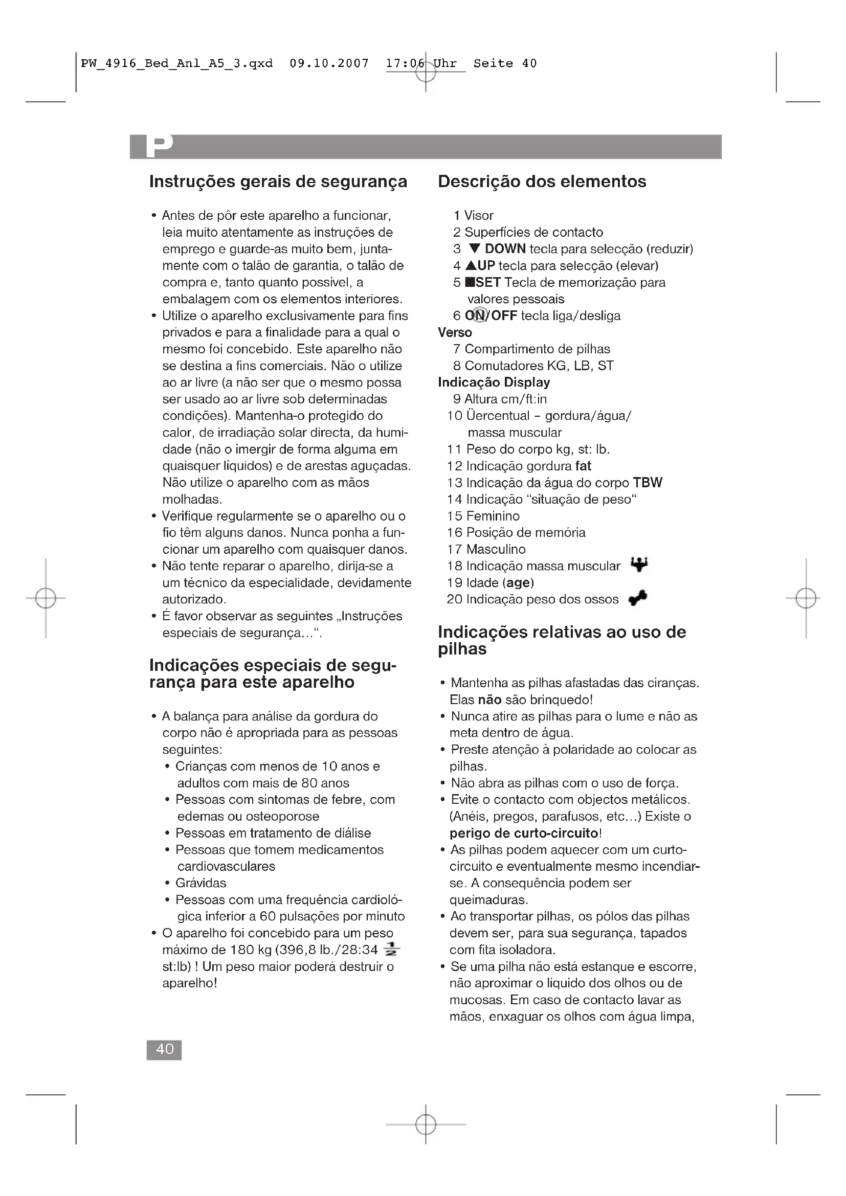 parte de trás. 2.Coloque 3 baterias do tipo AM4 „AAA“ 1,5V no compartimento. Preste atenção a que a polaridade seja a correcta (veja o fundo do compartimento de baterias)! 3.Torne a fechar o compartimento. 4.No caso de a balança não ser utilizada durante um período prolongado, retire a pilha, para evitar que haja um “derrama- mento” de ácido da mesma. 5.Não utilizar conjuntamente tipos de bateri- as desiguais ou baterias novas e usadas. 6.Se, durante a utilização, surgir no display (1) a indicação “LO“ referente ao estado das baterias, substitua-as. Informações sobre a medição da gordura do corpo Pessoas que usem um „pace-maker“ ou outra implantação medicinal com peças electrónicas, não deverão usar esta balança. A implantação poderá ser posta em risco ou sofrer outros impedimentos. O aparelho só funcionará correctamente se se colocar sobre as superfícies de contacto de pés descalços e secos! O princípio básico deste aparelho é a medição da resistência eléctrica aparente (impedância) do corpo. Para tal, o mesmo emitirá um sinal eléctrico fraco e não sensível que percorrerá o corpo para medir os respectivos valores actuais. O sinal é, em geral, completamente inofensi- vo! Consulte por favor as nossas instruções de segurança especiais. A medição é denominada „Análise bioeléctri- ca da impedância“ (ABI), um factor relaciona- do com a percentagem de gordura e de água do corpo, assim como com outros dados biológicos (idade, sexo, altura). Há pessoas pesadas com uma proporção equilibrada entre a massa de gordura e de músculos, e existem aparentemente pessoas esguias com uma percentagem de gordura manifestamente elevada. A gordura é um factor que contribui sobremaneira para uma sobrecarga do organismo, em especial do sistema cardíaco e circulatório. O controle de ambos os valores (gordura e peso) são porisso uma condição básica para a saúde e a „fitness“. Atenção! Baterias não devem ser jogadas no lixo caseiro. Queira levar baterias vazias ao posto de colecta competente, ou entragá- las ao seu comerciante. Aviso! Não exponha as baterias a calor excessivo, nem à incidência directa dos raios solares. Nunca jogue baterias no fogo. Há risco de explodirem! PW_4916_Bed_Anl_A5_3.qxd 09.10.2007 17:06 Uhr Seite 4142