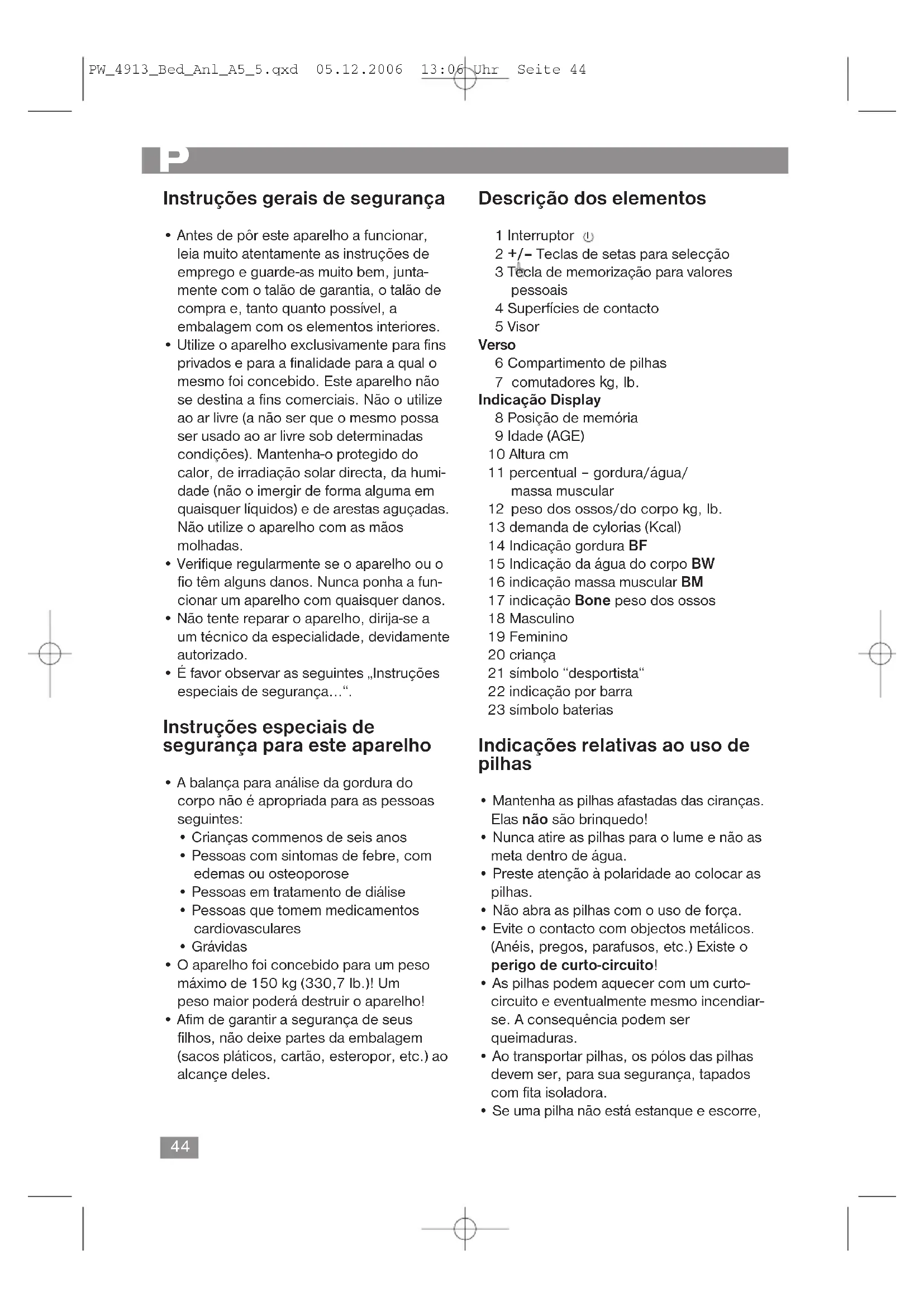 - Não utilize baterias de tipos diferentes, nem mistura baterias novas e usadas. Atenção: as pilhas não deverão ser deitadas para o lixo doméstico. Entregue as pilhas gastas nos locais próprios ou na loja onde as comprou. Nunca deite pilhas para o fogo. Compartimento de pilhas (parte traseira da balança) Para o transporte, as duas pilhas que se encontram no compartimento foram revestidas de plástico. Desta forma, as mesmas não se gastarão enquanto não chegarem às mãos do consumidor. Retire o plástico para que a balança possa começar a funcionar. Informações sobre a medição da gordura do corpo Pessoas que usem um „pace-maker“ ou outra implantação medicinal com peças electrónicas, não deverão usar esta balança. A implantação poderá ser posta em risco ou sofrer outros impedimentos. O aparelho só funcionará correctamente se se colocar sobre as superfícies de contacto de pés descalços e secos! O princípio básico deste aparelho é a medição da resistência eléctrica aparente (impedância) do corpo. Para tal, o mesmo emitirá um sinal eléctrico fraco e não sensível que percorrerá o corpo para medir os respectivos valores actuais. O sinal é, em geral, completamente inofensi- vo! Consulte por favor as nossas instruções de segurança especiais. A medição é denominada „Análise bioeléctri- ca da impedância“ (ABI), um factor relaciona- do com a percentagem de gordura e de água do corpo, assim como com outros dados biológicos (idade, sexo, altura). Há pessoas pesadas com uma proporção equilibrada entre a massa de gordura e de músculos, e existem aparentemente pessoas esguias com uma percentagem de gordura manifestamente elevada. A gordura é um factor que contribui sobremaneira para uma sobrecarga do organismo, em especial do sistema cardíaco e circulatório. O controle de ambos os valores (gordura e peso) são porisso uma condição básica para a saúde e a „fitness“. PW_4913_Bed_Anl_A5_5.qxd 05.12.2006 13:06 Uhr Seite 4546