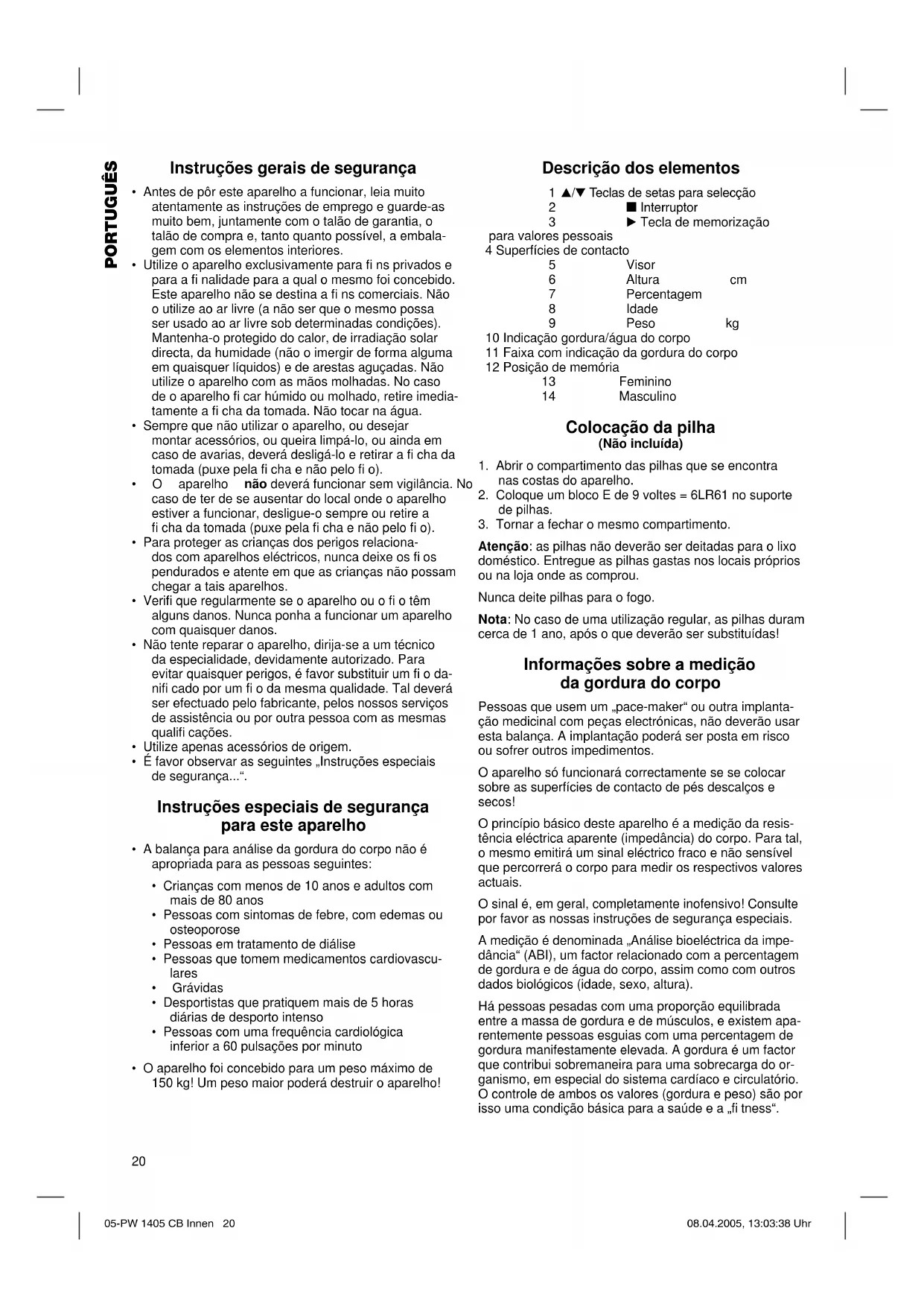 Atenção: as pilhas não deverão ser deitadas para o lixo doméstico. Entregue as pilhas gastas nos locais próprios ou na loja onde as comprou. Nunca deite pilhas para o fogo. Nota: No caso de uma utilização regular, as pilhas duram cerca de 1 ano, após o que deverão ser substituídas! Informações sobre a medição da gordura do corpo Pessoas que usem um „pace-maker“ ou outra implanta- ção medicinal com peças electrónicas, não deverão usar esta balança. A implantação poderá ser posta em risco ou sofrer outros impedimentos. O aparelho só funcionará correctamente se se colocar sobre as superfícies de contacto de pés descalços e secos! O princípio básico deste aparelho é a medição da resis- tência eléctrica aparente (impedância) do corpo. Para tal, o mesmo emitirá um sinal eléctrico fraco e não sensível que percorrerá o corpo para medir os respectivos valores actuais. O sinal é, em geral, completamente inofensivo! Consulte por favor as nossas instruções de segurança especiais. A medição é denominada „Análise bioeléctrica da impe- dância“ (ABI), um factor relacionado com a percentagem de gordura e de água do corpo, assim como com outros dados biológicos (idade, sexo, altura). Há pessoas pesadas com uma proporção equilibrada entre a massa de gordura e de músculos, e existem apa- rentemente pessoas esguias com uma percentagem de gordura manifestamente elevada. A gordura é um factor que contribui sobremaneira para uma sobrecarga do or- ganismo, em especial do sistema cardíaco e circulatório. O controle de ambos os valores (gordura e peso) são por isso uma condição básica para a saúde e a „fi tness“. 05-PW 1405 CB Innen 20 08.04.2005, 13:03:38 Uhr21 PORTUGUÊS Gordura do corpo A gordura é um elemento importante do organismo que não só protege as articulações, mas também armaze- na vitaminas e efectua a regulação da temperatura do corpo. Assim, a fi nalidade não consiste em reduzir radi- calmente a percentagem de gordura que se encontra no corpo, mas atingir e manter uma proporção equilibrada entre a massa de gordura e de músculos. O signifi cado da água para a nossa saúde O organismo humano é composto por cerca de 55-60% de água, dependendo a quantidade da idade e do sexo de cada um. A água desempenha uma série de tarefas no nosso corpo: