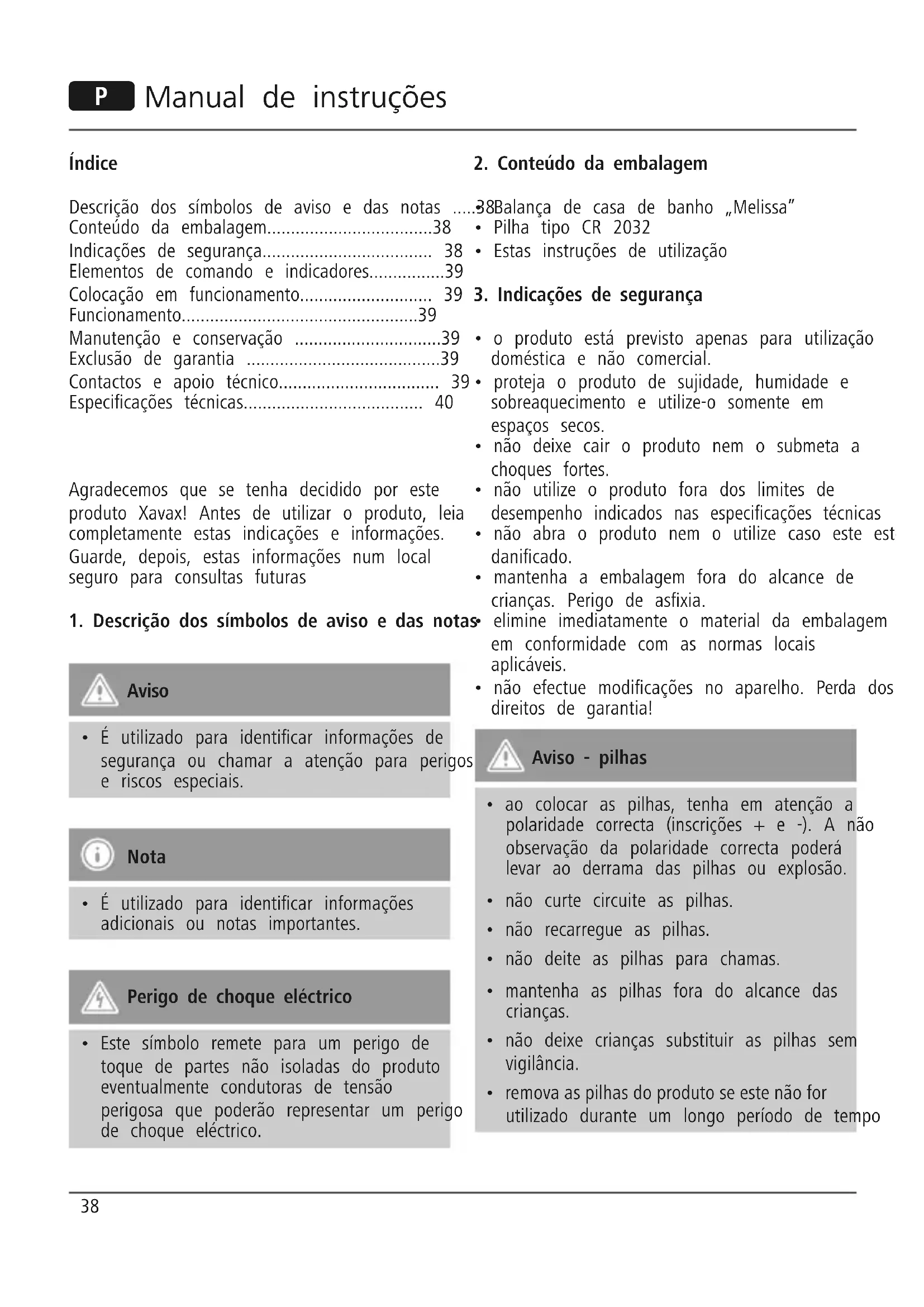 - Indicações de segurança p. 38