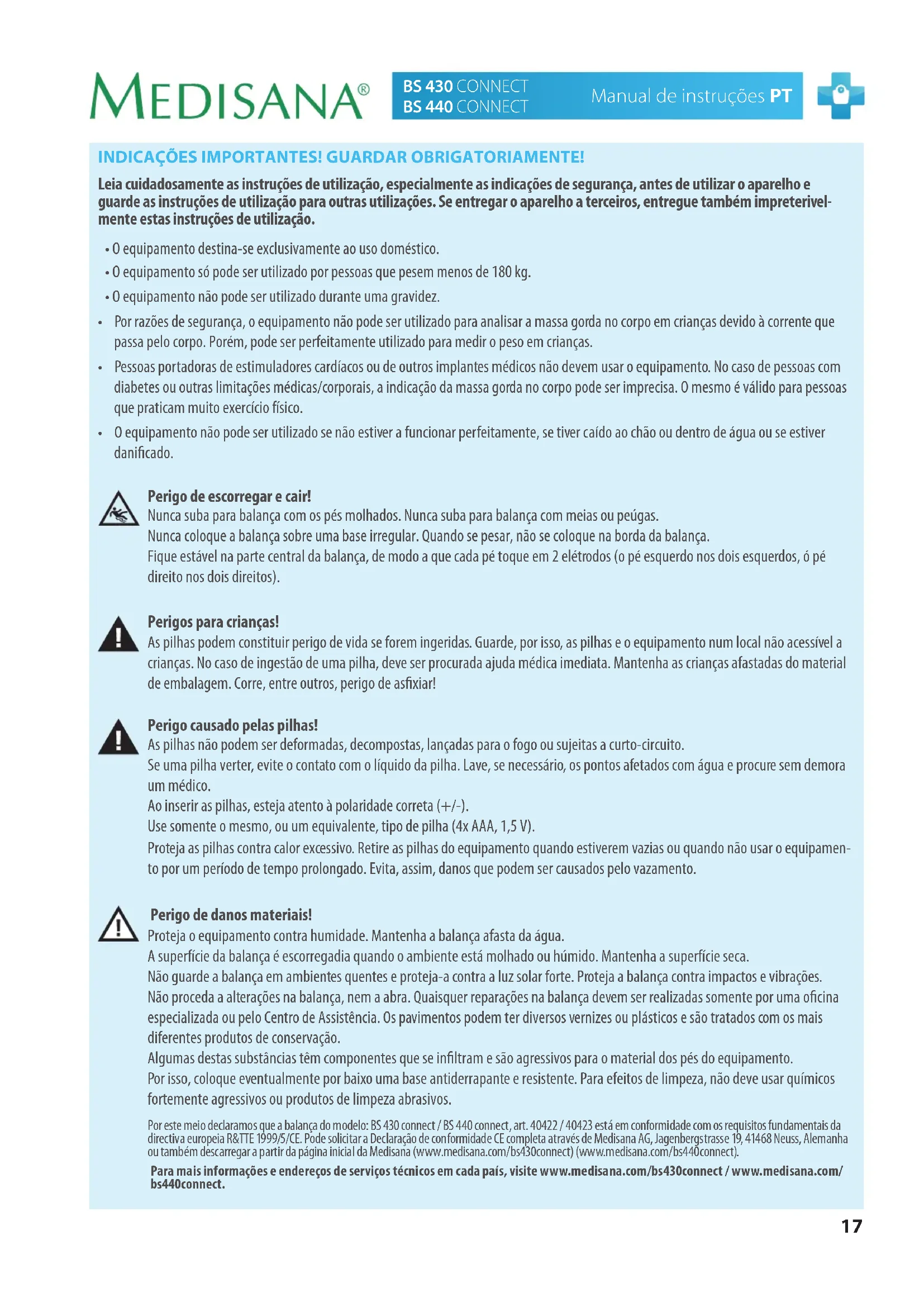 - O equipamento não pode ser utilizado se não estiver a funcionar perfeitamente, se tiver caído ao chão ou dentro de água ou se estiver danicado. Perigo de escorregar e cair! Nunca suba para balança com os pés molhados. Nunca suba para balança com meias ou peúgas. Nunca coloque a balança sobre uma base irregular. Quando se pesar, não se coloque na borda da balança. Fique estável na parte central da balança, de modo a que cada pé toque em 2 elétrodos (o pé esquerdo nos dois esquerdos, ó pé direito nos dois direitos). Perigos para crianças! As pilhas podem constituir perigo de vida se forem ingeridas. Guarde, por isso, as pilhas e o equipamento num local não acessível a crianças. No caso de ingestão de uma pilha, deve ser procurada ajuda médica imediata. Mantenha as crianças afastadas do material de embalagem. Corre, entre outros, perigo de asxiar! Perigo causado pelas pilhas! As pilhas não podem ser deformadas, decompostas, lançadas para o fogo ou sujeitas a curto-circuito. Se uma pilha verter, evite o contato com o líquido da pilha. Lave, se necessário, os pontos afetados com água e procure sem demora um médico. Ao inserir as pilhas, esteja atento à polaridade correta (+/-). Use somente o mesmo, ou um equivalente, tipo de pilha (4x AAA, 1,5 V). Proteja as pilhas contra calor excessivo. Retire as pilhas do equipamento quando estiverem vazias ou quando não usar o equipamen- to por um período de tempo prolongado. Evita, assim, danos que podem ser causados pelo vazamento. Perigo de danos materiais! Proteja o equipamento contra humidade. Mantenha a balança afasta da água. A superfície da balança é escorregadia quando o ambiente está molhado ou húmido. Mantenha a superfície seca. Não guarde a balança em ambientes quentes e proteja-a contra a luz solar forte. Proteja a balança contra impactos e vibrações. Não proceda a alterações na balança, nem a abra. Quaisquer reparações na balança devem ser realizadas somente por uma ocina especializada ou pelo Centro de Assistência. Os pavimentos podem ter diversos vernizes ou plásticos e são tratados com os mais diferentes produtos de conservação. Algumas destas substâncias têm componentes que se inltram e são agressivos para o material dos pés do equipamento. Por isso, coloque eventualmente por baixo uma base antiderrapante e resistente. Para efeitos de limpeza, não deve usar químicos fortemente agressivos ou produtos de limpeza abrasivos. Por este meio declaramos que a balança do modelo: BS 430 connect / BS 440 connect, art. 40422 / 40423 está em conformidade com os requisitos fundamentais da directiva europeia R&TTE 1999/5/CE. Pode solicitar a Declaração de conformidade CE completa através de Medisana AG, Jagenbergstrasse 19, 41468 Neuss, Alemanha ou também descarregar a partir da página inicial da Medisana (www.medisana.com/bs430connect) (www.medisana.com/bs440connect). Para mais informações e endereços de serviços técnicos em cada país, visite www.medisana.com/bs430connect / www.medisana.com/ bs440connect.18 Bluetooth Devices General Bluetooth