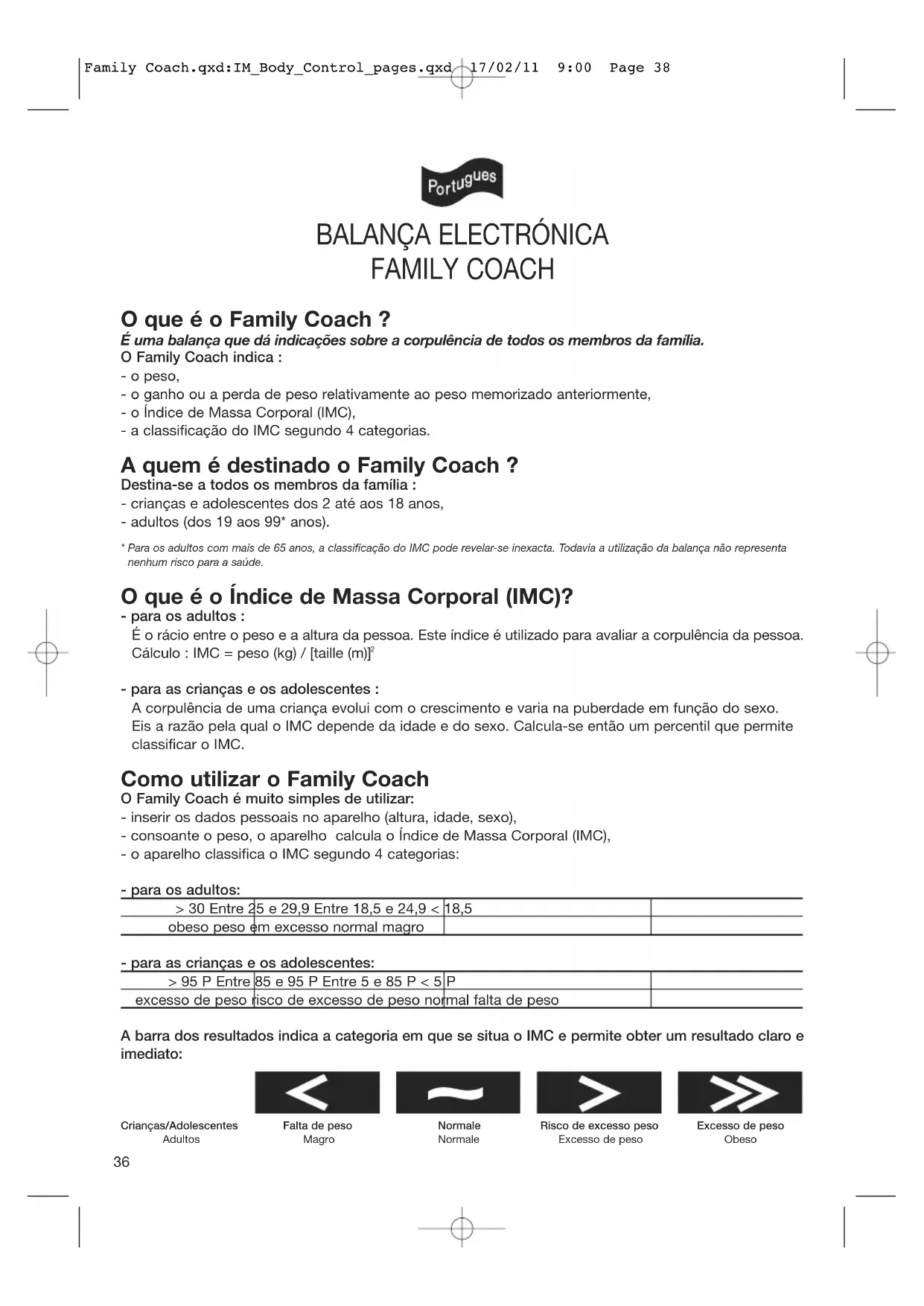 B.1 Indicações dos resultados para um adulto O ecrã apresenta primeiro o peso e depois o IMC. O pictograma na parte inferior do ecrã indica a categoria em que se situa o IMC. B.2 Indicações dos resultados para crianças e adolescentes O ecrã apresenta primeiro o peso, depois o IMC e finalmente o percentil. O pictograma na parte inferior do ecrã indica a categoria em que se situa o percentil. Family Coach.qxd:IM_Body_Control_pages.qxd 17/02/11 9:00 Page 41