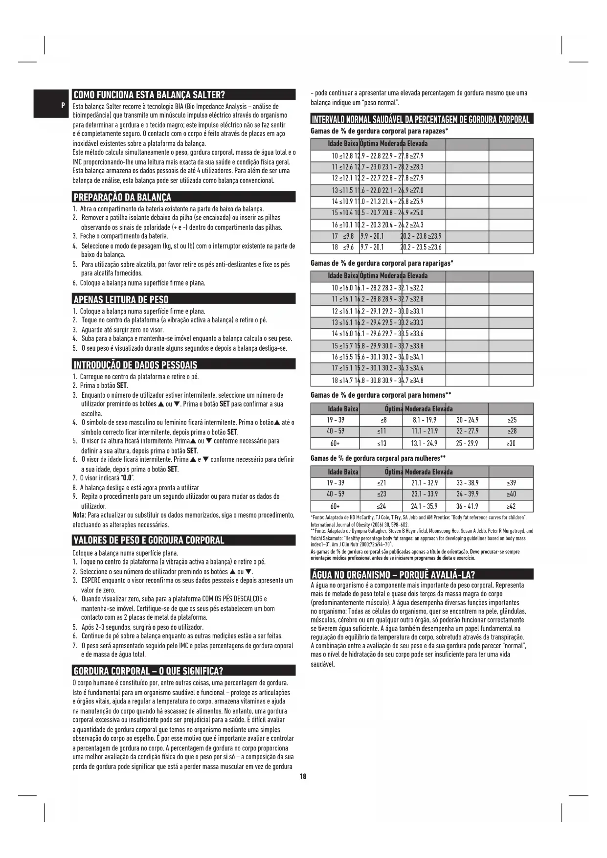 Exactamente, como é que a minha gordura corporal e água no organismo estão a ser avaliadas? Esta balança Salter utiliza um método de medição conhecido como Análise da Impedância Bioeléctrica (BIA). É enviado um impulso mínimo através do corpo, que passa pelos pés e pelas pernas. Esta corrente flui facilmente pelo tecido muscular magro, que é rico em teor de fluidos, mas tem dificuldade para fluir pela gordura. Por conseguinte, ao avaliar a impedância do seu organismo (i.e., a sua resistência à corrente), é possível determinar-se a quantidade de músculo. Com base nessa medição, é possível fazer uma estimativa da quantidade de gordura e de água. Qual é o valor da corrente que passa pelo meu corpo quando se efectua uma medição? É seguro? A corrente é inferior a 1mA, o que é um valor ínfimo e completamente seguro. A corrente não se sente. No entanto, convém salientar que, como medida de precaução para não danificar o dispositivo, este equipamento não deve ser utilizado por pessoas que tenham algum equipamento médico electrónico interno, como por exemplo um pacemaker. Se eu avaliar a minha gordura corporal e a água a horas diferentes durante o dia, os valores podem apresentar variações significativas. Qual o valor correcto? Os valores da sua percentagem de gordura corporal variam com o teor de água no organismo, que sofre variações ao longo do dia. Não há uma hora certa ou errada para efectuar uma avaliação, mas recomendamos que a faça a uma hora regular em que considerar que o seu organismo está normalmente hidratado. Evite efectuar avaliações depois de tomar banho ou ir à sauna, após exercício intenso, ou no período de 1-2 horas depois de ingerir grandes quantidades de água ou das refeições. Um amigo tem um analisador de gordura corporal de outro fabricante. Quando o utilizei, verifiquei que eu tinha um valor de gordura corporal diferente. Qual é a explicação? Analisadores de gordura corporal diferentes efectuam avaliações em diferentes partes do organismo e utilizam algoritmos matemáticos diferentes para calcular a percentagem de gordura corporal. O melhor conselho é não fazer comparações entre equipamentos, mas antes utilizar sempre o mesmo equipamento para controlar qualquer alteração. Como é que interpreto os meus valores de gordura corporal e de percentagem de água no organismo? Consulte as tabelas de gordura corporal e de água no organismo que acompanham o equipamento. Essas tabelas ajudam-no a perceber se os valores da sua gordura corporal e água no organismo se enquadram numa categoria saudável (relativamente à sua idade e sexo). Como devo proceder se os meus valores de gordura corporal forem muito “altos”? Uma dieta sensata, ingestão de líquidos e um programa de exercício físico podem reduzir a sua percentagem de gordura corporal. Deve procurar-se sempre orientação médica profissional antes de se iniciar um programa com estas características. Por que motivo é que os limites de percentagem de gordura corporal são diferentes para homens e mulheres? É natural que as mulheres tenham uma maior percentagem de gordura do que os homens, pois a constituição do corpo é diferente, estando preparado para a gravidez, amamentação, etc. Como devo proceder se os meus valores de percentagem de água forem “baixos”? Certifique-se de que bebe água suficiente com regularidade e esforce-se por integrar a sua percentagem de gordura no limite saudável. Por que motivo devo evitar a utilização da Balança de Análise Corporal Salter durante a gravidez? Durante a gravidez, a composição do organismo das mulheres sofre consideráveis alterações para suportar o feto em desenvolvimento. Nestas circunstâncias, os valores da percentagem de gordura corporal podem ser pouco precisos e induzir em erro. Por conseguinte, as mulheres grávidas deverão utilizar apenas a função de peso. RECOMENDAÇÕES DE UTILIZAÇÃO E CUIDADOS