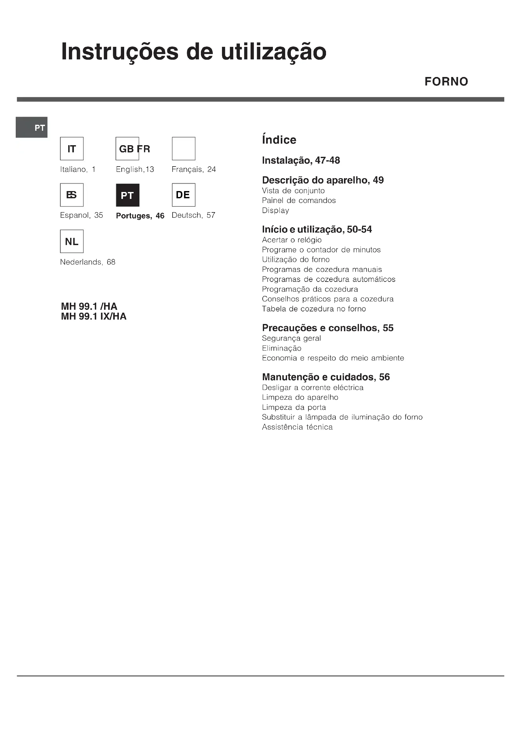 FORNO MH 99.1 /HA MH 99.1 IX/HA Índice Instalação, 47-48 Descrição do aparelho, 49 Vista de conjunto Painel de comandos Display Início e utilização, 50-54 Acertar o relógio Programe o contador de minutos Utilização do forno Programas de cozedura manuais Programas de cozedura automáticos Programação da cozedura Conselhos práticos para a cozedura Tabela de cozedura no forno Precauções e conselhos, 55 Segurança geral Eliminação Economia e respeito do meio ambiente Manutenção e cuidados, 56 Desligar a corrente eléctrica Limpeza do aparelho Limpeza da porta Substituir a lâmpada de iluminação do forno Assistência técnica Instruções de utilização Italiano, 1 Portuges, 46