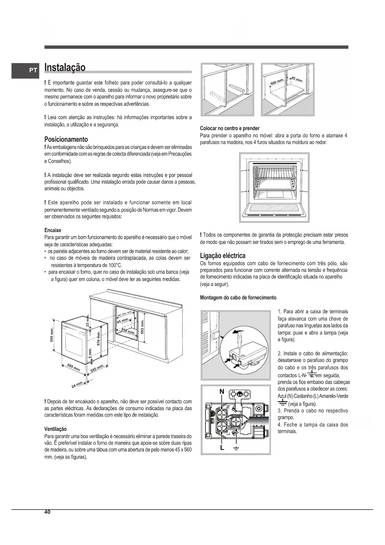 - para encaixar o forno, quer no caso de instalação sob uma banca (veja a gura) quer em coluna, o móvel deve ter as seguintes medidas: 595 mm. 595 mm. 24 mm. 545 mm.5 mm.576 mm.23 mm.593 mm.45 mm.558 mm. 547 mm. min. ! Depois de ter encaixado o aparelho, não deve ser possível contacto com as partes eléctricas. As declarações de consumo indicadas na placa das características foram medidas com este tipo de instalação. Ventilação Para garantir uma boa ventilação é necessário eliminar a parede traseira do vão. É preferível instalar o forno de maneira que apoie-se sobre duas ripas de madeira, ou sobre uma tábua com uma abertura de pelo menos 45 x 560 mm. (veja as guras). 560 mm. 45 mm. Colocar no centro e prender Para prender o aparelho no móvel: abra a porta do forno e atarraxe 4 parafusos na madeira, nos 4 furos situados na moldura ao redor. ! Todos os componentes de garantia da protecção precisam estar presos de modo que não possam ser tirados sem o emprego de uma ferramenta. Ligação eléctrica Os fornos equipados com cabo de fornecimento com três pólo, são preparados para funcionar com corrente alternada na tensão e frequência de fornecimento indicadas na placa de identicação situada no aparelho (veja a seguir). Montagem do cabo de fornecimento