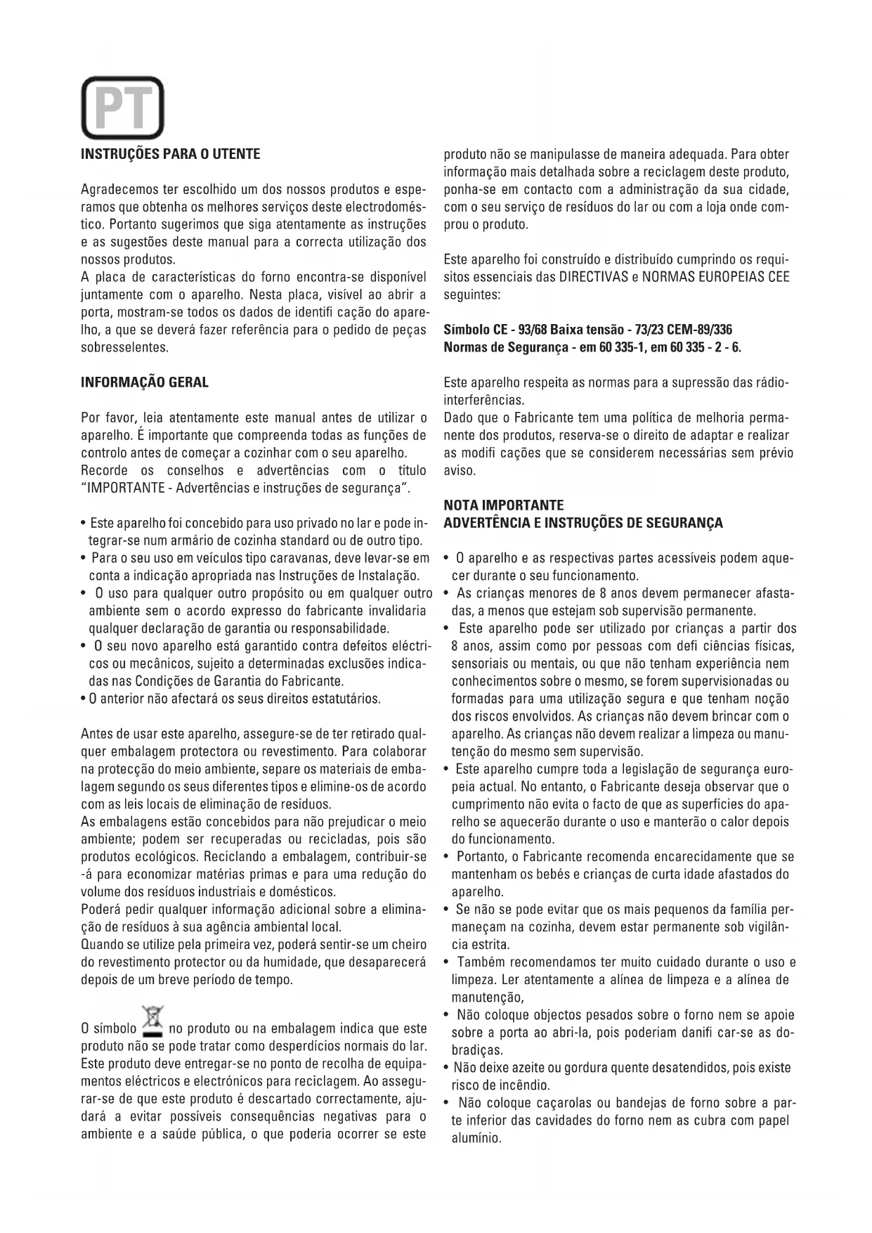 Este Manual do Utente deve conservar-se para sua consulta futura e uso por parte de uma pessoa que talvez não esteja familiarizada com o aparelho. Antes de usar o forno, limpar esmeradamente o interior do mesmo com sabão não abrasivo e água morna. Introduzir a grelha e a bandeja nas suas respectivas guias. Uma vez fi na- lizada a operação, pôr o forno à temperatura máxima durante 20 minutos aproximadamente para eliminar qualquer resíduo de gordura, azeite ou resinas de fabrico que poderiam causar cheiros desagradáveis durante a cocção. ATENÇÃO: Pode ocorrer que nesta primeira cocção saia um pouco de fumo ou cause cheiros desagradáveis. Nesse caso ventilar a casa adequadamente até que termine este primeiro funcionamento. Uma vez efectuada esta simples operação, o forno estará pronto para realizar a sua primeira cocção. Este aparelho é de uso exclusivamente doméstico. Utilizar o forno unicamente para cozinhar alimentos.