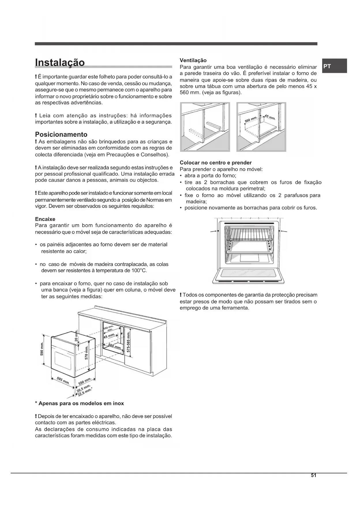 Instalação ! É importante guardar este folheto para poder consultá-lo a qualquer momento. No caso de venda, cessão ou mudança, assegure-se que o mesmo permanece com o aparelho para informar o novo proprietário sobre o funcionamento e sobre as respectivas advertências. ! Leia com atenção as instruções: há informações importantes sobre a instalação, a utilização e a segurança. Posicionamento ! As embalagens não são brinquedos para as crianças e devem ser eliminadas em conformidade com as regras de colecta diferenciada (veja em Precauções e Conselhos). ! A instalação deve ser realizada segundo estas instruções e por pessoal prossional qualicado. Uma instalação errada pode causar danos a pessoas, animais ou objectos. ! Este aparelho pode ser instalado e funcionar somente em local permanentemente ventilado segundo a posição de Normas em vigor. Devem ser observados os seguintes requisitos: Encaixe Para garantir um bom funcionamento do aparelho é necessário que o móvel seja de características adequadas:
