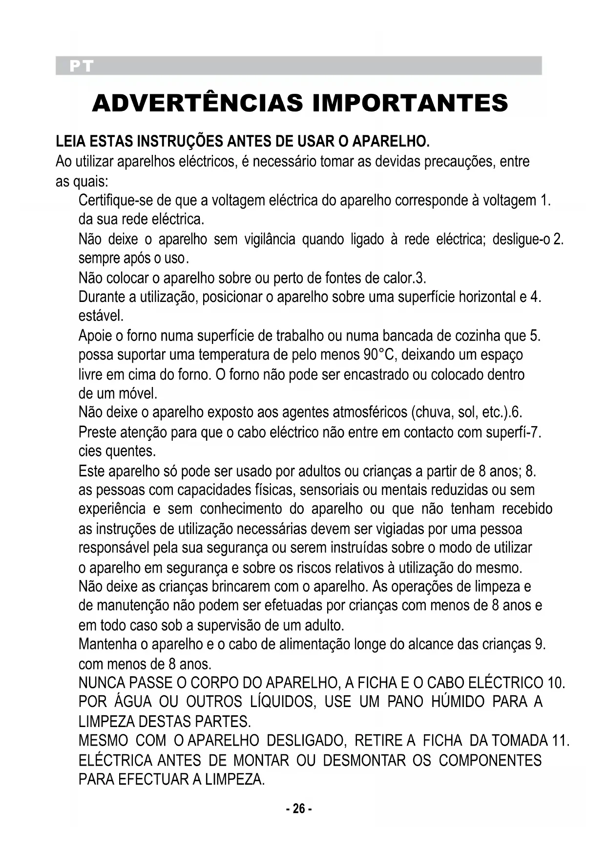 Não colocar o aparelho sobre ou perto de fontes de calor.3. Durante a utilização, posicionar o aparelho sobre uma superfície horizontal e 4. estável. Apoie o forno numa superfície de trabalho ou numa bancada de cozinha que 5. possa suportar uma temperatura de pelo menos 90°C, deixando um espaço livre em cima do forno. O forno não pode ser encastrado ou colocado dentro de um móvel. Não deixe o aparelho exposto aos agentes atmosféricos (chuva, sol, etc.).6. Preste atenção para que o cabo eléctrico não entre em contacto com superfí-7. cies quentes. Este aparelho só pode ser usado por adultos ou crianças a partir de 8 anos; 8. as pessoas com capacidades físicas, sensoriais ou mentais reduzidas ou sem experiência e sem conhecimento do aparelho ou que não tenham recebido as instruções de utilização necessárias devem ser vigiadas por uma pessoa responsável pela sua segurança ou serem instruídas sobre o modo de utilizar o aparelho em segurança e sobre os riscos relativos à utilização do mesmo. Não deixe as crianças brincarem com o aparelho. As operações de limpeza e de manutenção não podem ser efetuadas por crianças com menos de 8 anos e em todo caso sob a supervisão de um adulto. Mantenha o aparelho e o cabo de alimentação longe do alcance das crianças 9. com menos de 8 anos. NUNCA PASSE O CORPO DO APARELHO, A FICHA E O CABO ELÉCTRICO 10. POR ÁGUA OU OUTROS LÍQUIDOS, USE UM PANO HÚMIDO PARA A LIMPEZA DESTAS PARTES. MESMO COM O APARELHO DESLIGADO, RETIRE A FICHA DA TOMADA 11. ELÉCTRICA ANTES DE MONTAR OU DESMONTAR OS COMPONENTES