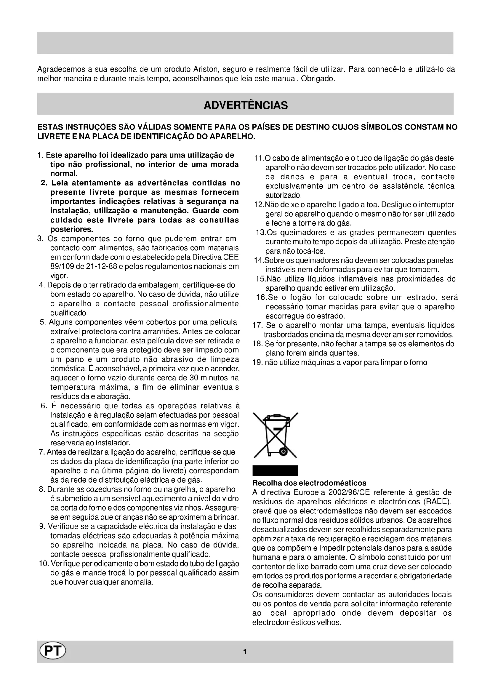 do gás e mande trocá-lo por pessoal qualificado assim que houver qualquer anomalia. ADVERTÊNCIAS ESTAS INSTRUÇÕES SÃO VÁLIDAS SOMENTE PARA OS PAÍSES DE DESTINO CUJOS SÍMBOLOS CONSTAM NO LIVRETE E NA PLACA DE IDENTIFICAÇÃO DO APARELHO. Agradecemos a sua escolha de um produto Ariston, seguro e realmente fácil de utilizar. Para conhecê-lo e utilizá-lo da melhor maneira e durante mais tempo, aconselhamos que leia este manual. Obrigado. 11.O cabo de alimentação e o tubo de ligação do gás deste aparelho não devem ser trocados pelo utilizador. No caso de danos e para a eventual troca, contacte exclusivamente um centro de assistência técnica autorizado. 12.Não deixe o aparelho ligado a toa. Desligue o interruptor geral do aparelho quando o mesmo não for ser utilizado e feche a torneira do gás. 13.Os queimadores e as grades permanecem quentes durante muito tempo depois da utilização. Preste atenção para não tocá-los. 14.Sobre os queimadores não devem ser colocadas panelas instáveis nem deformadas para evitar que tombem. 15.Não utilize líquidos inflamáveis nas proximidades do aparelho quando estiver em utilização. 16.Se o fogão for colocado sobre um estrado, será necessário tomar medidas para evitar que o aparelho escorregue do estrado.
