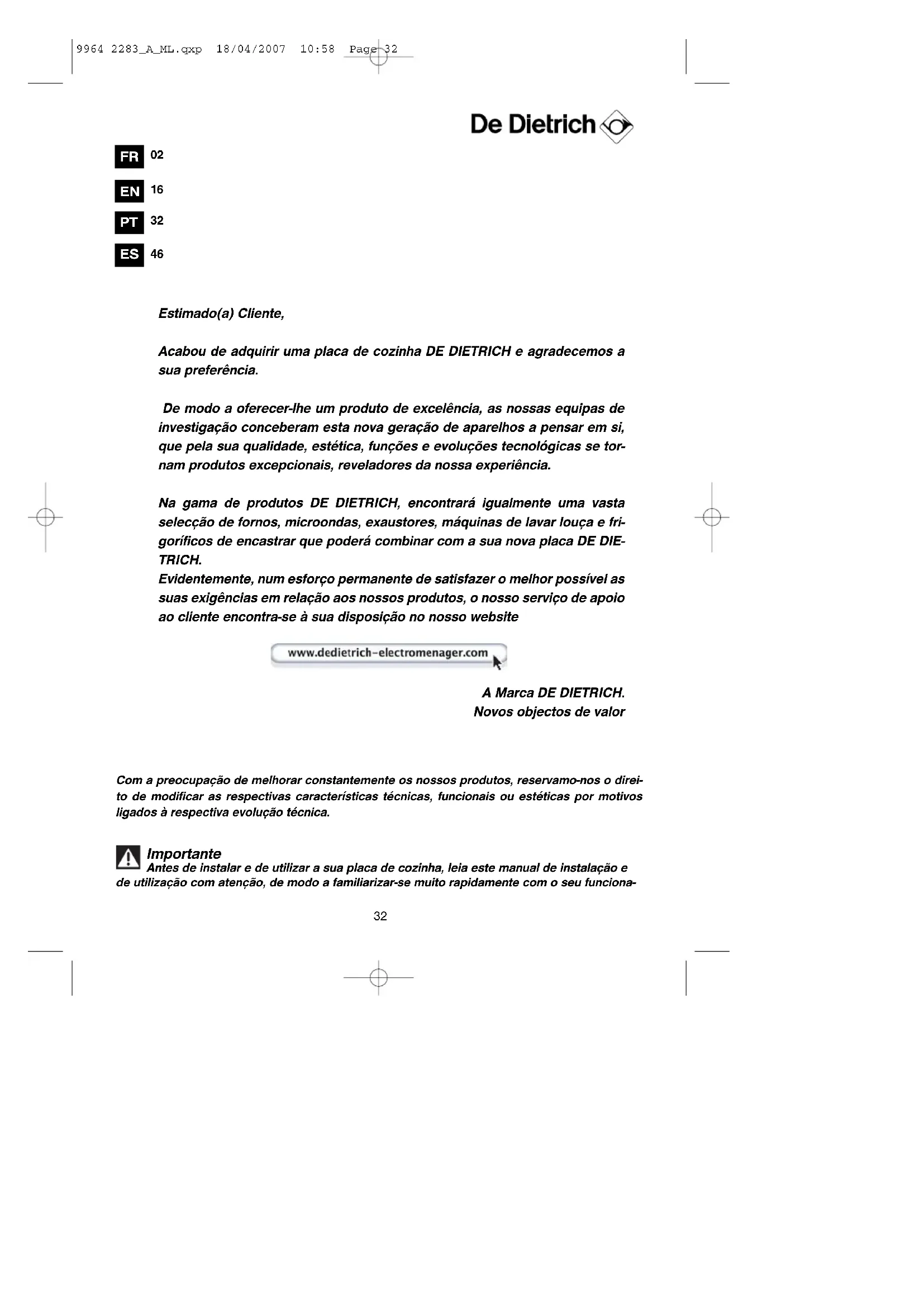 WWAARRRRAANNTTYY CCOONNDDIITTIIOONNSS 9964 2283_A_ML.qxp 18/04/2007 10:58 Page 3031 9964 2283_A_ML.qxp 18/04/2007 10:58 Page 3132 Estimado(a) Cliente, Acabou de adquirir uma placa de cozinha DE DIETRICH e agradecemos a sua preferência. De modo a oferecer-lhe um produto de excelência, as nossas equipas de investigação conceberam esta nova geração de aparelhos a pensar em si, que pela sua qualidade, estética, funções e evoluções tecnológicas se tor- nam produtos excepcionais, reveladores da nossa experiência. Na gama de produtos DE DIETRICH, encontrará igualmente uma vasta selecção de fornos, microondas, exaustores, máquinas de lavar louça e fri- goríficos de encastrar que poderá combinar com a sua nova placa DE DIE- TRICH. Evidentemente, num esforço permanente de satisfazer o melhor possível as suas exigências em relação aos nossos produtos, o nosso serviço de apoio ao cliente encontra-se à sua disposição no nosso website A Marca DE DIETRICH. Novos objectos de valor Com a preocupação de melhorar constantemente os nossos produtos, reservamo-nos o direi- to de modificar as respectivas características técnicas, funcionais ou estéticas por motivos ligados à respectiva evolução técnica. Importante Antes de instalar e de utilizar a sua placa de cozinha, leia este manual de instalação e de utilização com atenção, de modo a familiarizar-se muito rapidamente com o seu funciona-