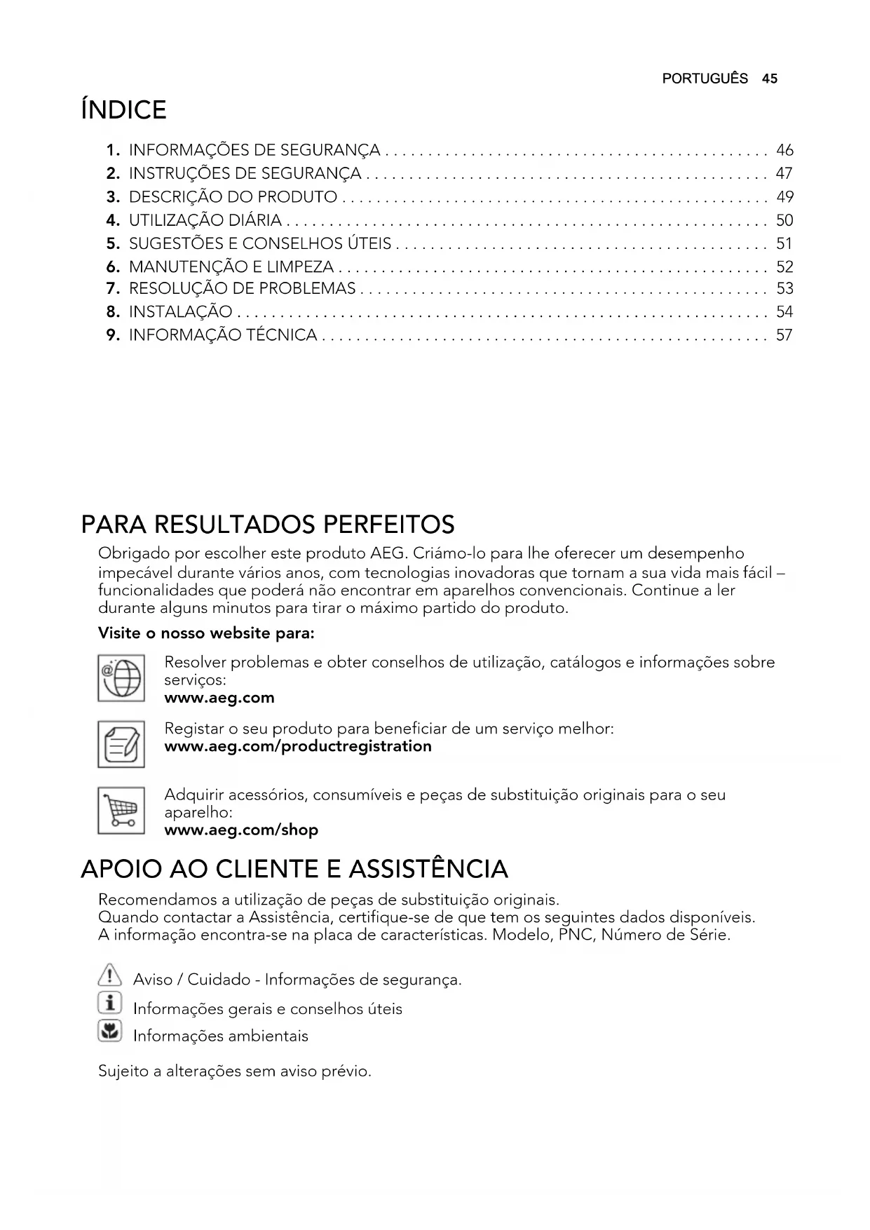 Obrigado por escolher este produto AEG. Criámo-lo para lhe oferecer um desempenho impecável durante vários anos, com tecnologias inovadoras que tornam a sua vida mais fácil – funcionalidades que poderá não encontrar em aparelhos convencionais. Continue a ler durante alguns minutos para tirar o máximo partido do produto. Visite o nosso website para: Resolver problemas e obter conselhos de utilização, catálogos e informações sobre serviços: www.aeg.com Registar o seu produto para beneficiar de um serviço melhor: www.aeg.com/productregistration Adquirir acessórios, consumíveis e peças de substituição originais para o seu aparelho: www.aeg.com/shop