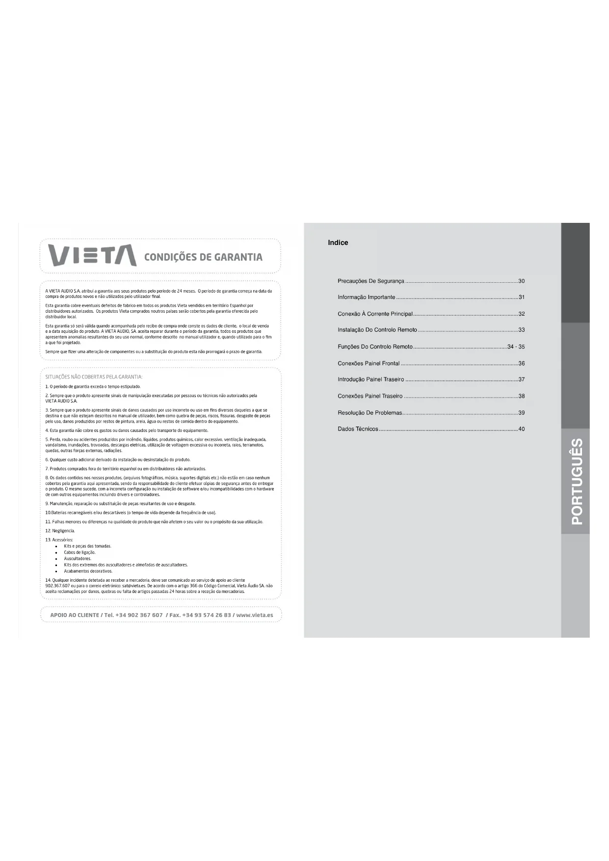Esta garantia cobre eventuals defeitos de fabrico em todos os produtos Vieta vendidos em território Espanhaí por distribuidores autorizados. Os produtos Vieta comprados noutros países serão cobertos pela garantia oferecida pelo distribuidor local.
