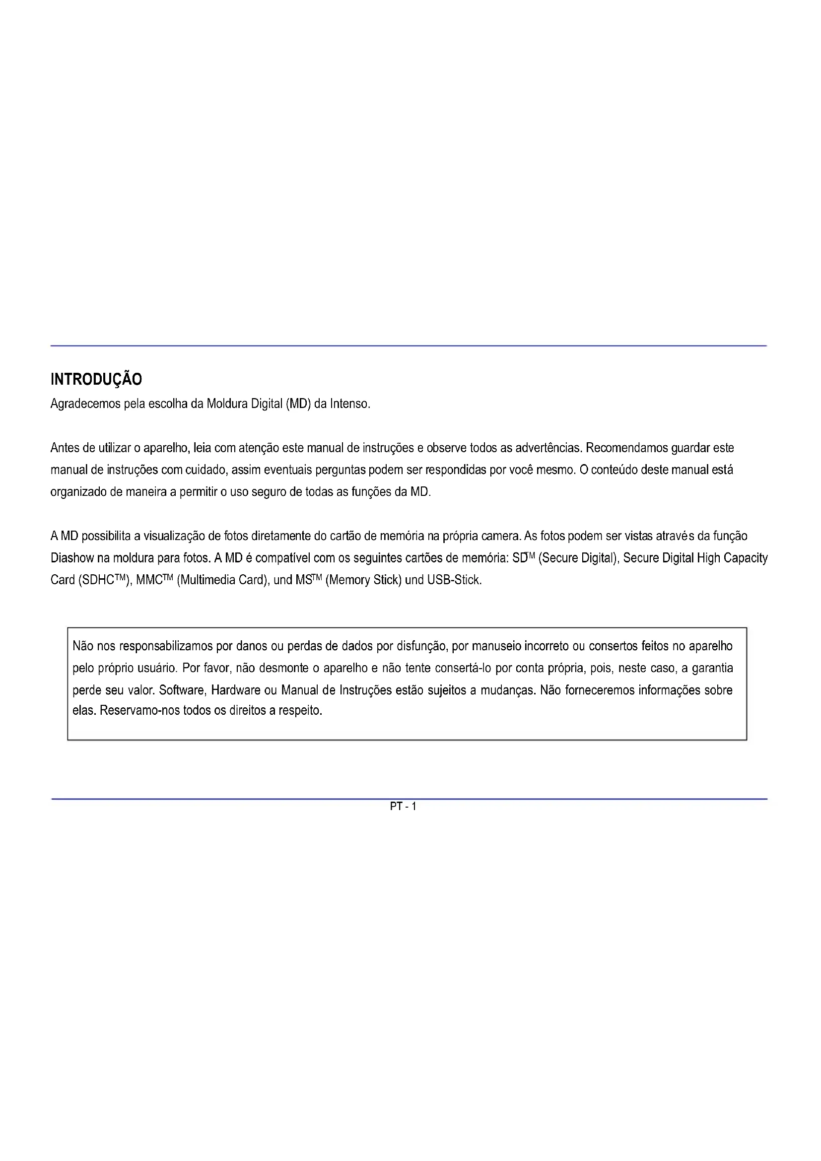 Não nos responsabilizamos por danos ou perdas de dados por disfunção, por manuseio incorreto ou consertos feitos no aparecido ao tempo proprio Usário. Por favor, não desmonte o aparecido e não tente consertá-lo por conta propria, poi, neste caso, a garantia perde seu valor. Software, Hardware ou Manual de Instruções está sujeitos a mudanças. Não forneceremos informações sobre as esas. Reservamo-nos todos os direitos a respeito.