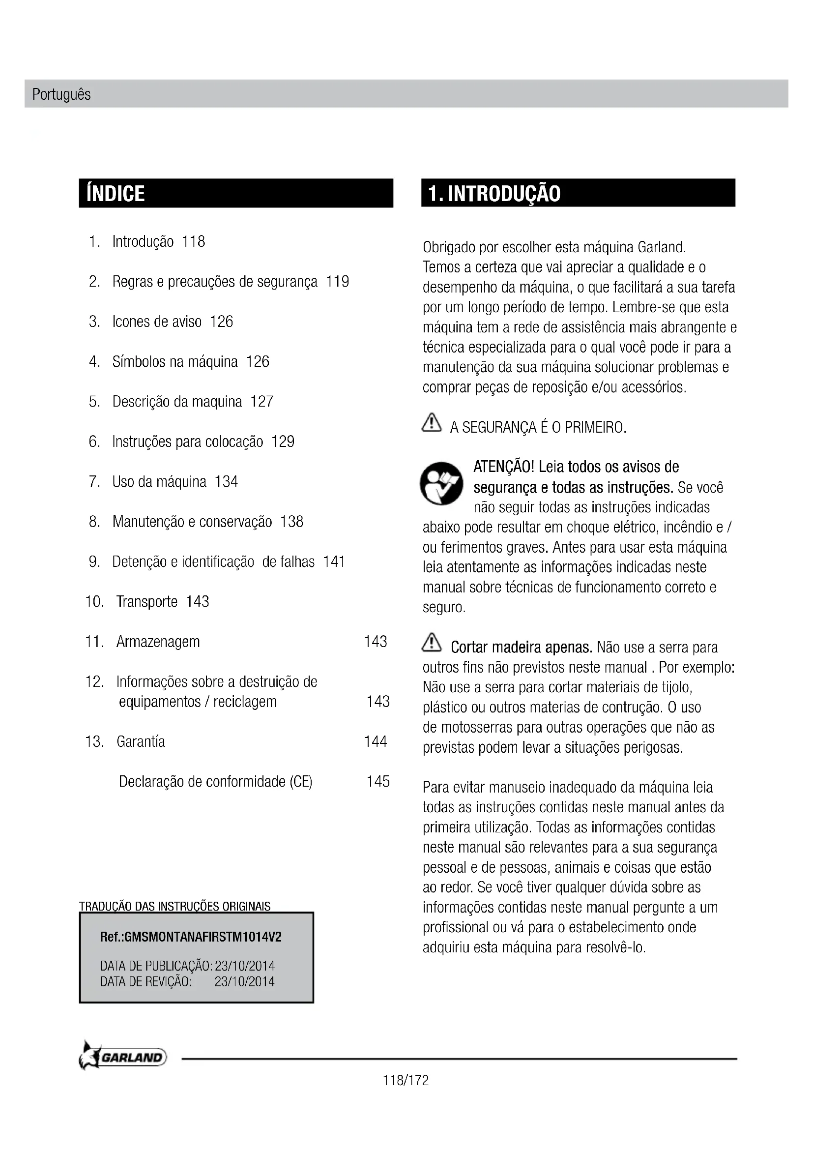 - Defeitos causados por uso Incorrecto, danos provocados por manipulacao realizada por pessoal nao autorizo pela Garland ou uso de peças de substituicao nao originals.