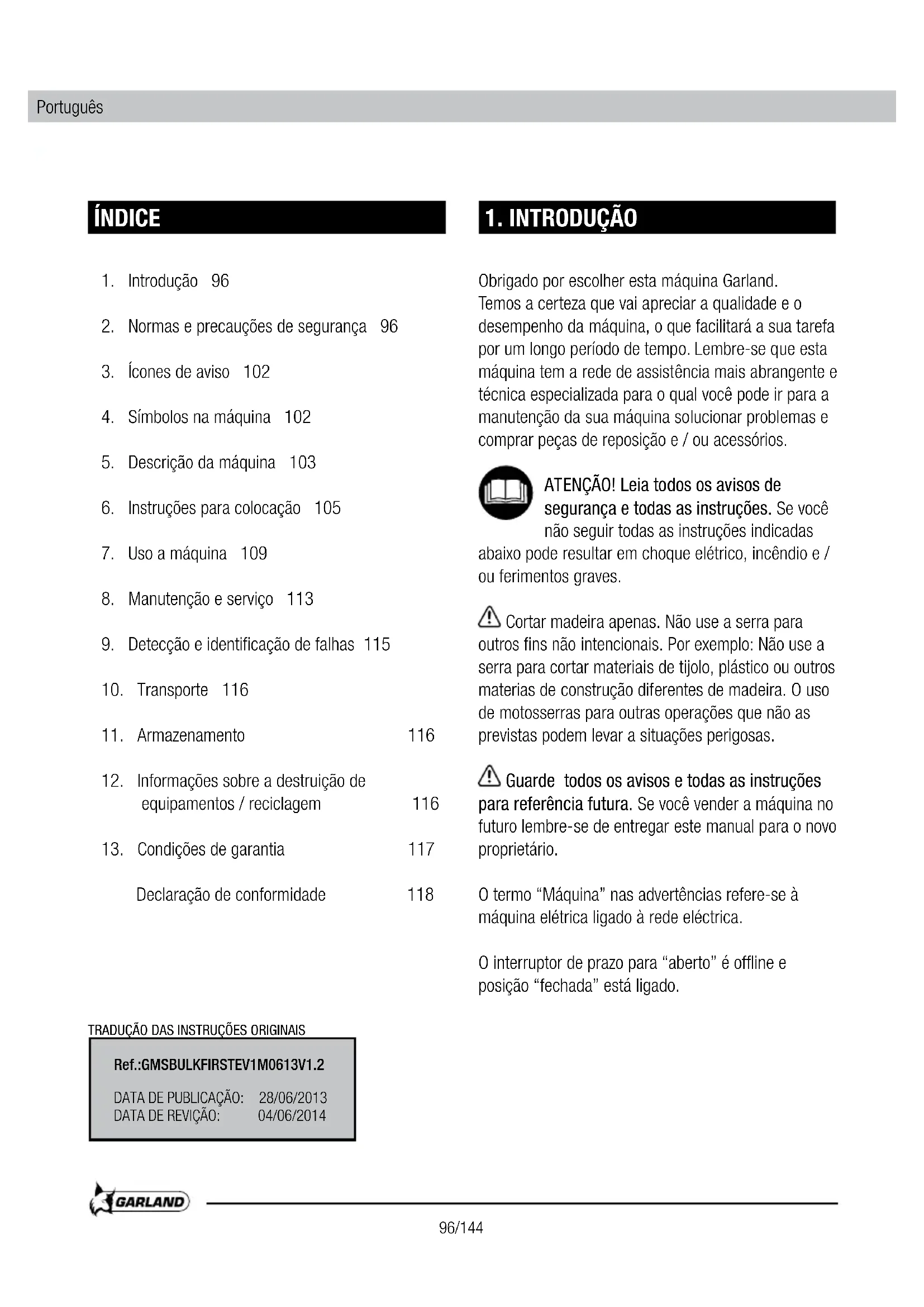 - Normas e precauções de segurança 96