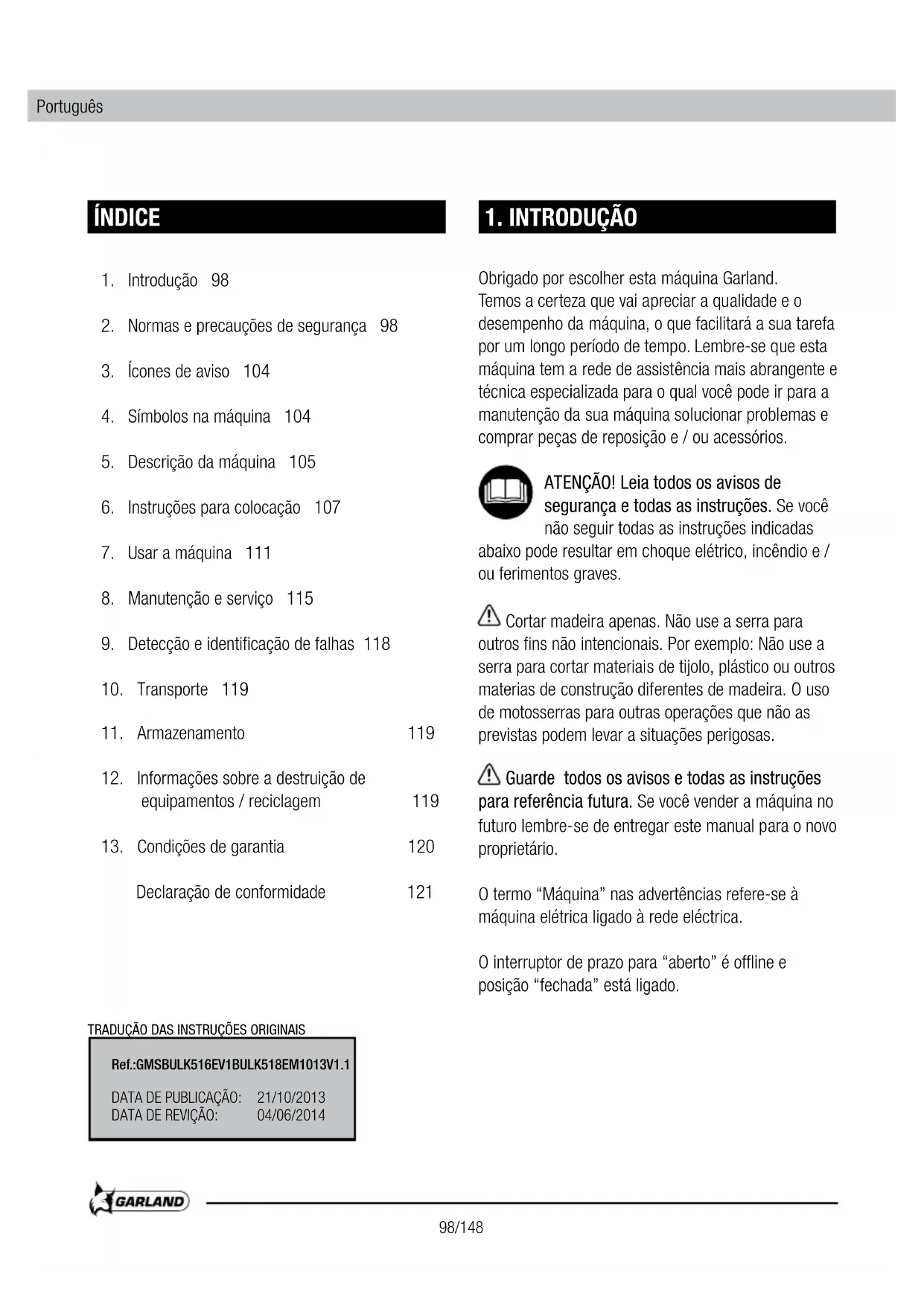 - Defeitos causados por uso Incorrecto, danos provocados por manipulacao realizada por pessoal nao autorizo pela Garland ou uso de peças de substituicao nao originals.