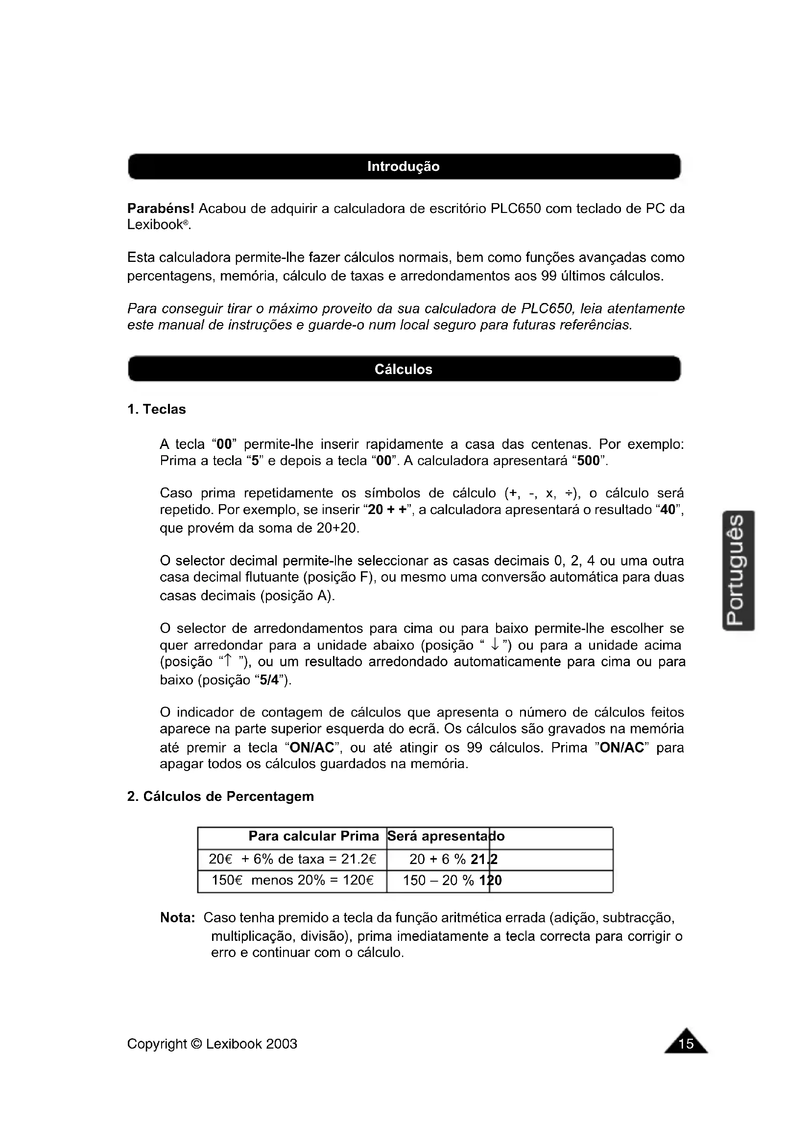 Nota: Caso tenha premido a tecla da função aritmética errada (adição, subtracção, multiplicação, divisão), prima imediatamente a tecla correcta para corrigir o erro e continuar com o cálculo. Para calcular Prima Será apresentado 20€ + 6% de taxa = 21.2€ 20 + 6 % 21.2 150€ menos 20% = 120€ 150 – 20 % 120 Cálculos IntroduçãoCopyright © Lexibook 2003