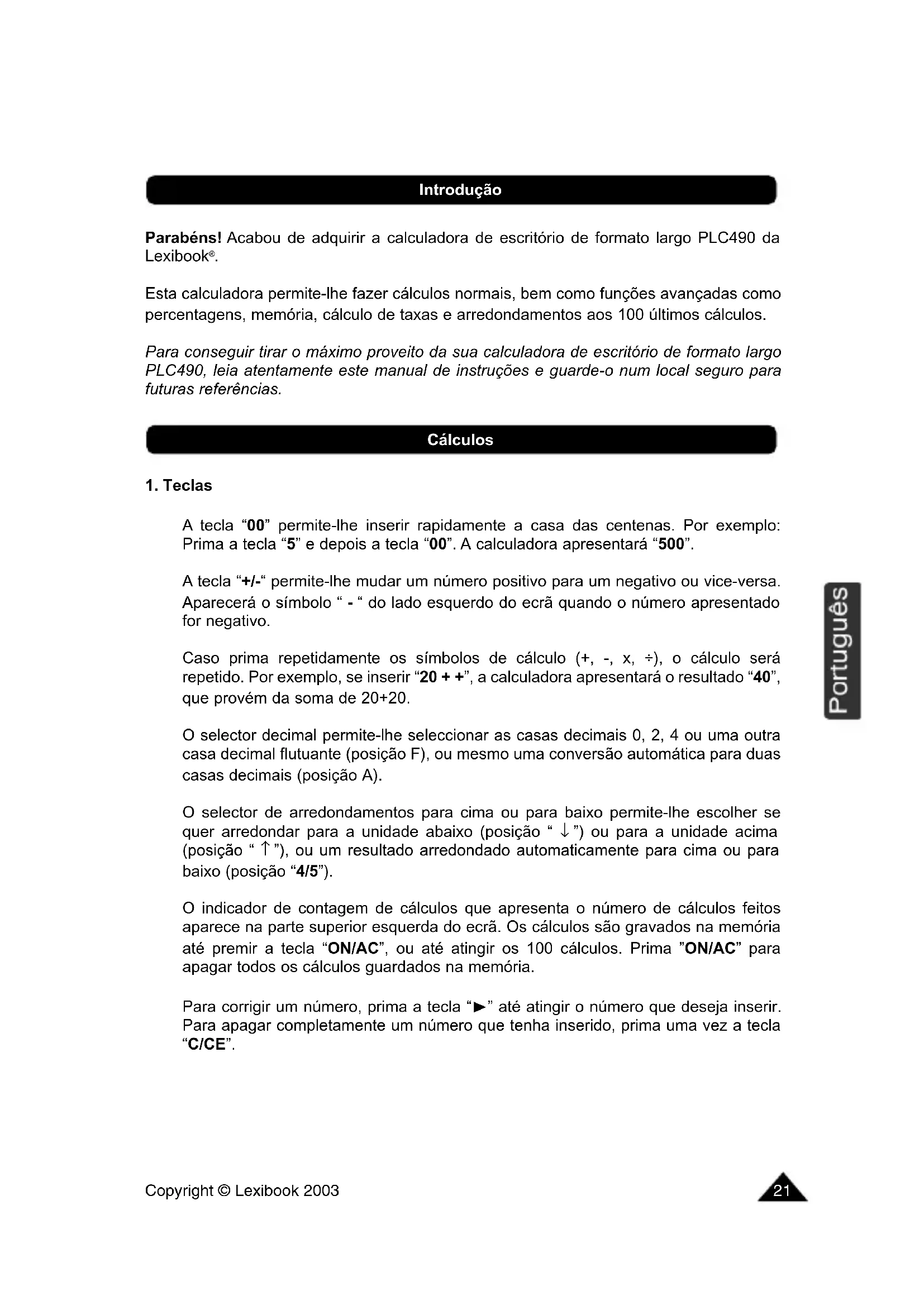 A tecla “00” permite-lhe inserir rapidamente a casa das centenas. Por exemplo: Prima a tecla “5” e depois a tecla “00”. A calculadora apresentará “500”. A tecla “+/-“ permite-lhe mudar um número positivo para um negativo ou vice-versa. Aparecerá o símbolo “ - “ do lado esquerdo do ecrã quando o número apresentado for negativo. Caso prima repetidamente os símbolos de cálculo (+, -, x, ÷), o cálculo será repetido. Por exemplo, se inserir “20 + +”, a calculadora apresentará o resultado “40”, que provém da soma de 20+20. O selector decimal permite-lhe seleccionar as casas decimais 0, 2, 4 ou uma outra casa decimal flutuante (posição F), ou mesmo uma conversão automática para duas casas decimais (posição A). O selector de arredondamentos para cima ou para baixo permite-lhe escolher se quer arredondar para a unidade abaixo (posição “ ↓ ”) ou para a unidade acima (posição “ ↑ ”), ou um resultado arredondado automaticamente para cima ou para baixo (posição “4/5”). O indicador de contagem de cálculos que apresenta o número de cálculos feitos aparece na parte superior esquerda do ecrã. Os cálculos são gravados na memória até premir a tecla “ON/AC”, ou até atingir os 100 cálculos. Prima ”ON/AC” para apagar todos os cálculos guardados na memória. Para corrigir um número, prima a tecla “” até atingir o número que deseja inserir. Para apagar completamente um número que tenha inserido, prima uma vez a tecla “C/CE”. Cálculos IntroduçãoCopyright © Lexibook 2003